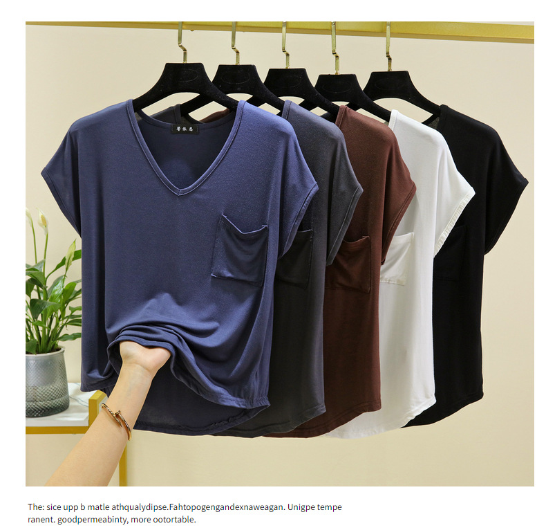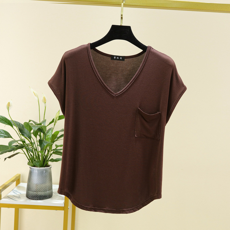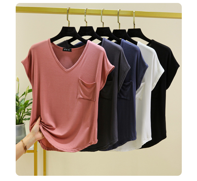 莫代尔打底t恤女夏薄款纯色韩版宽松显瘦胖mm大码V领短袖上衣