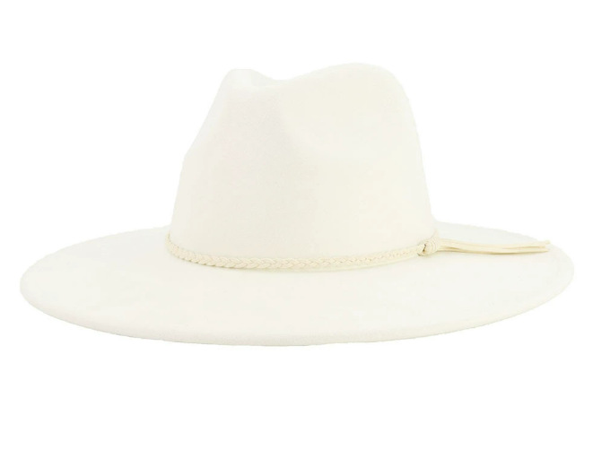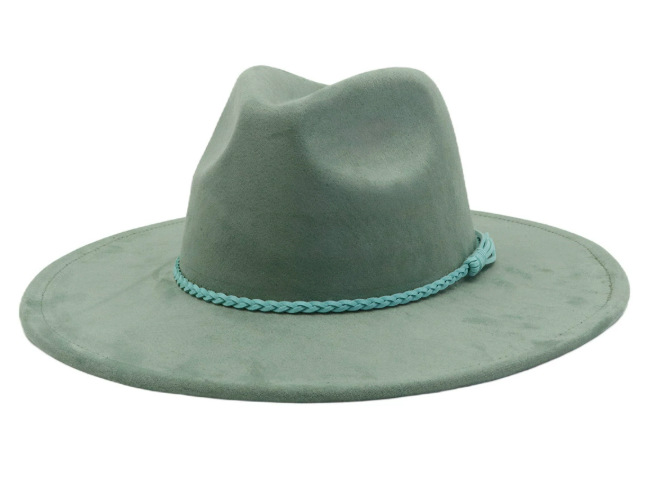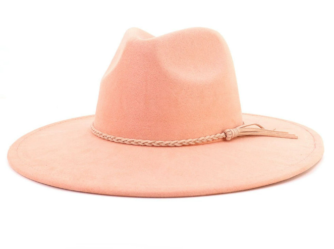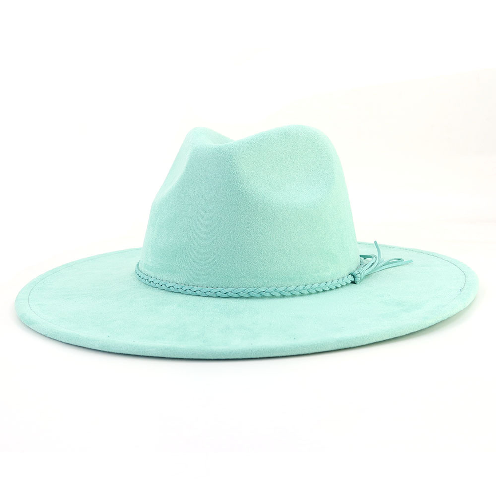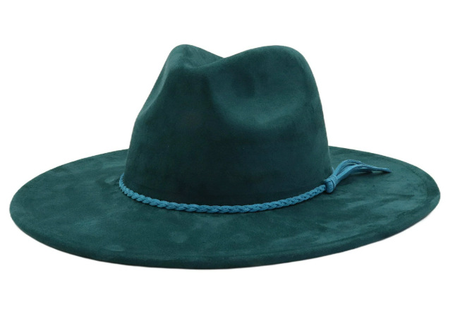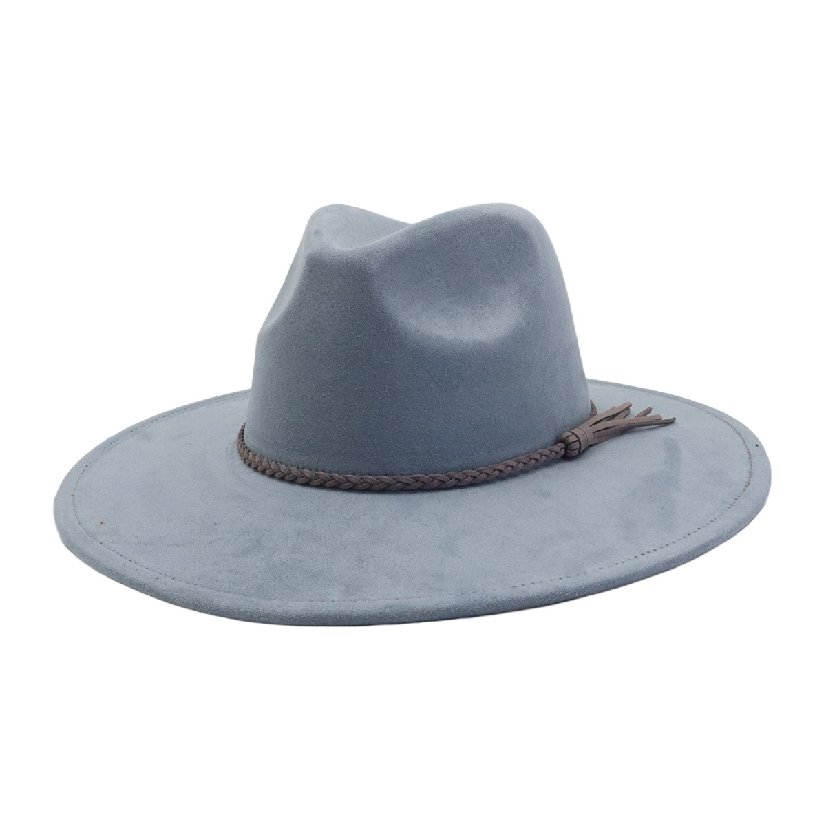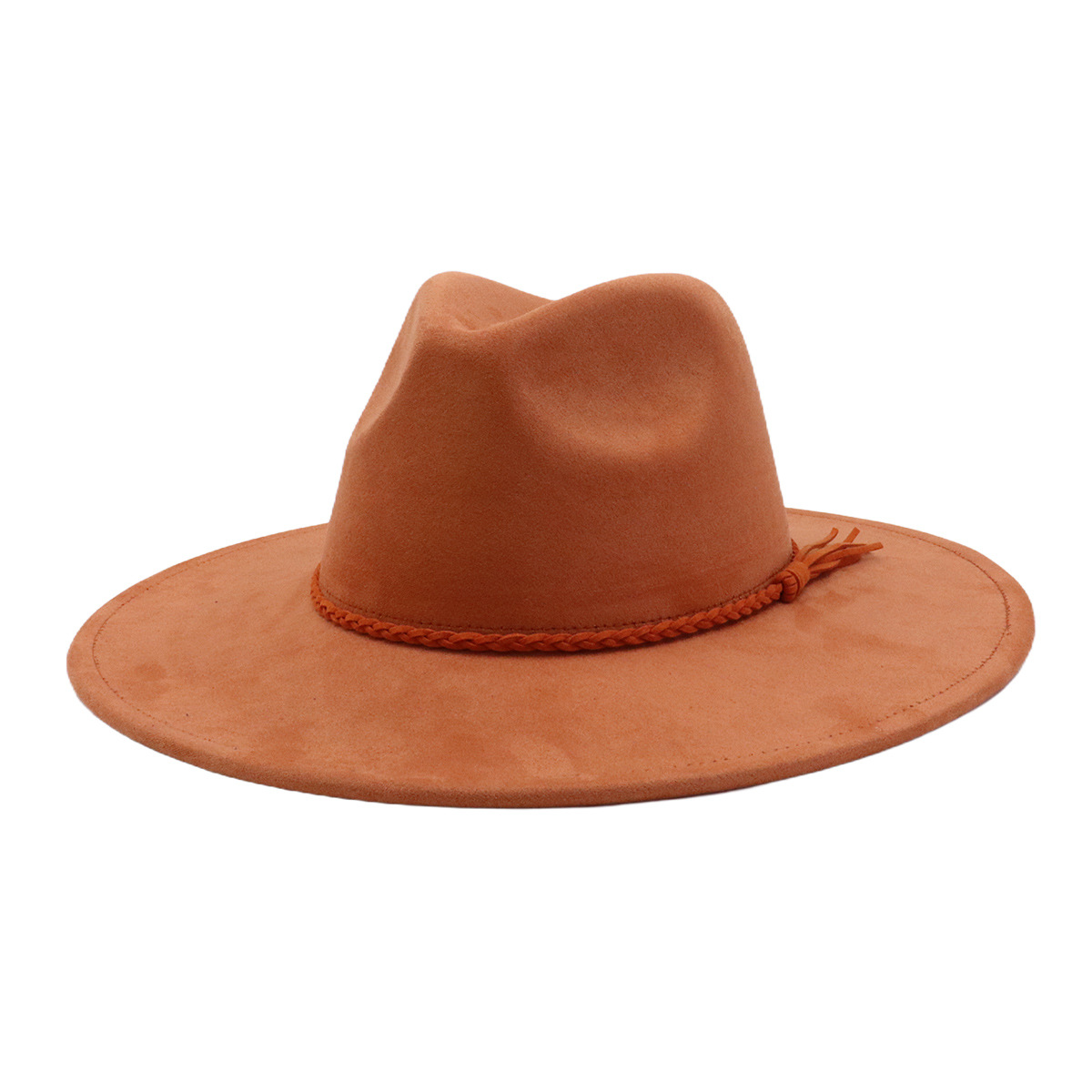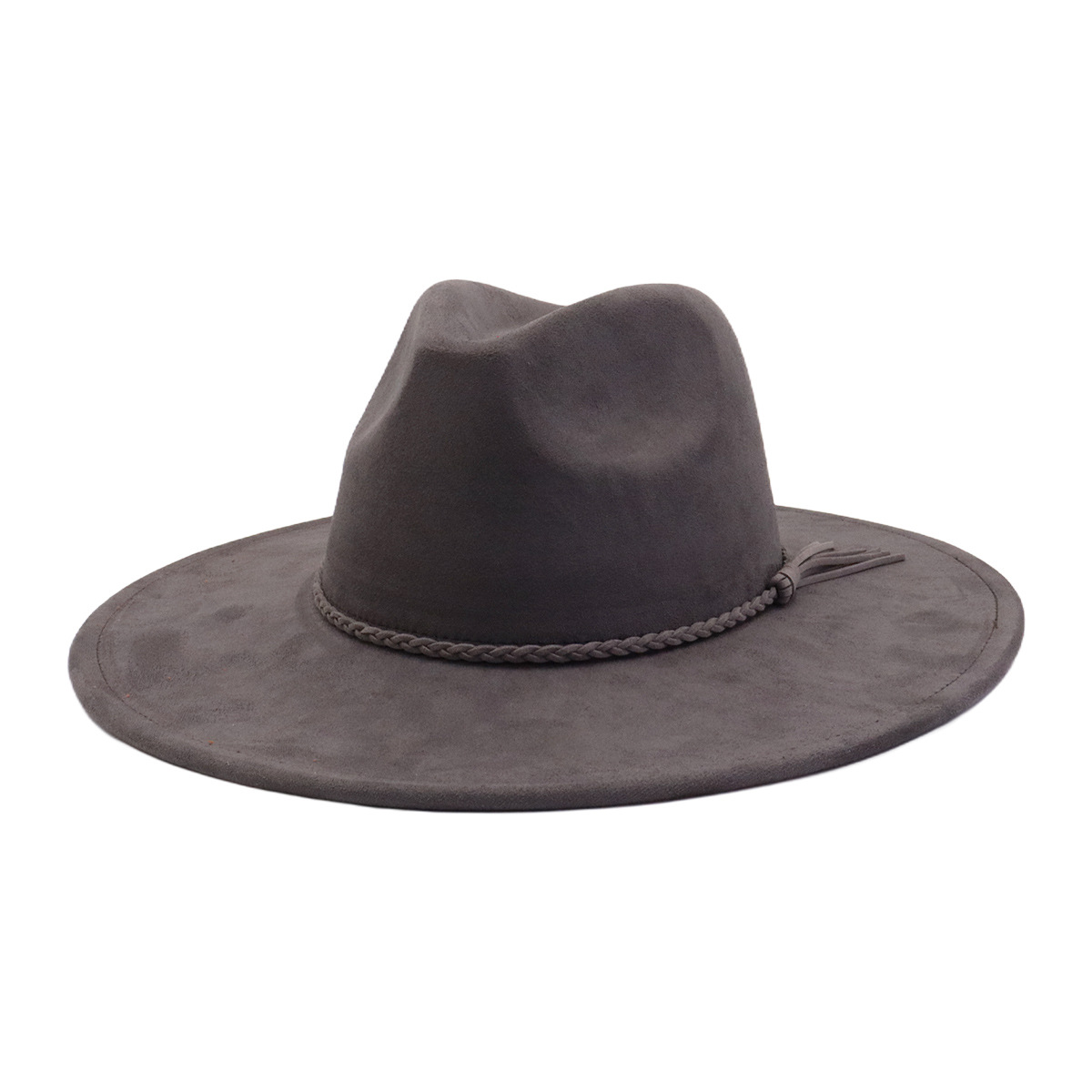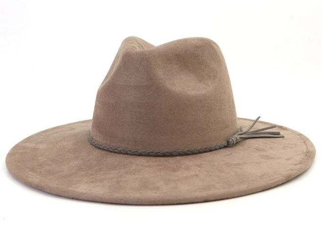 2023年秋冬季跨境新款大沿爵士礼帽女10cm帽檐麂皮桃心顶流苏帽子