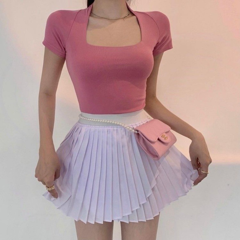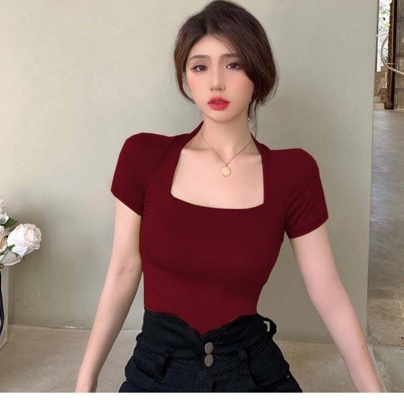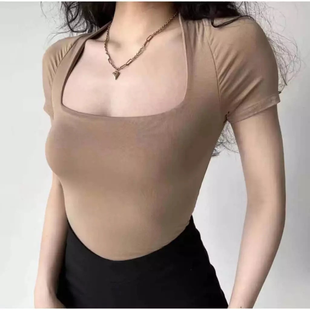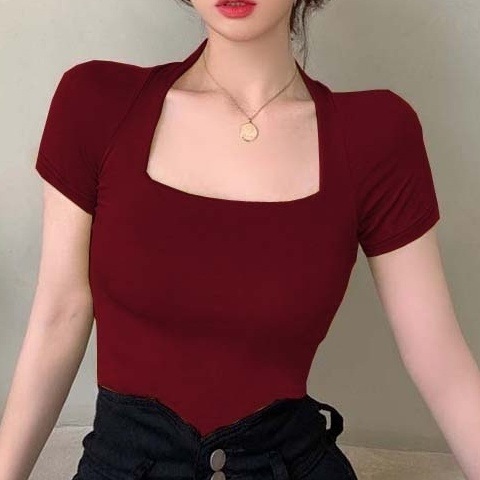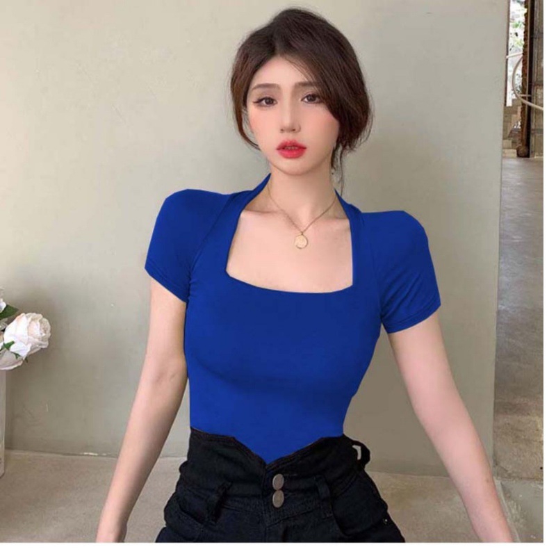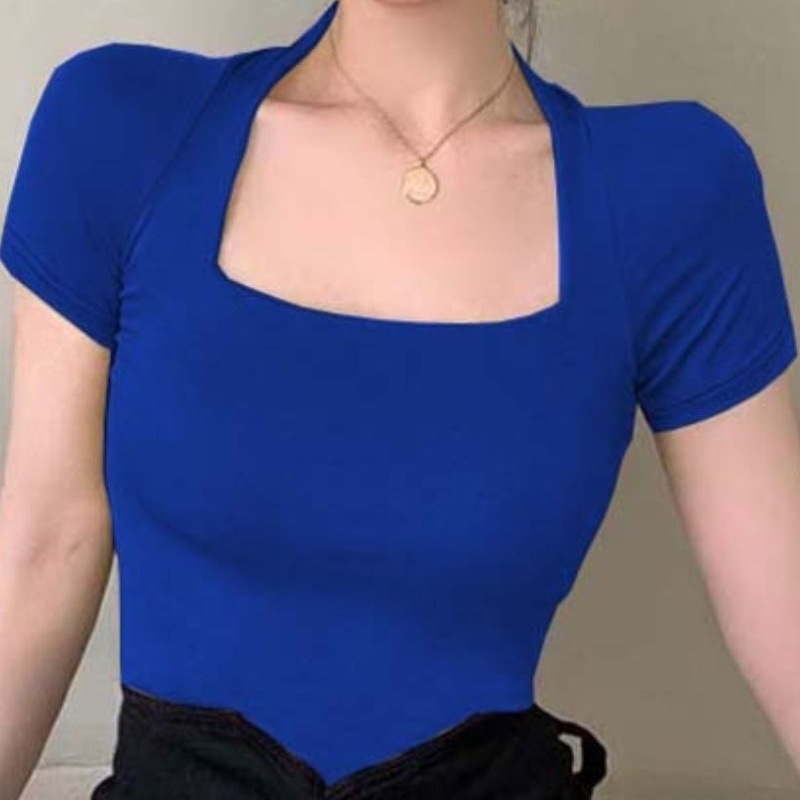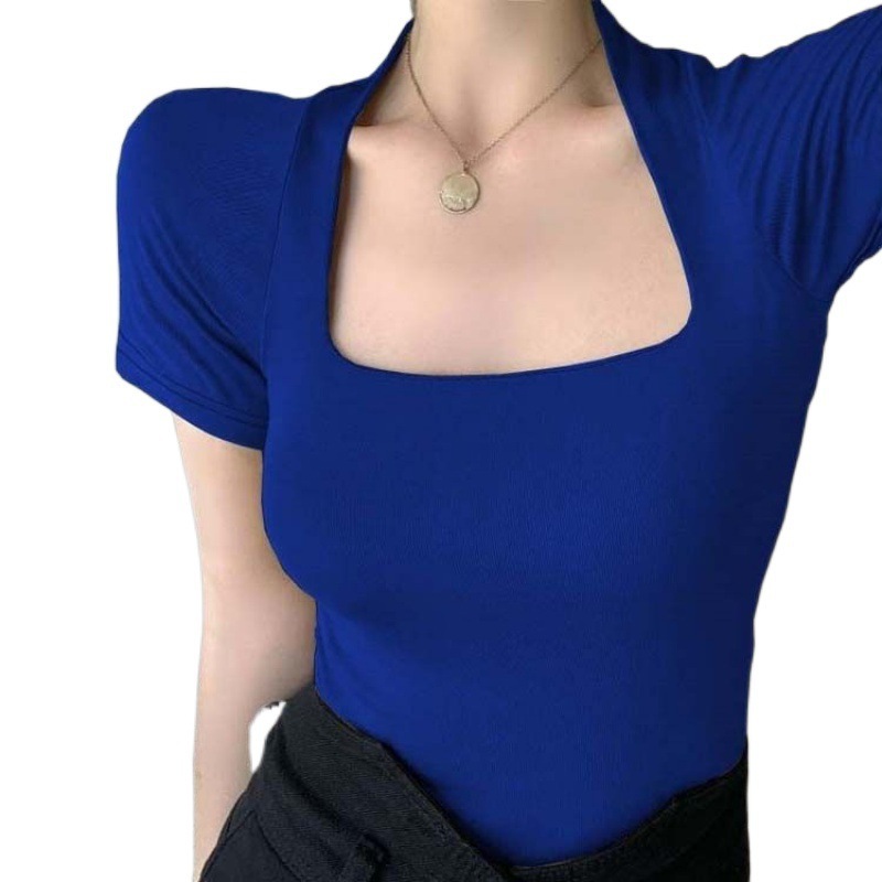 克莱因蓝方领短袖T恤女夏紧身大领口露锁骨法式复古性感半袖上衣