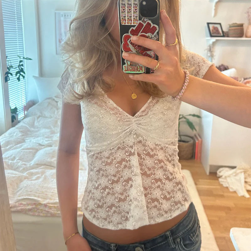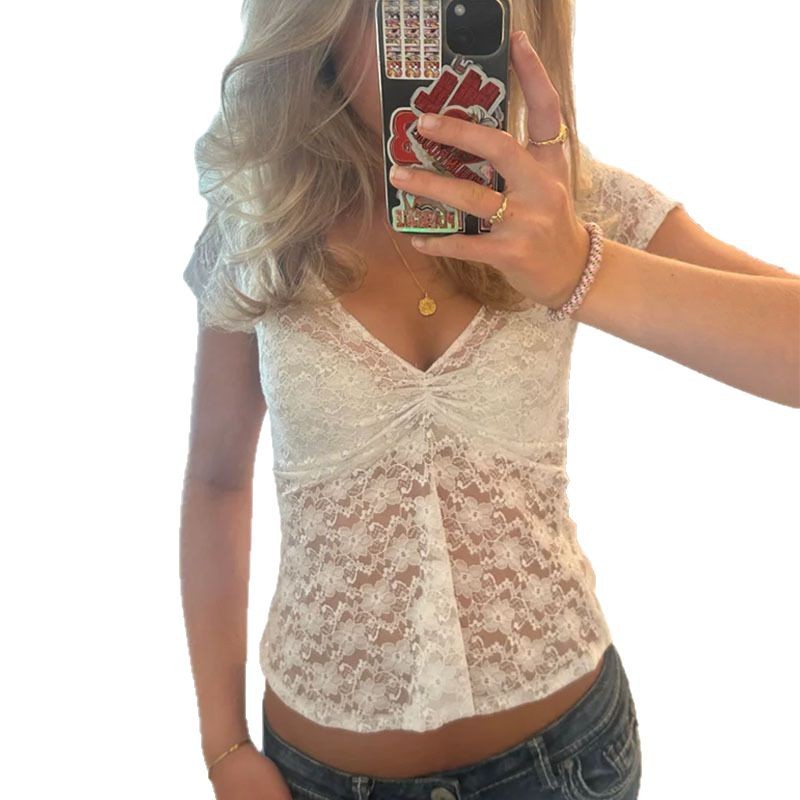 夏季新款女装欧美外贸跨境专供货源性感修身V领短袖蕾丝打底衫t恤