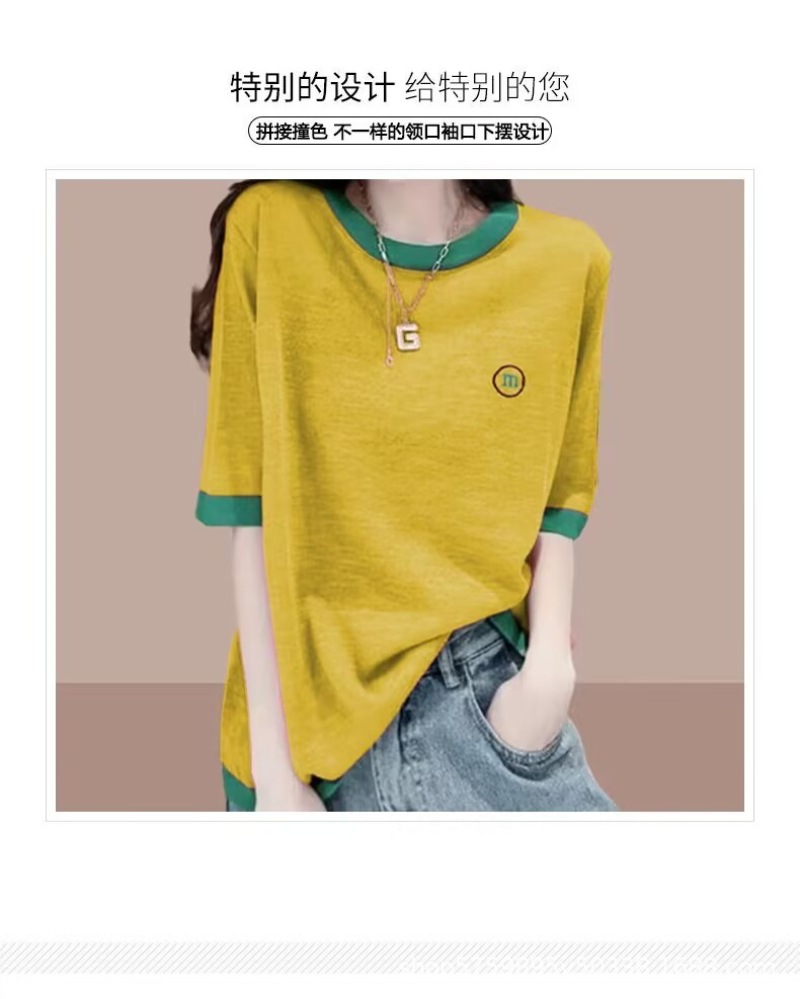 短袖竹节棉T恤女2025春夏新款薄款大码宽松休闲拼接半袖上衣女装