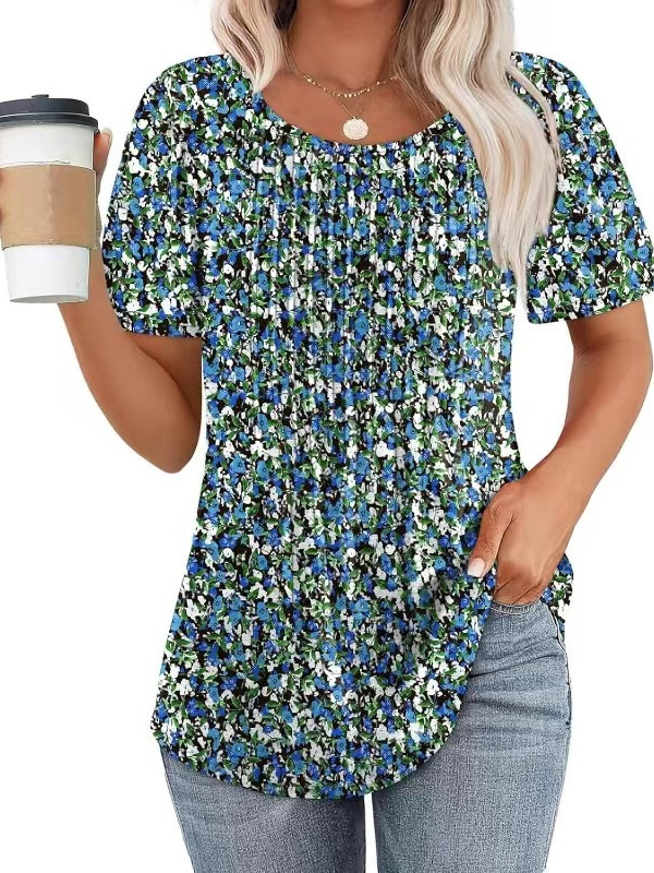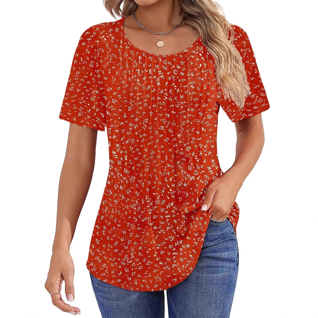 亚马逊2025跨境外贸新款夏季女装圆领压褶短袖印花T恤上衣