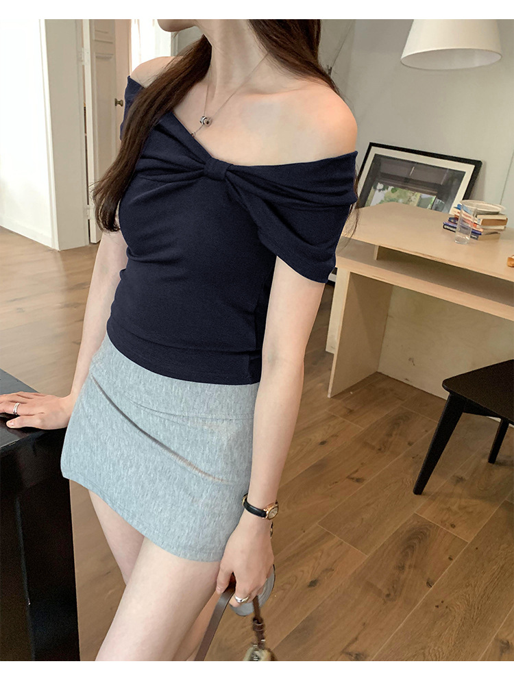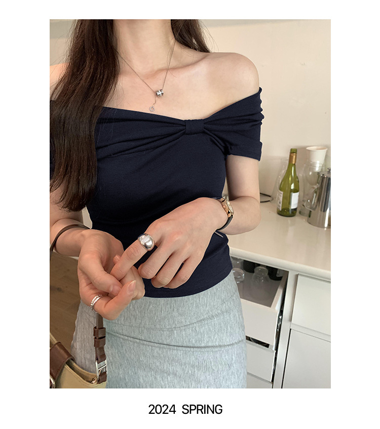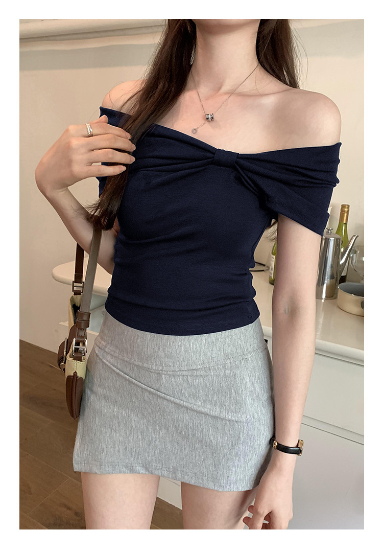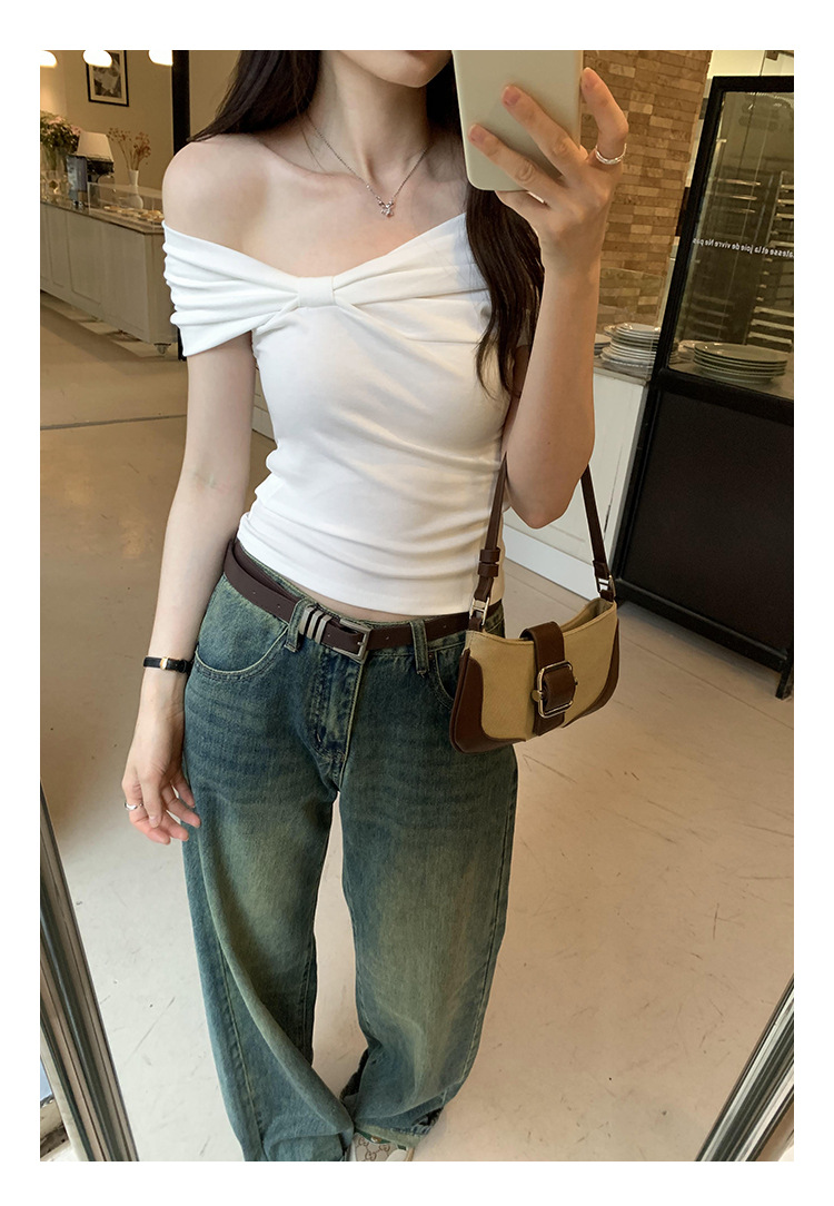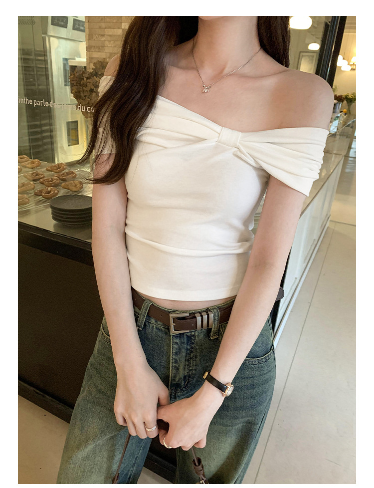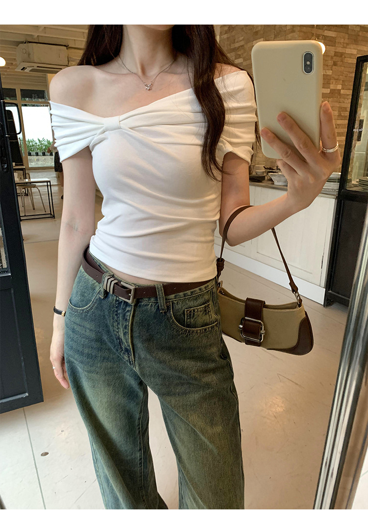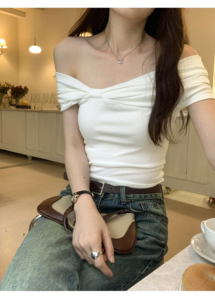 设计感褶皱一字肩短袖T恤女2025夏季露肩蝴蝶结甜辣短款学生上衣