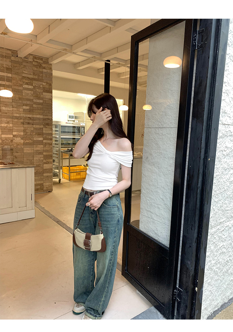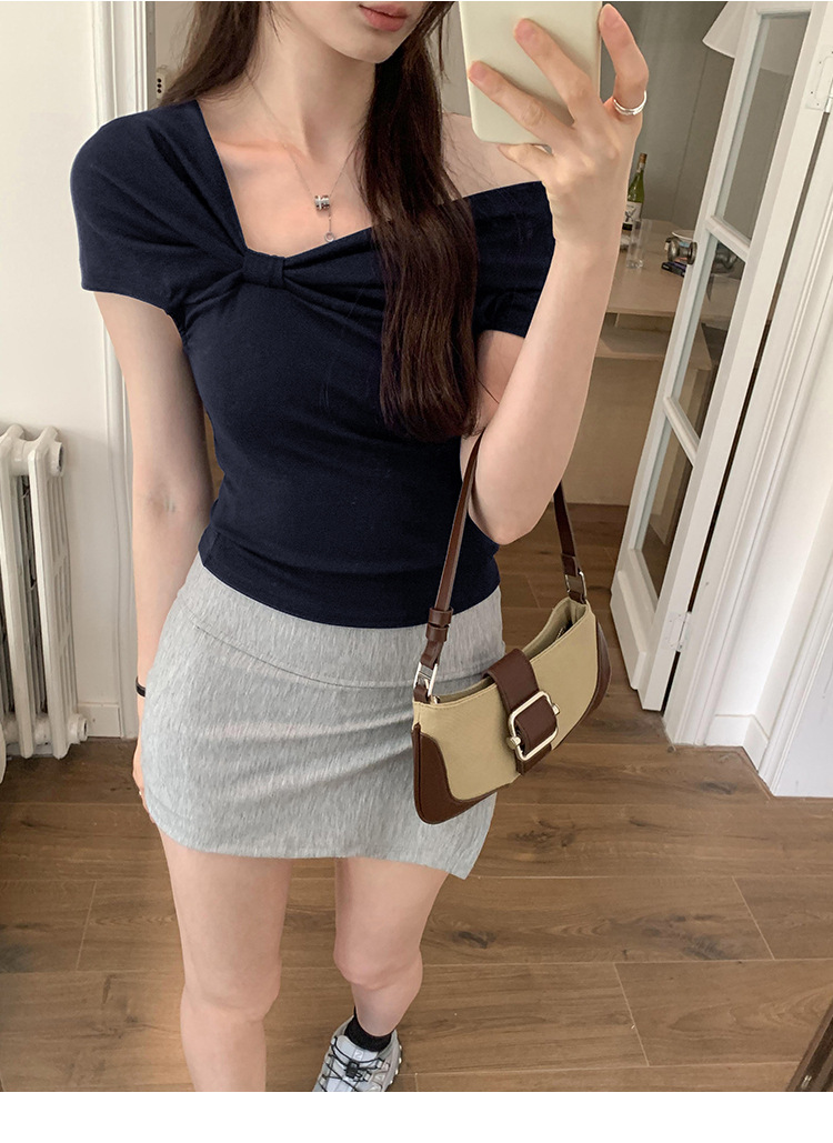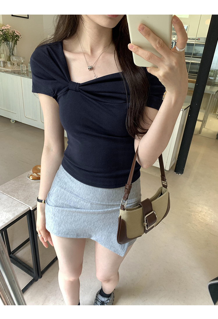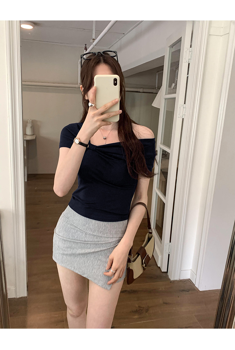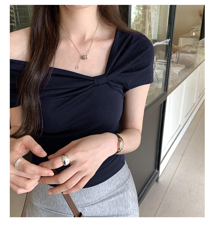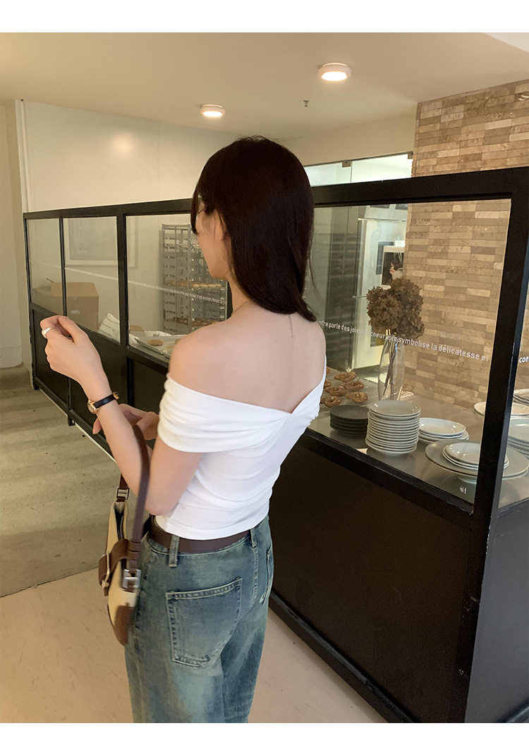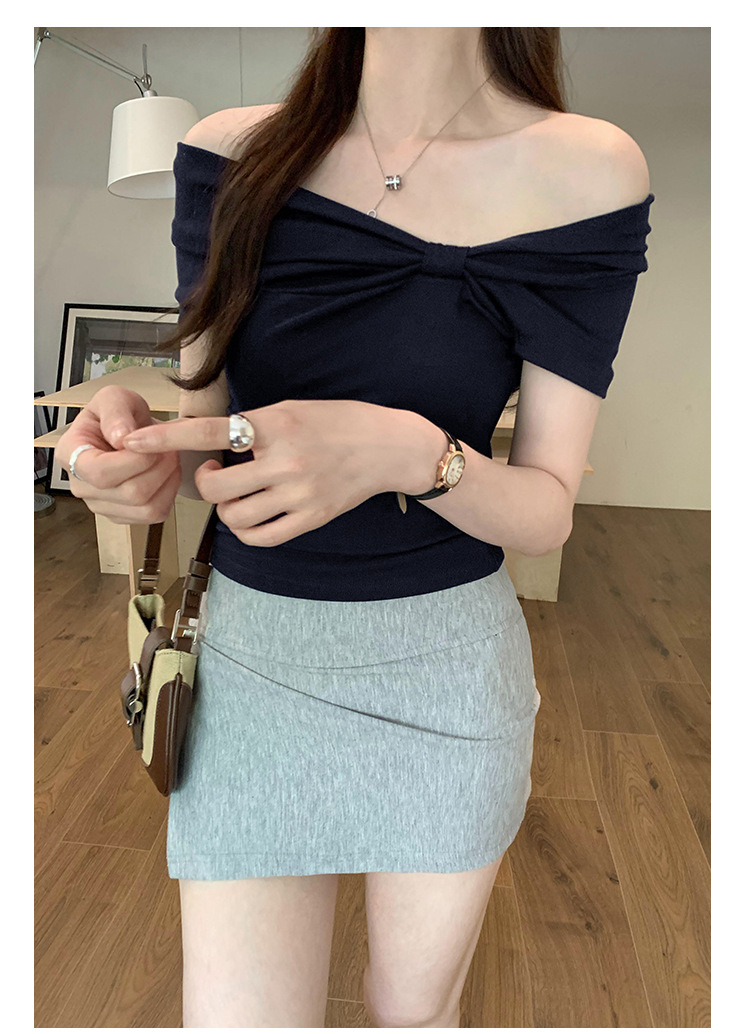 设计感褶皱一字肩短袖T恤女2025夏季露肩蝴蝶结甜辣短款学生上衣
