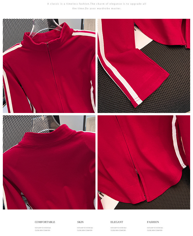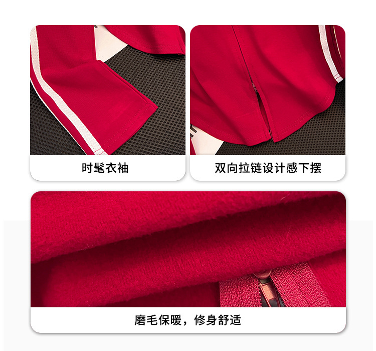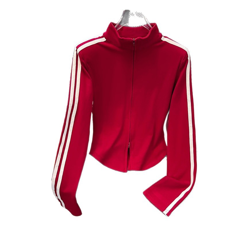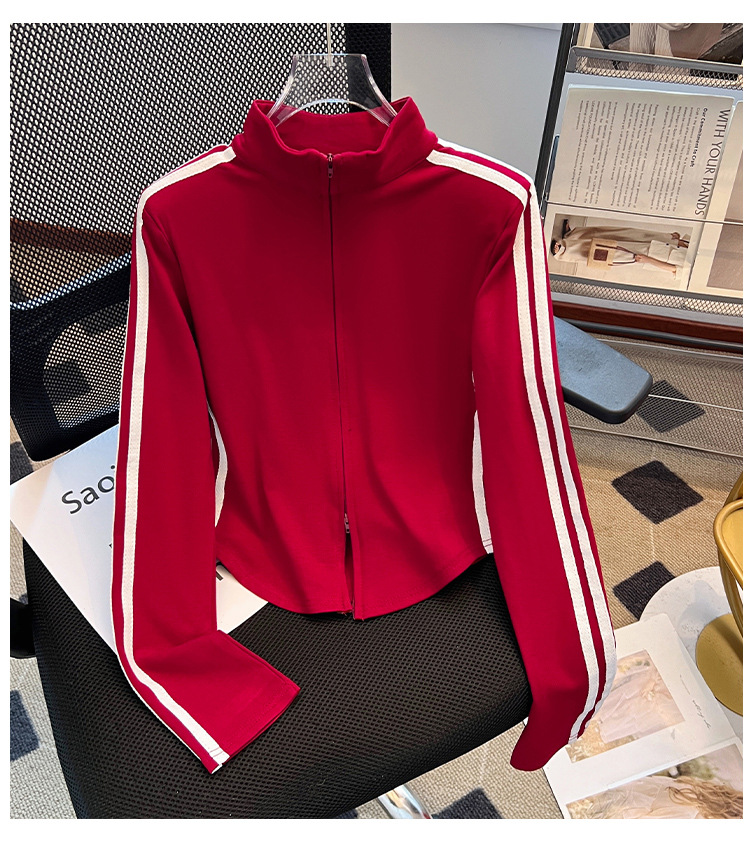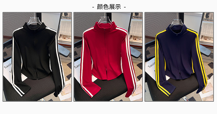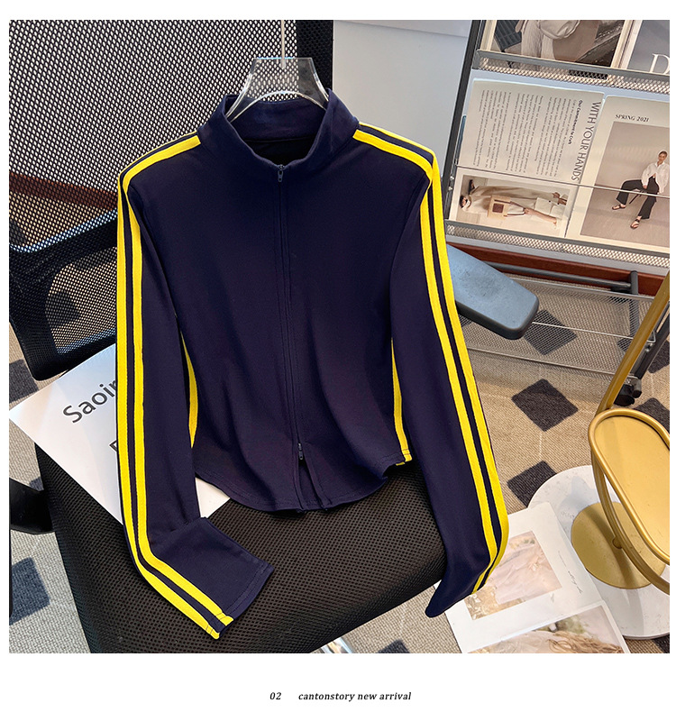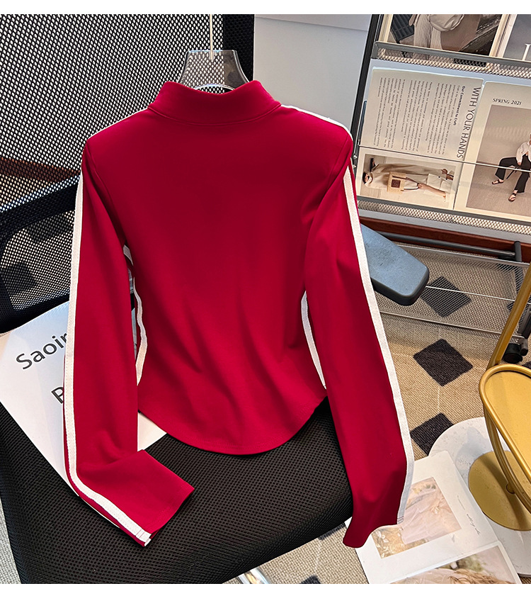 跨境美式复古杠条立领拉链长袖T恤女秋冬短款磨毛修身打底衫代发