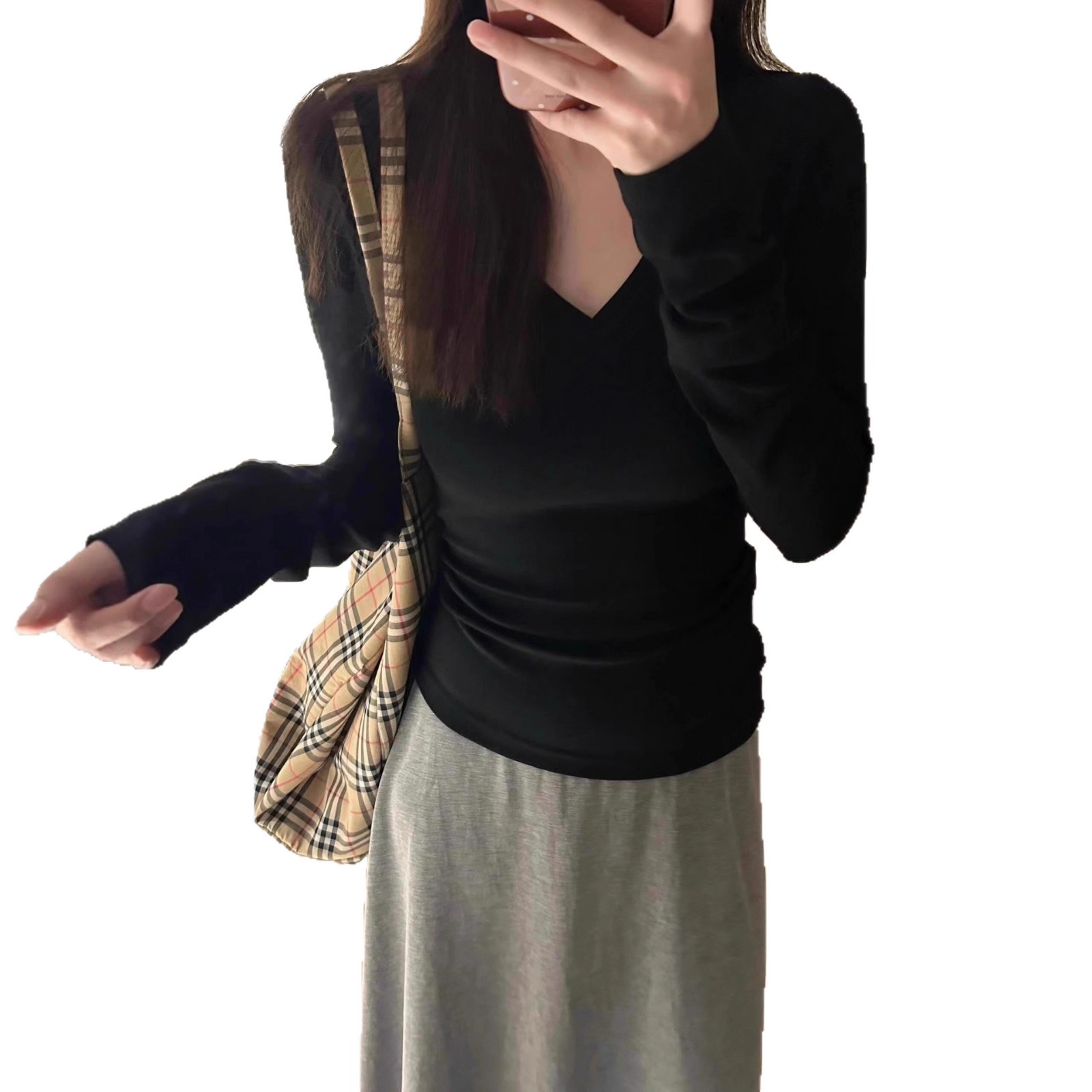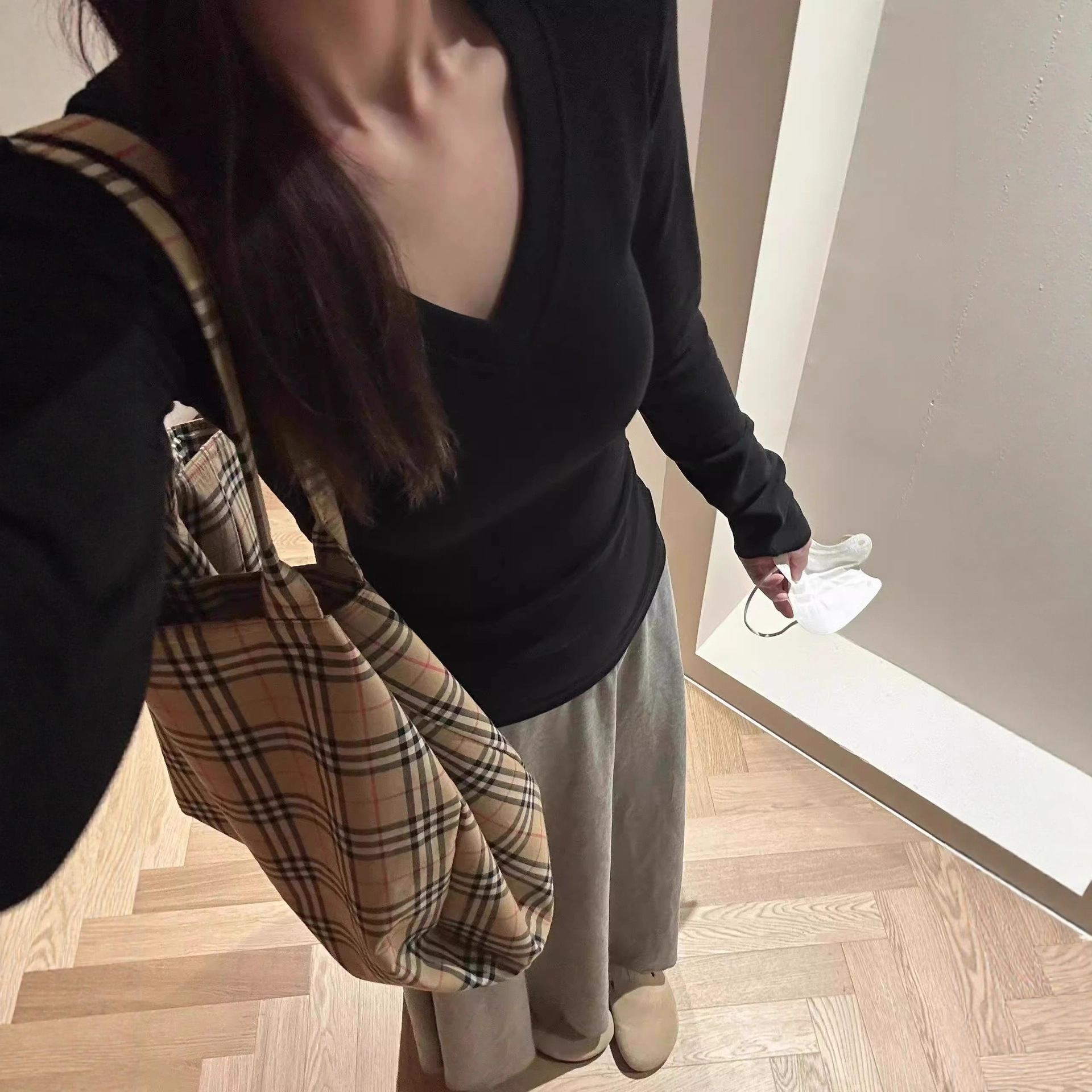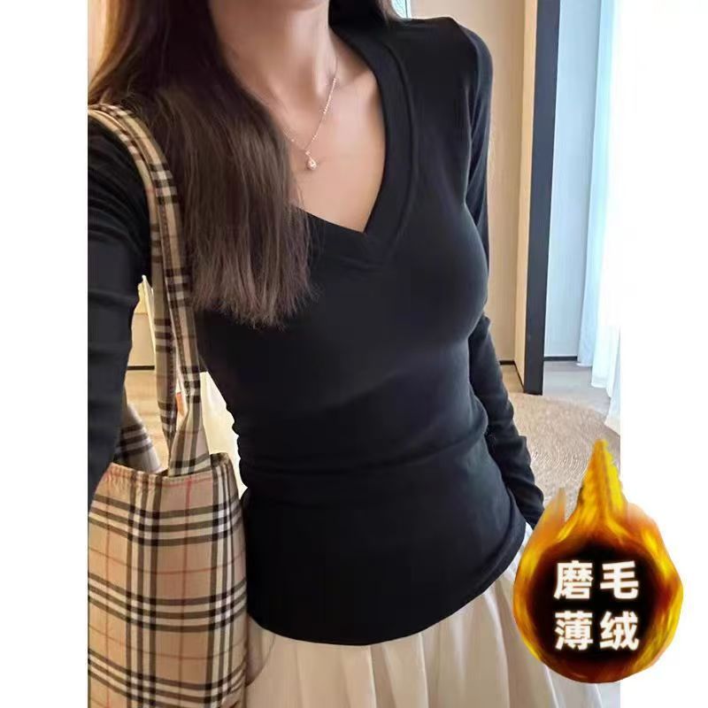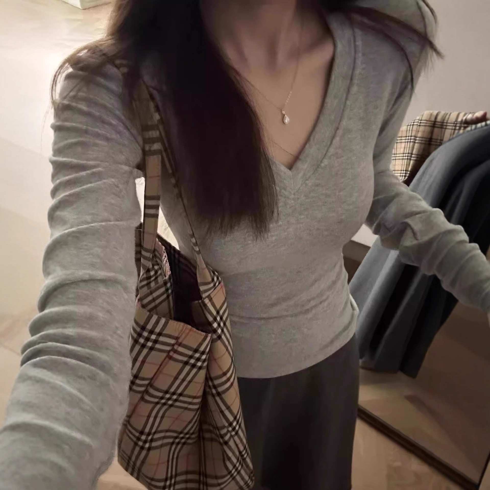 2025秋冬新款德绒V领正肩长袖t恤女内搭打底衫修身基础款辣妹上衣