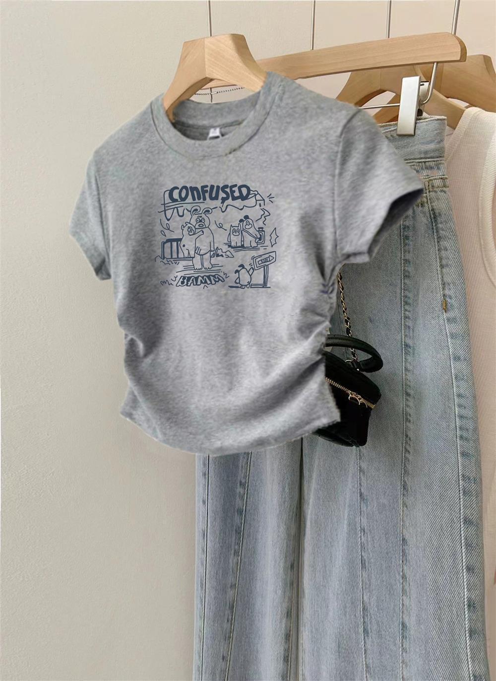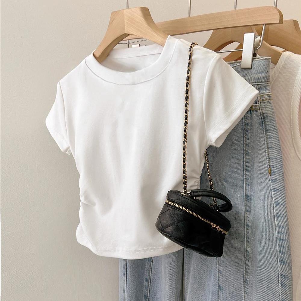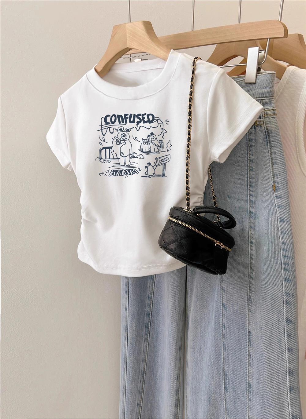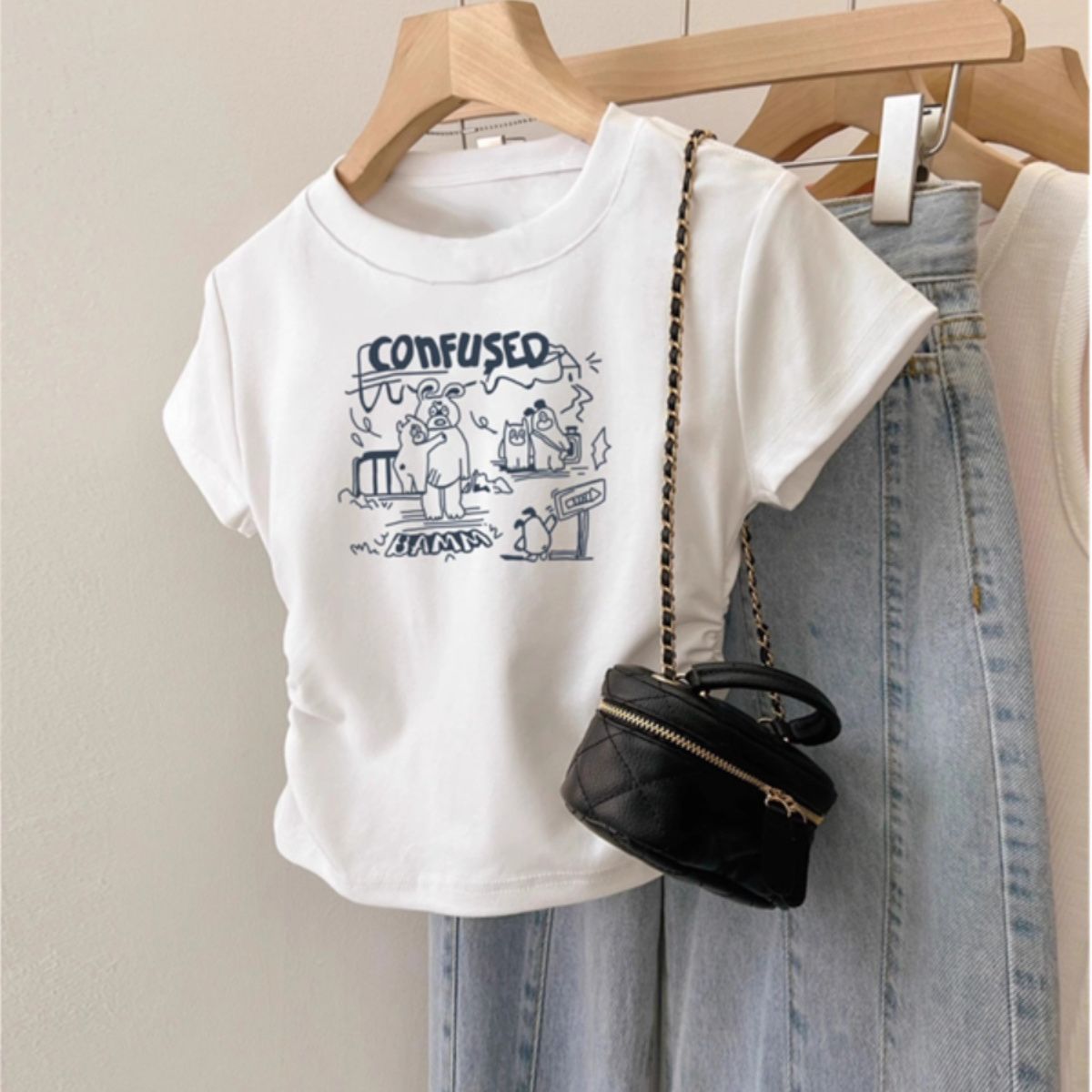 圆领正肩短袖T恤女夏季新款简约印花设计修身显瘦短款上衣ins