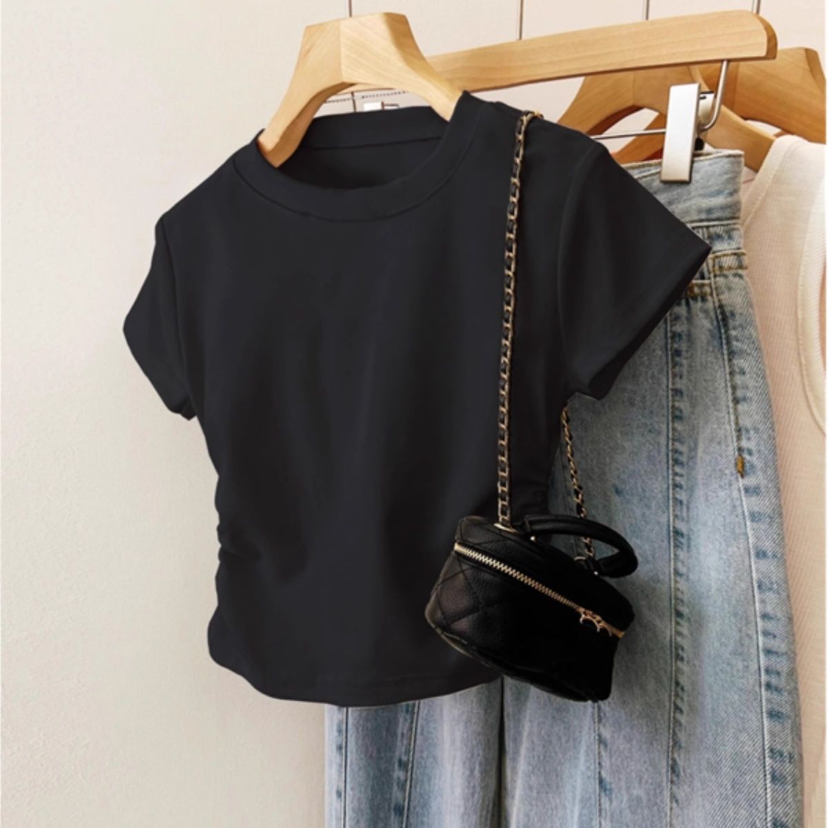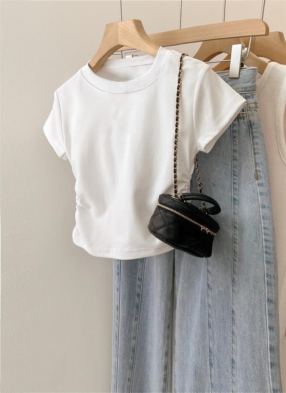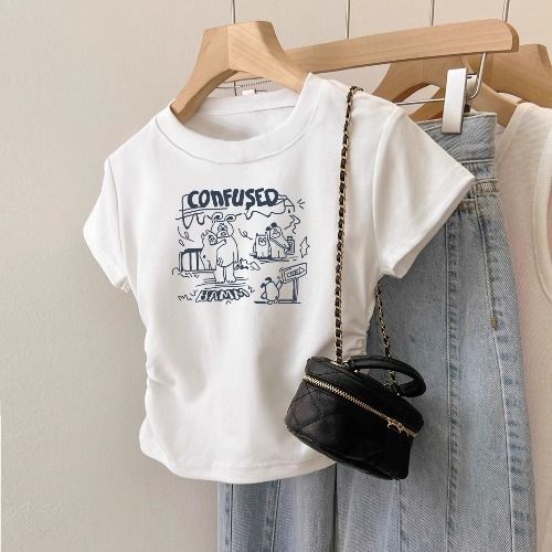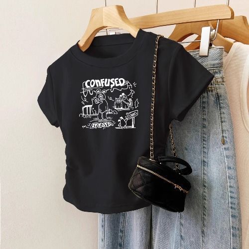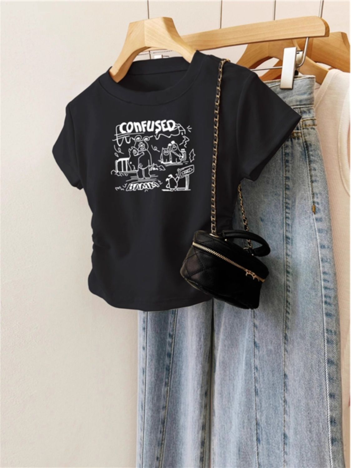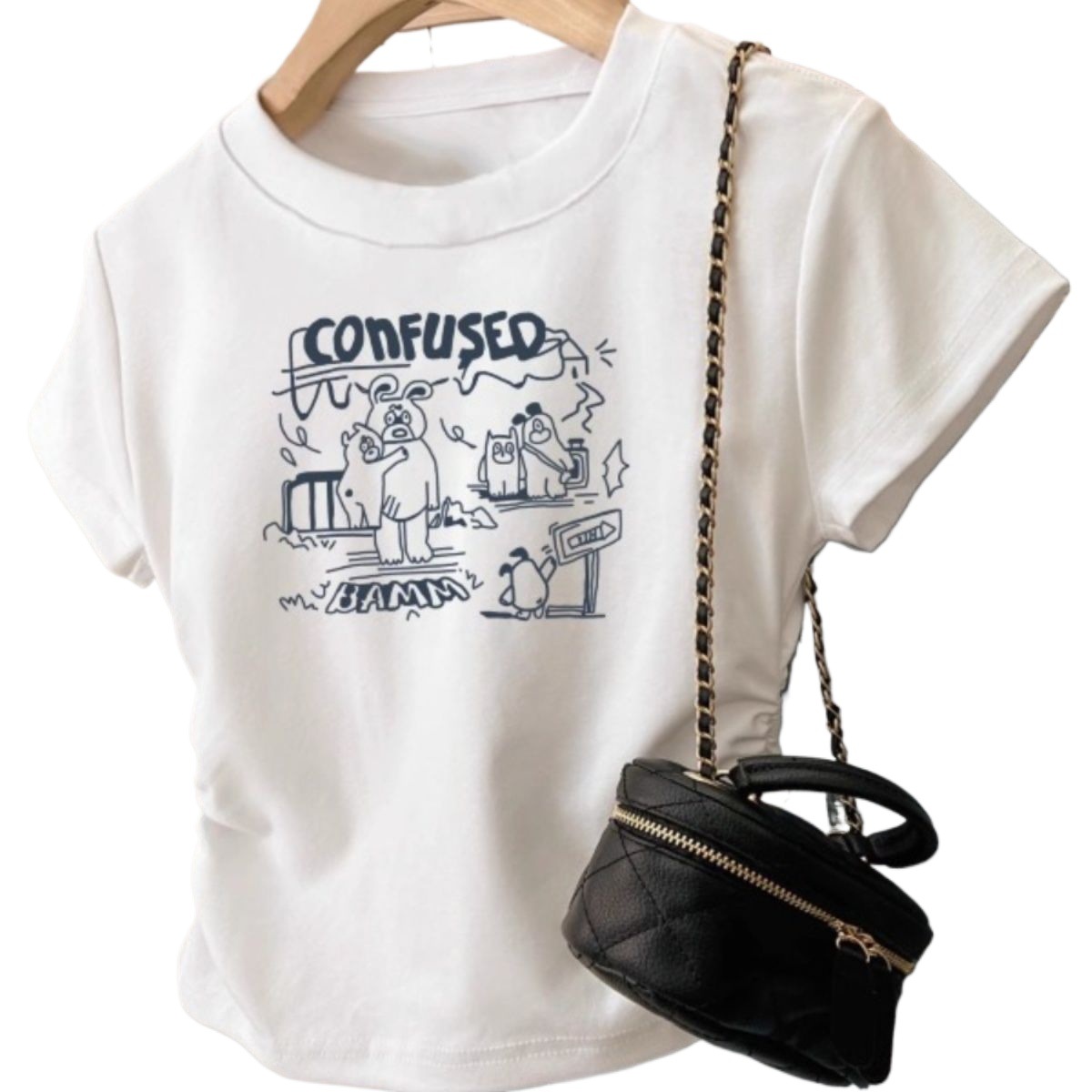 圆领正肩短袖T恤女夏季新款简约印花设计修身显瘦短款上衣ins