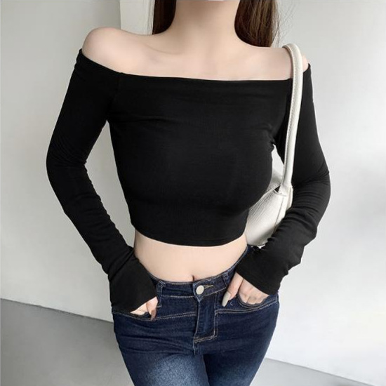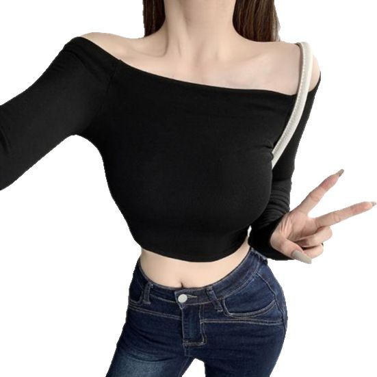 ins性感辣妹一字肩短款长袖t恤女春秋纯欲露肩T恤修身打底上衣女T