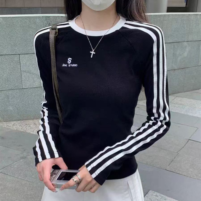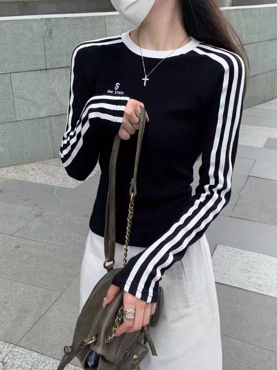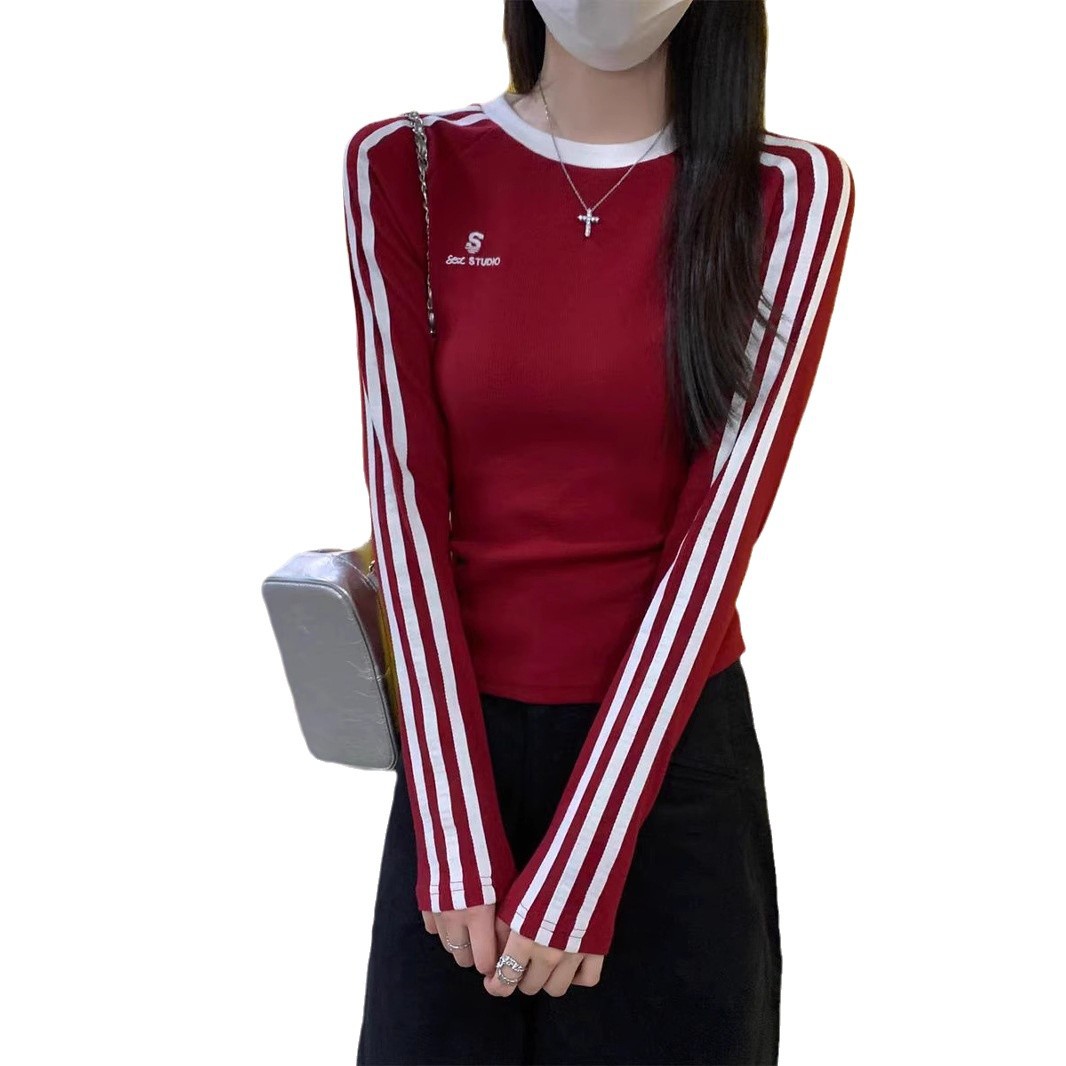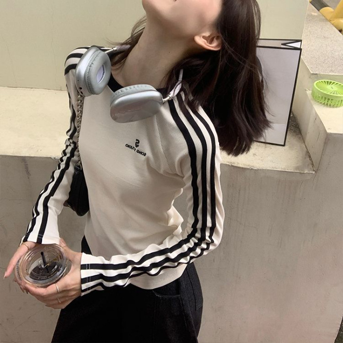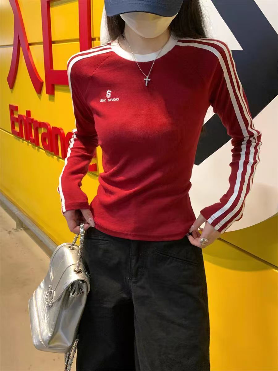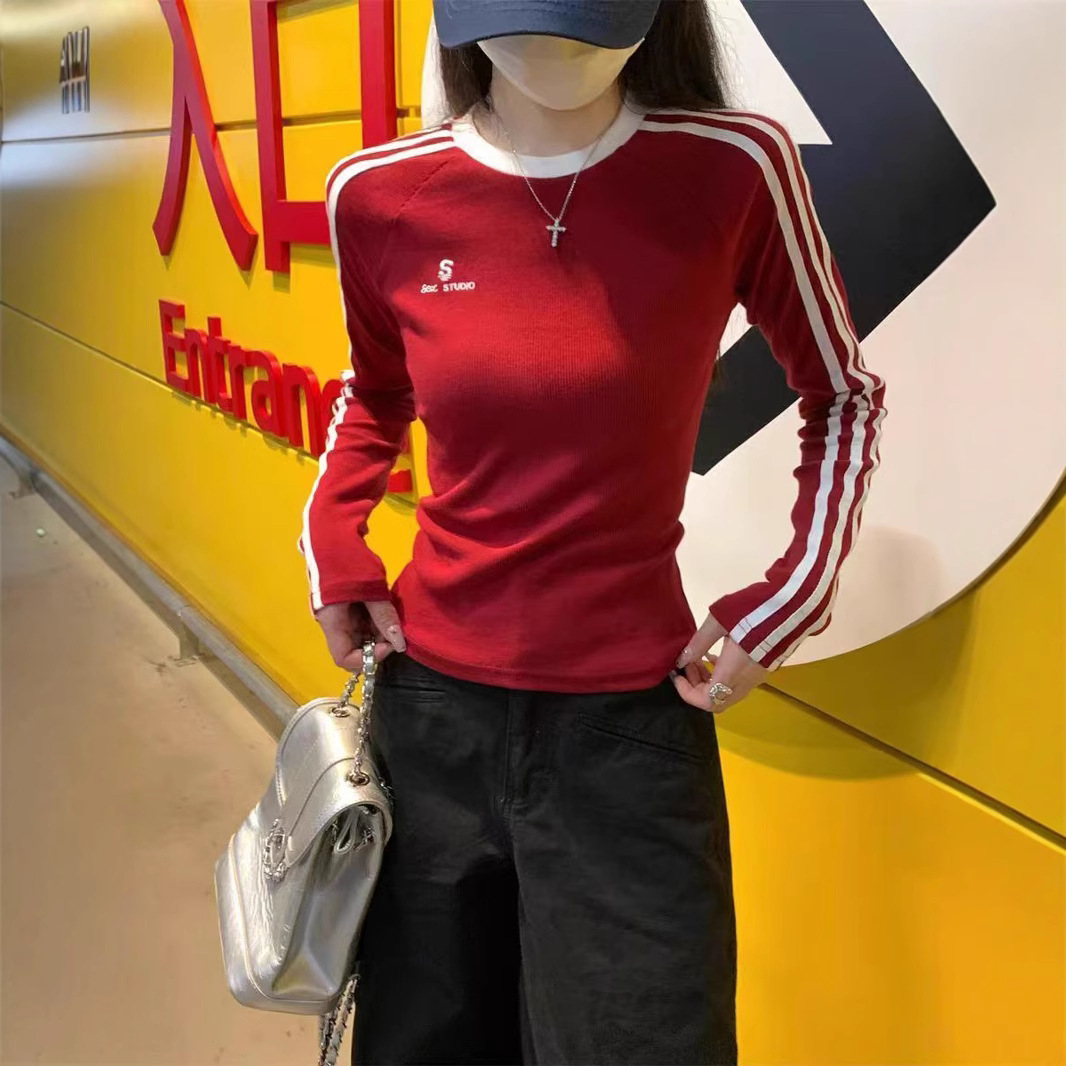 2025春秋德绒三条杠印花长袖t恤女圆领休闲保暖打底衫内外搭上衣