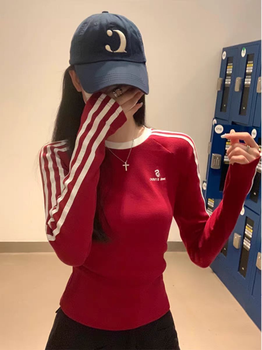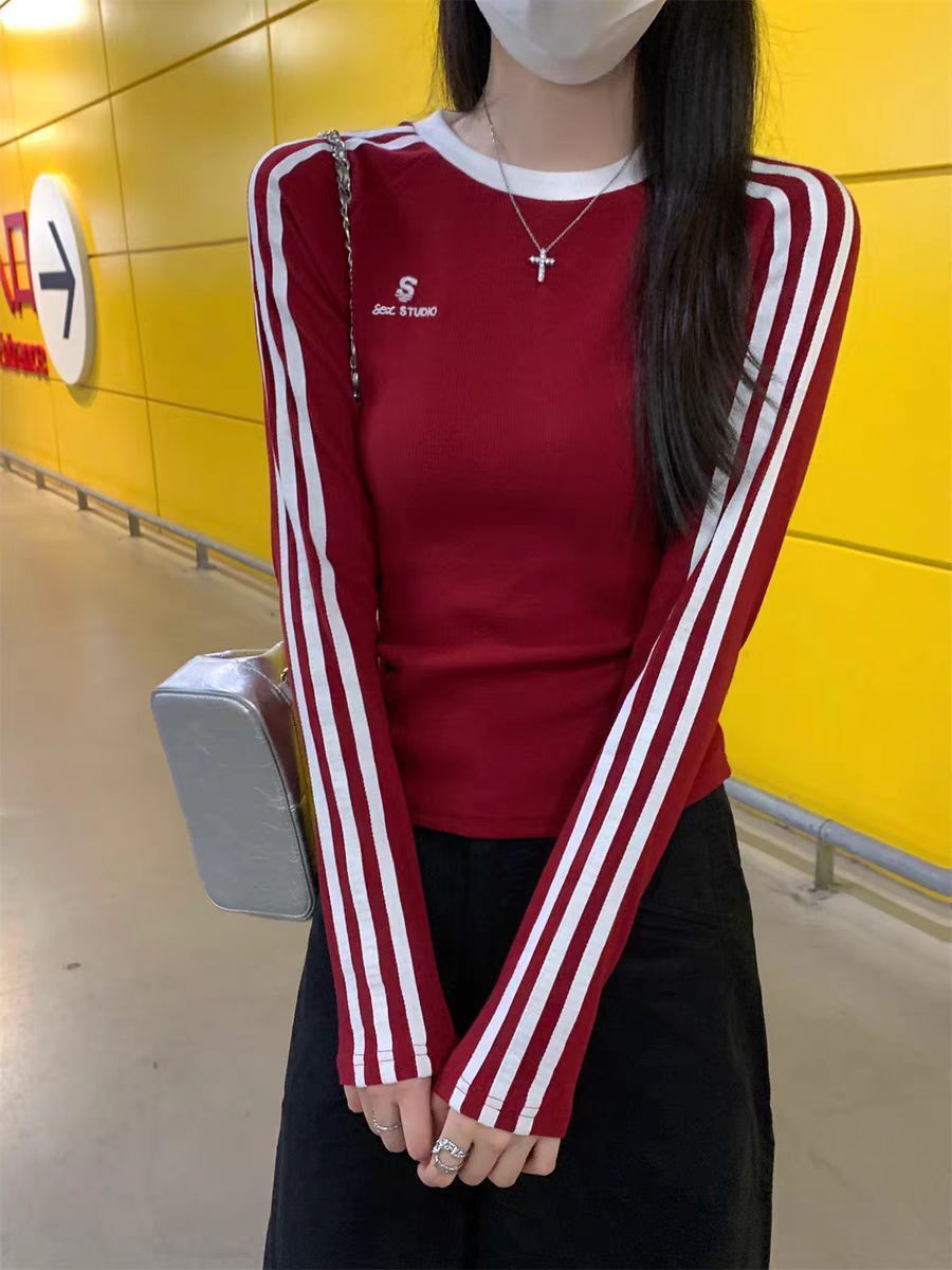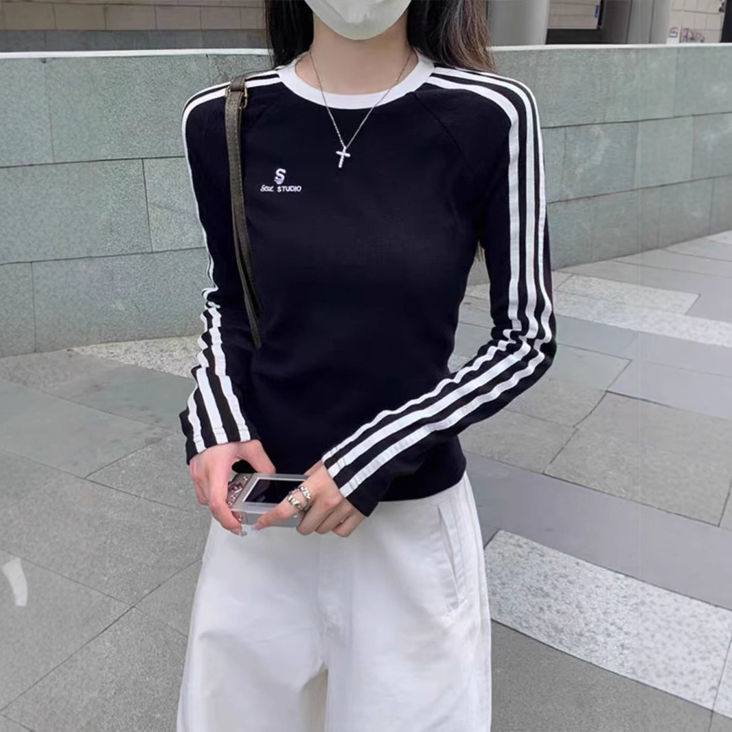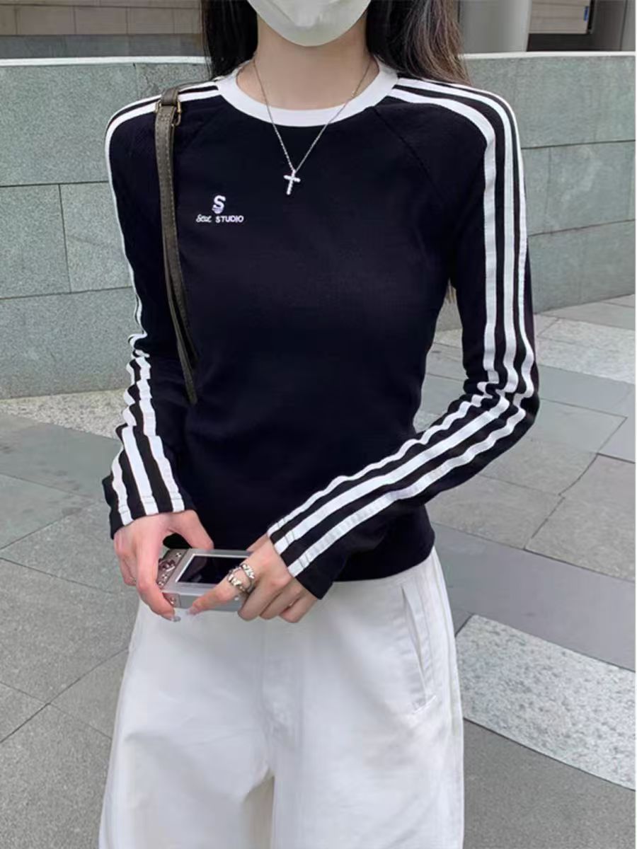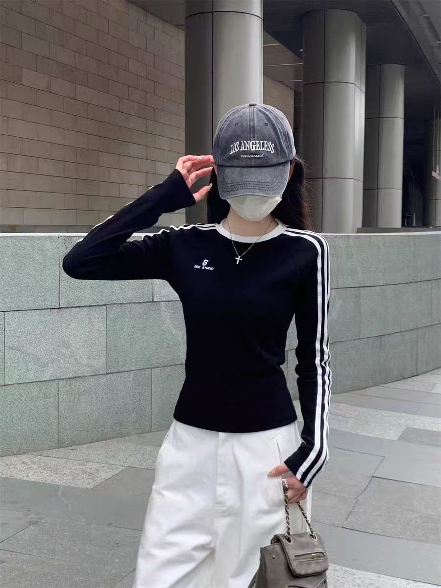 2025春秋德绒三条杠印花长袖t恤女圆领休闲保暖打底衫内外搭上衣