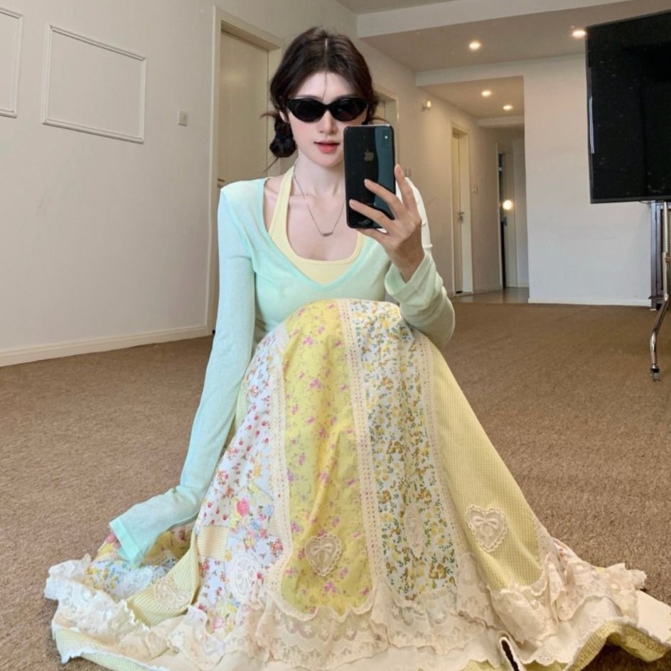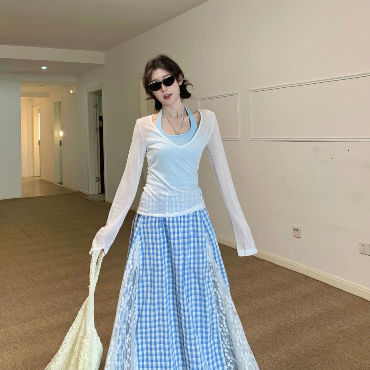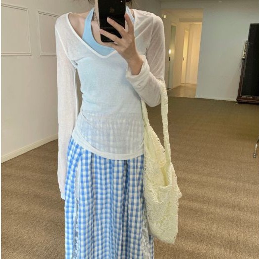 简漫妮夏季防晒罩衫女薄款叠穿V领长袖T恤叠穿挂脖吊带背心上衣女