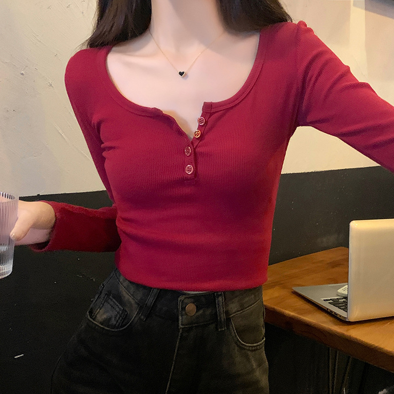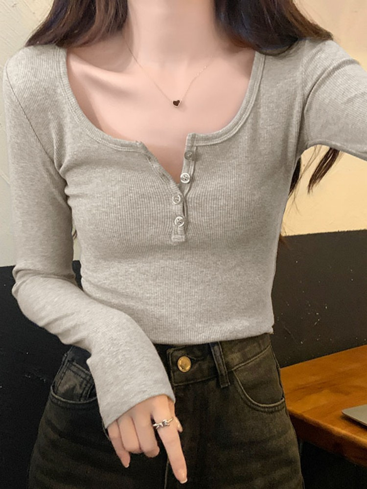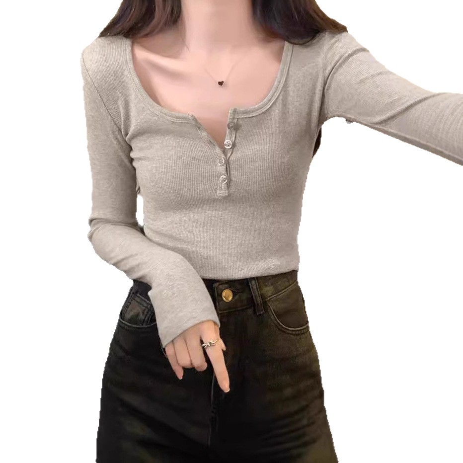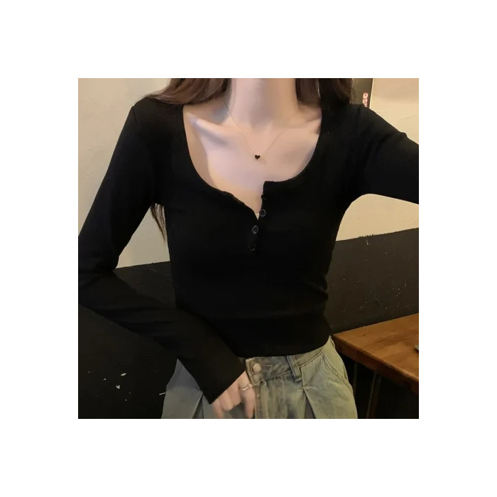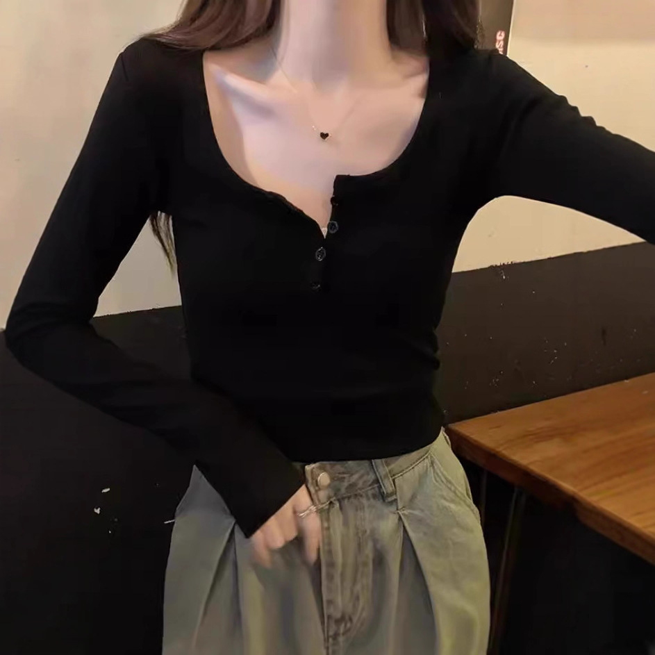 2025年辣妹半开领长袖打底t恤女衫春秋螺纹修身纽扣长袖上衣小衫