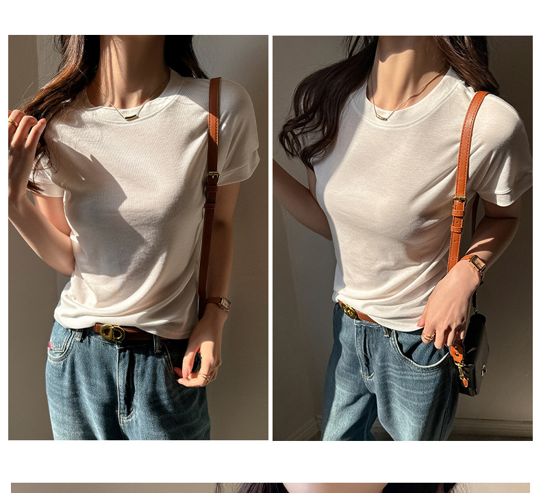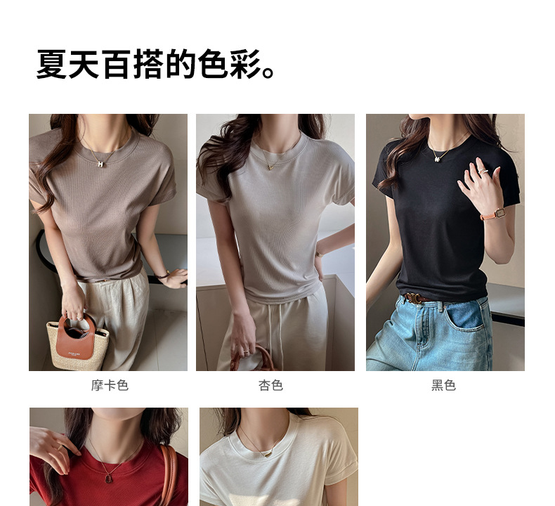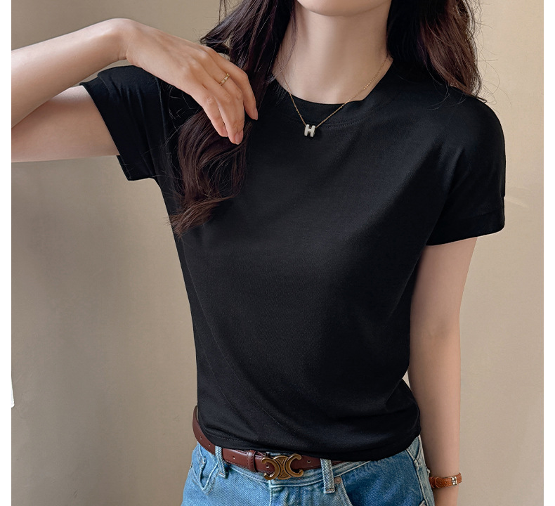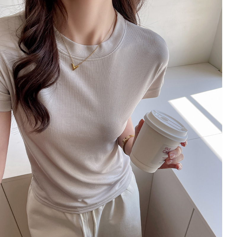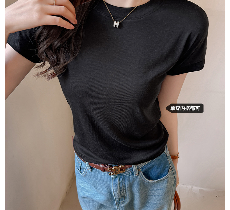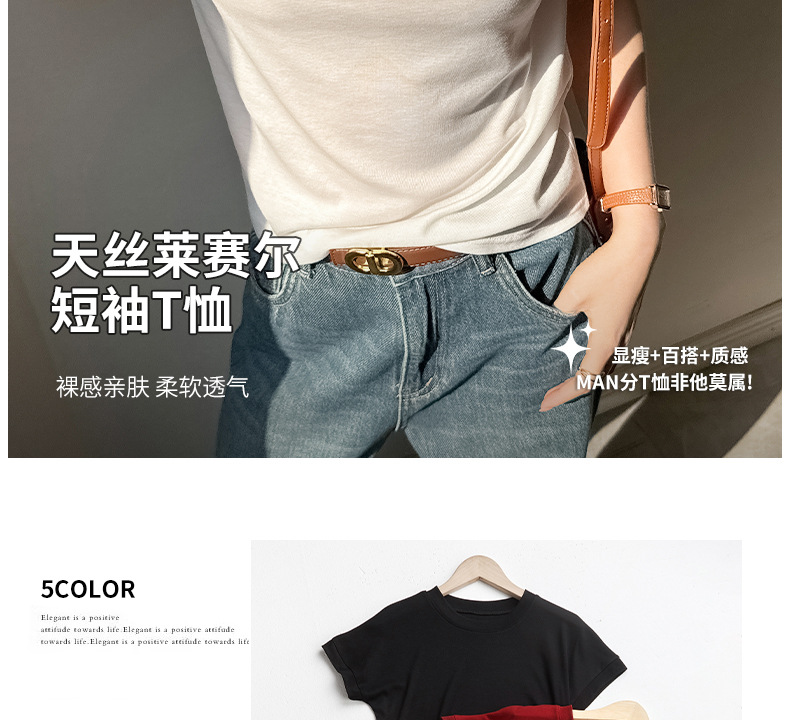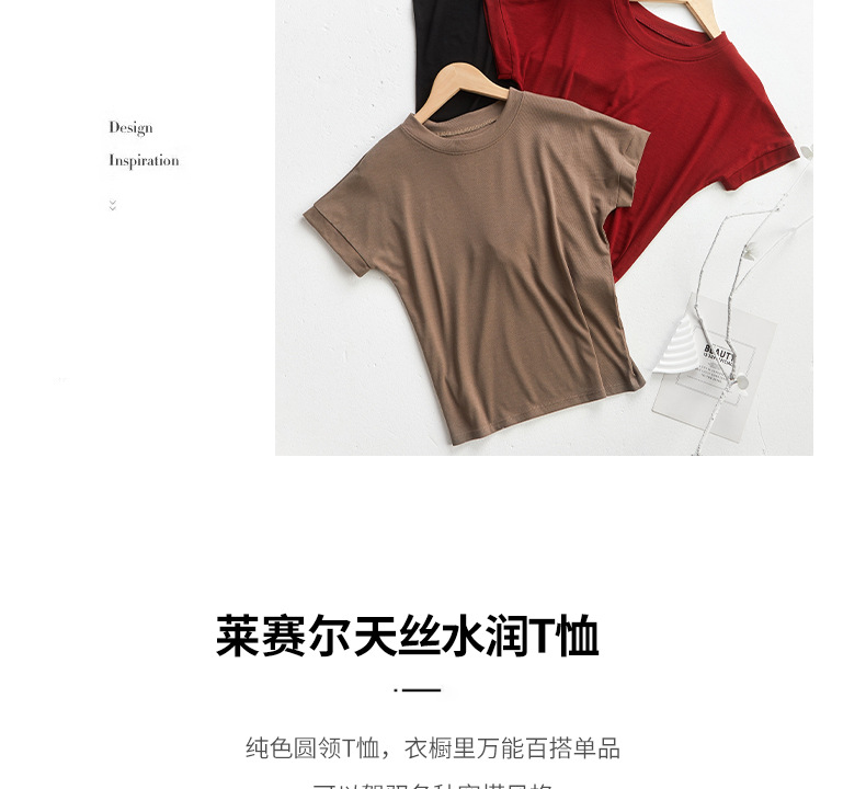 天丝莱赛尔夏季小圆领正肩短袖t恤女高级设计感连袖修身百搭上衣