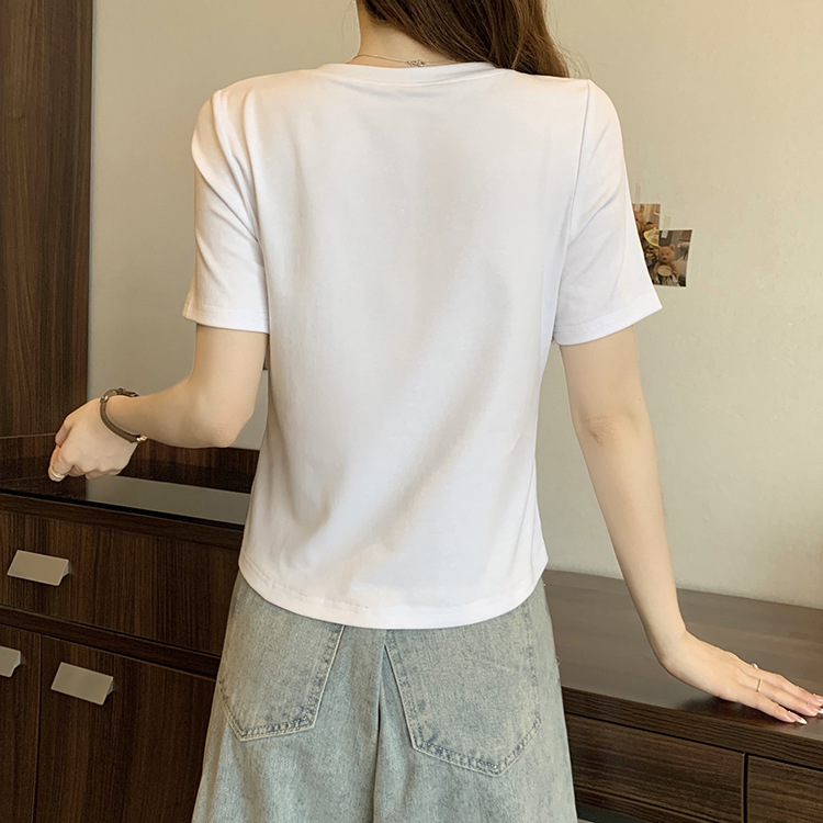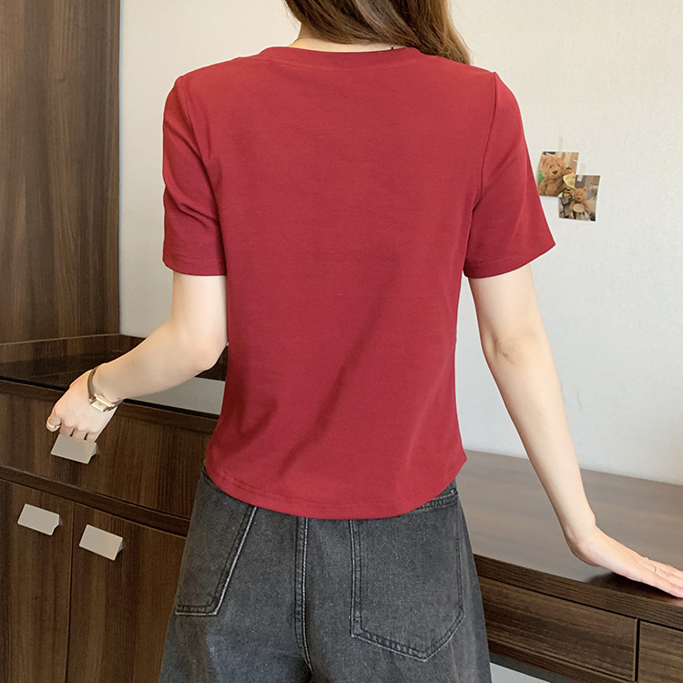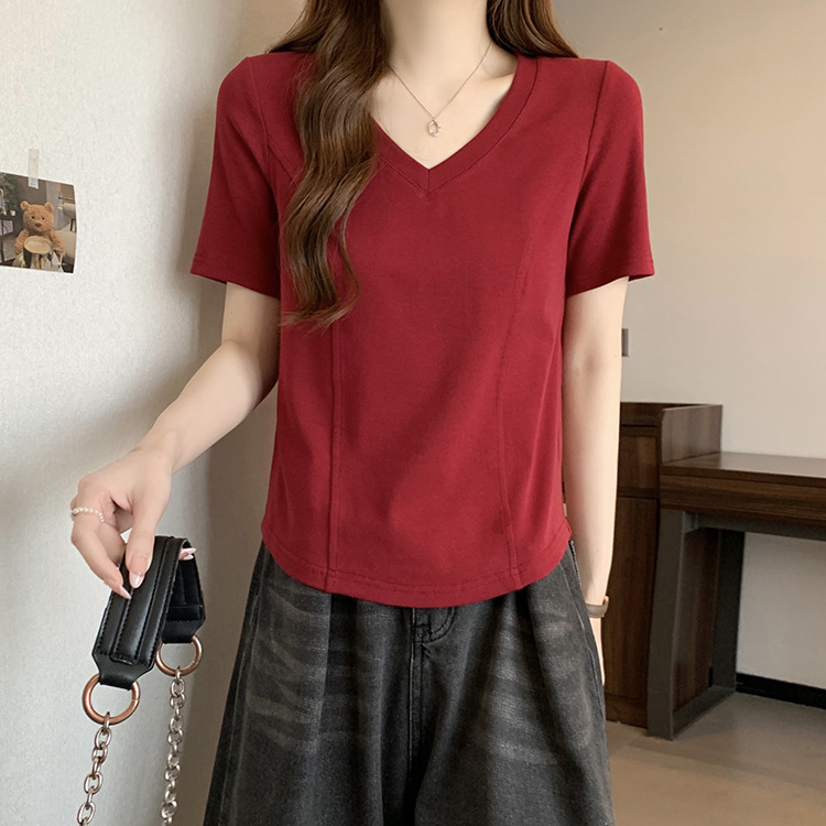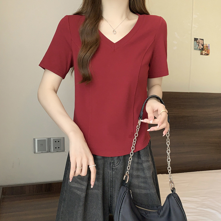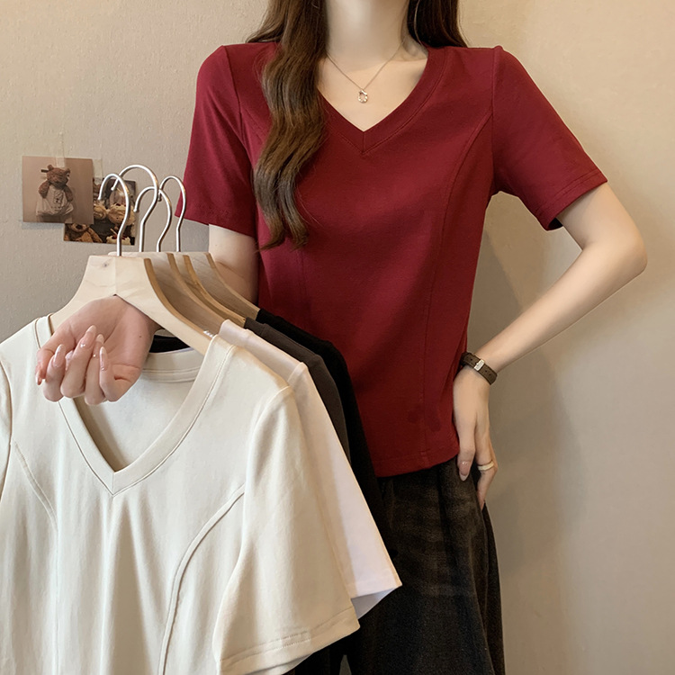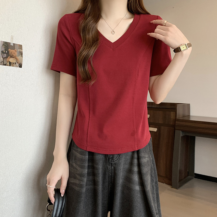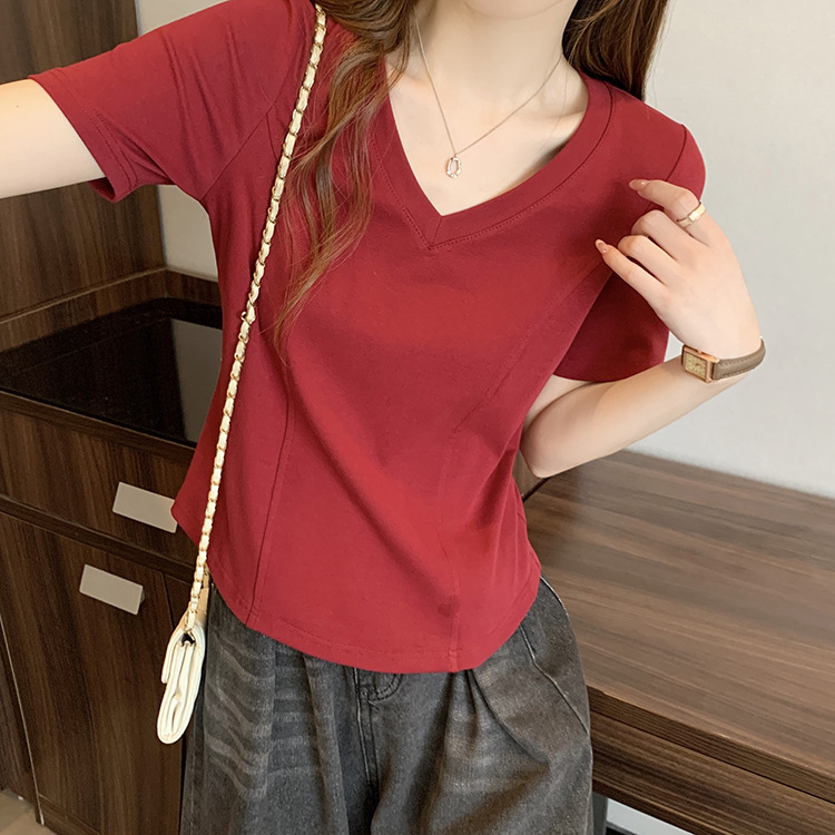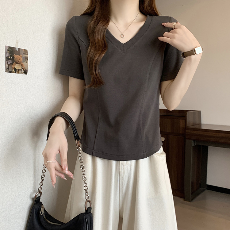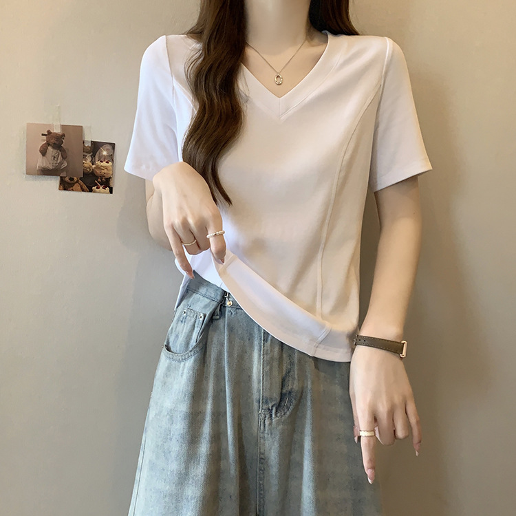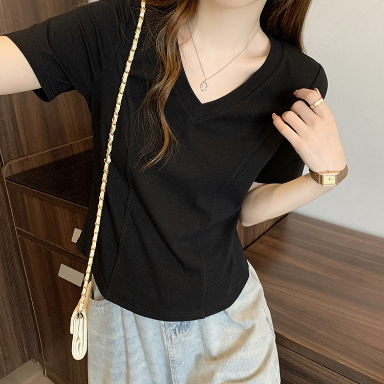 2026夏装基础款显瘦纯色修身鱼骨V领正肩不规则短袖T恤女新款上衣