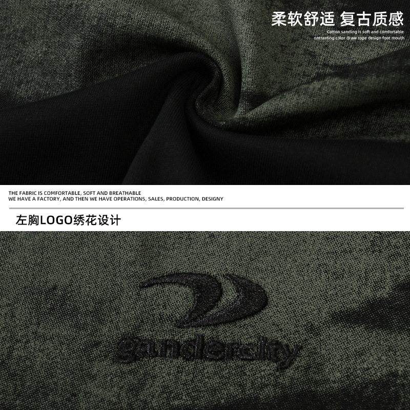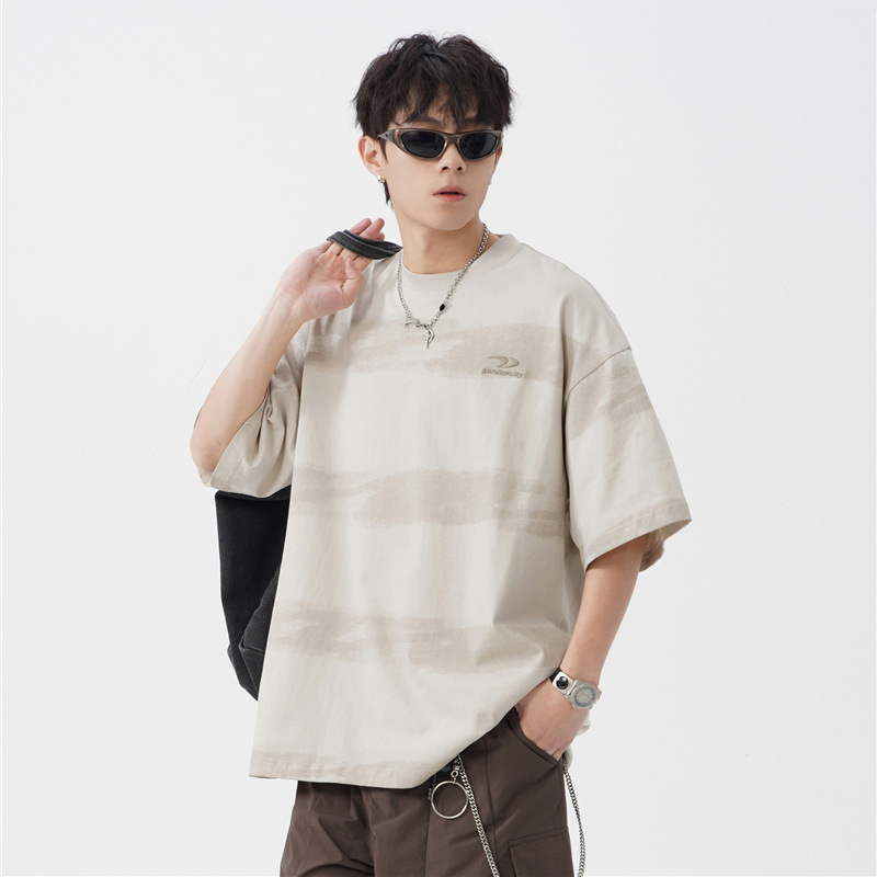 仿扎染撞色条纹纯棉短袖T恤男夏季款潮牌绣花体恤衫日系复古半袖