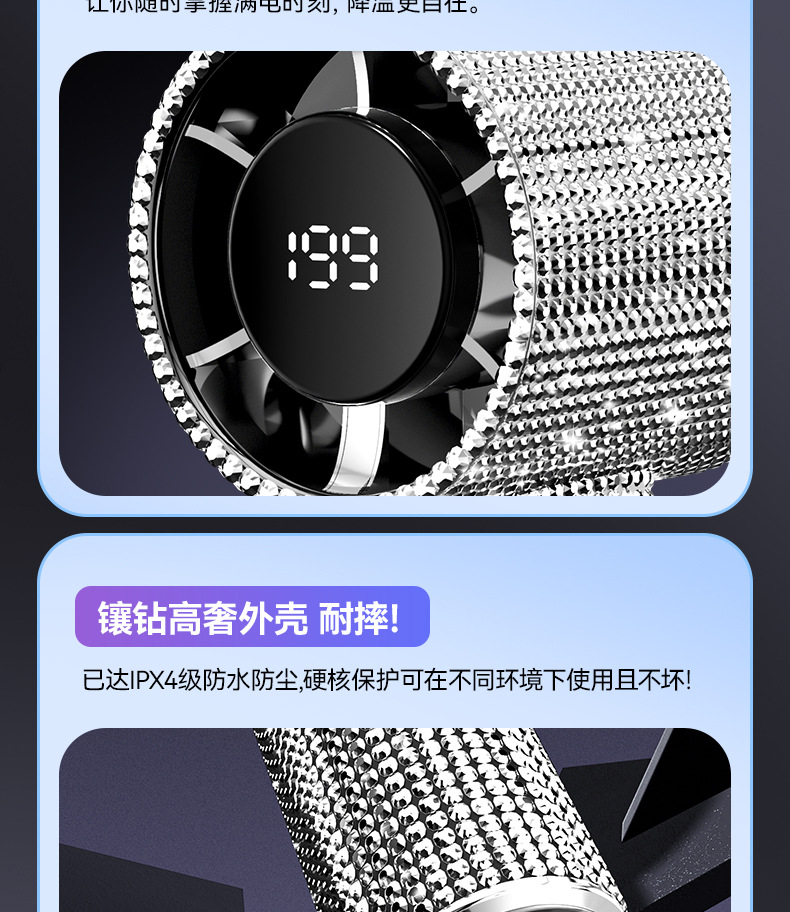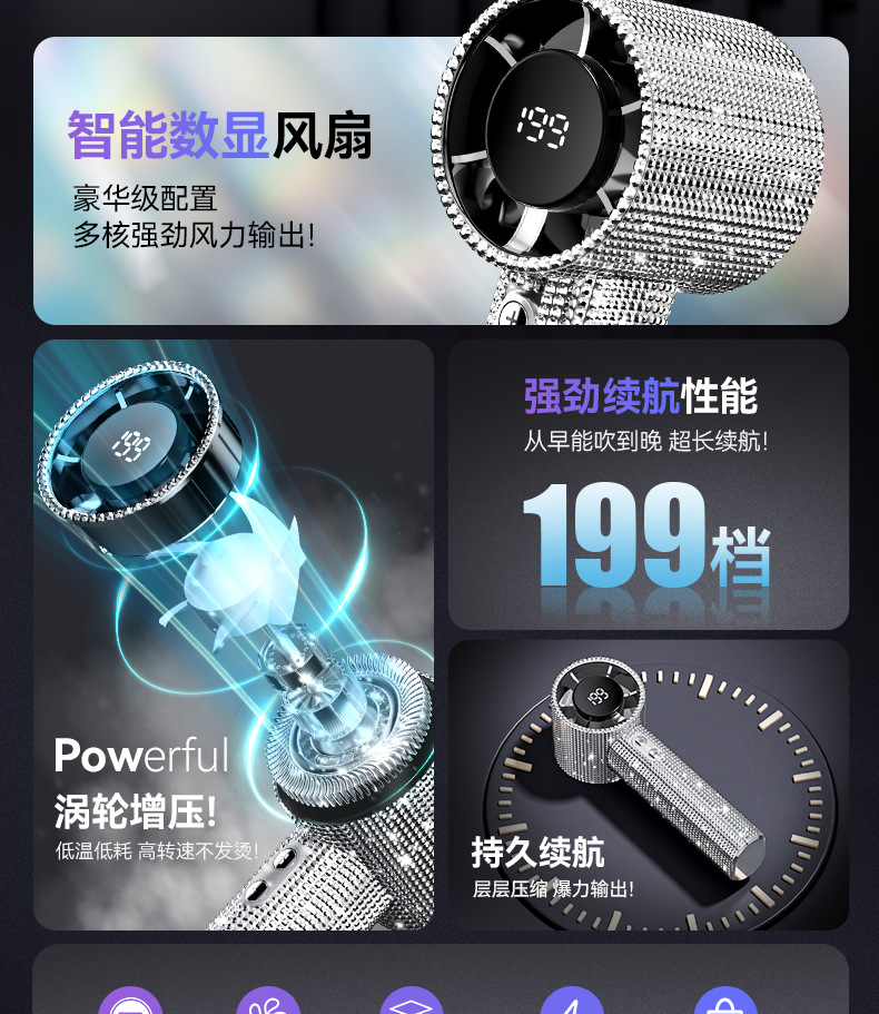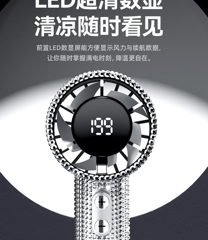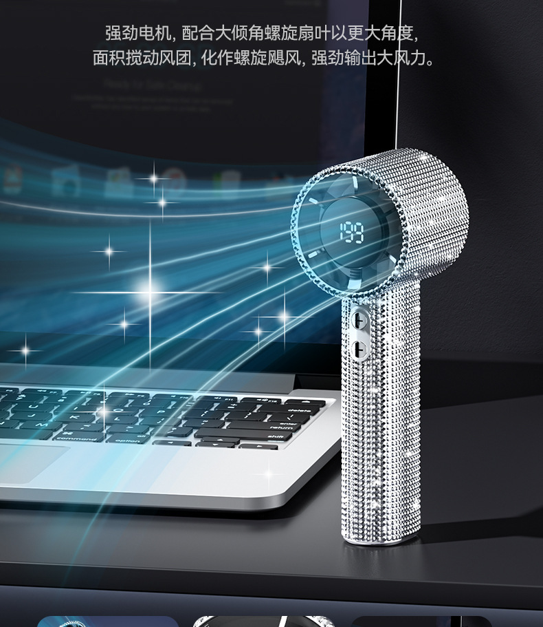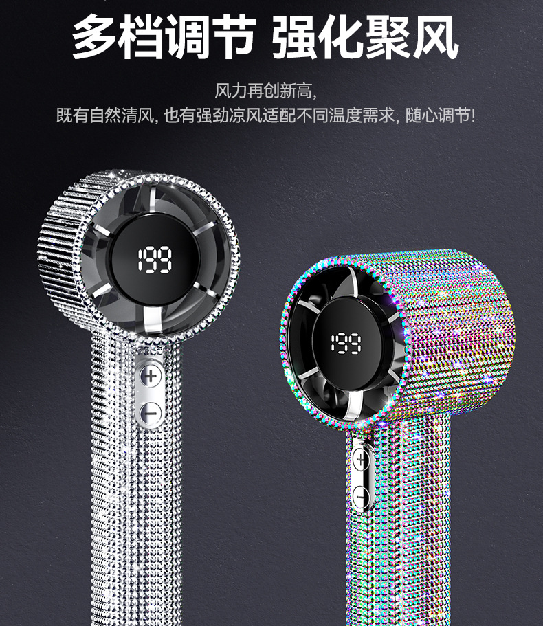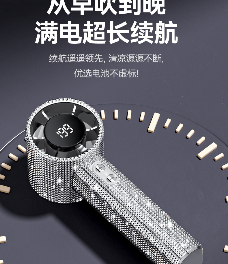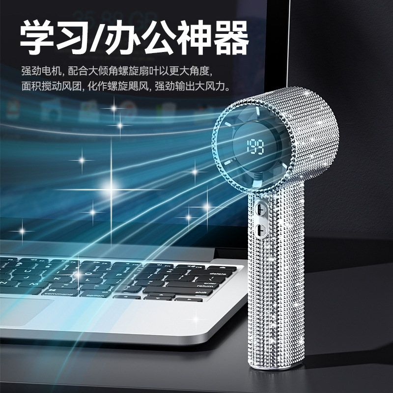 跨境199档手持暴力涡轮全包镶钻小风扇USB高速数显便携长续航风扇