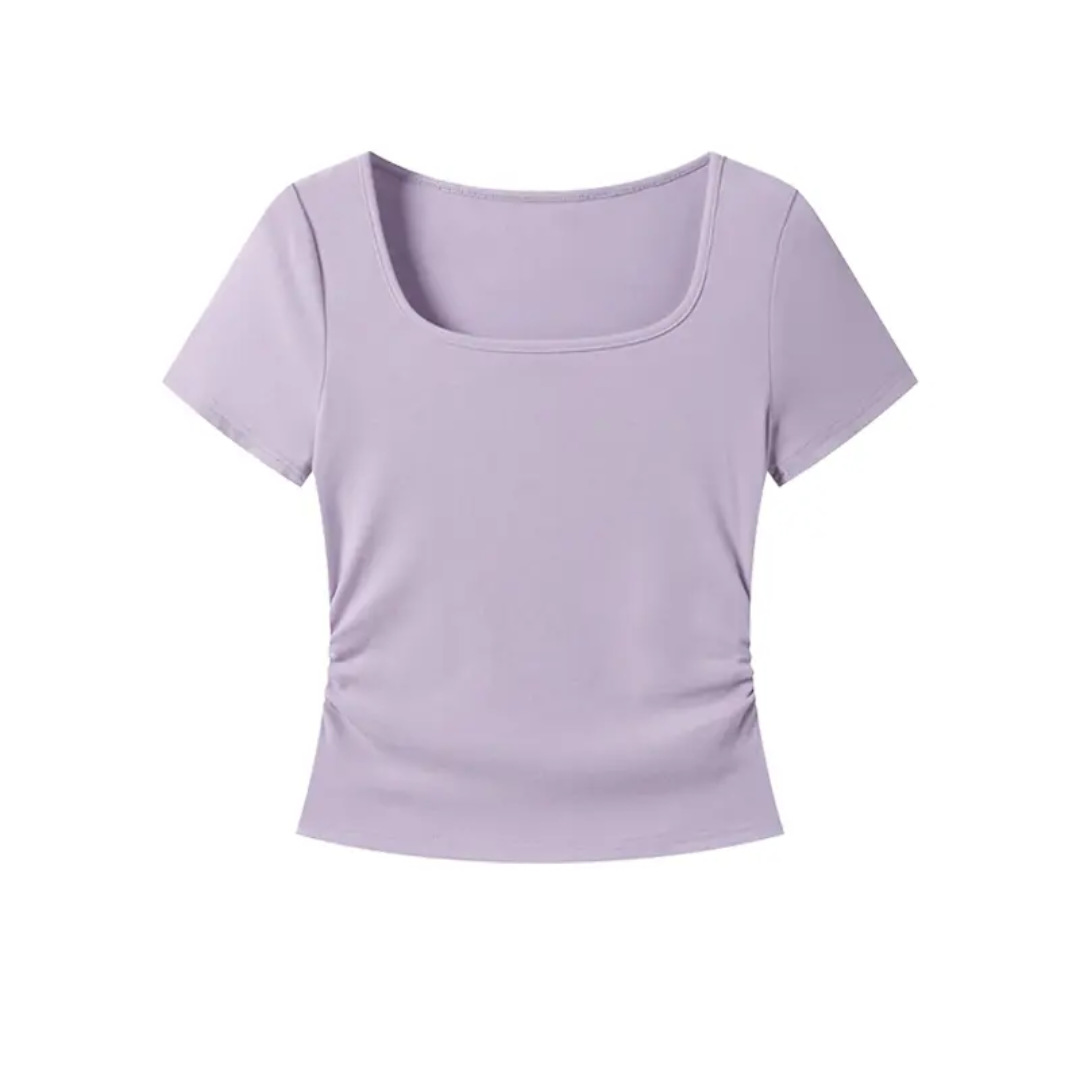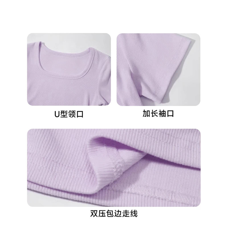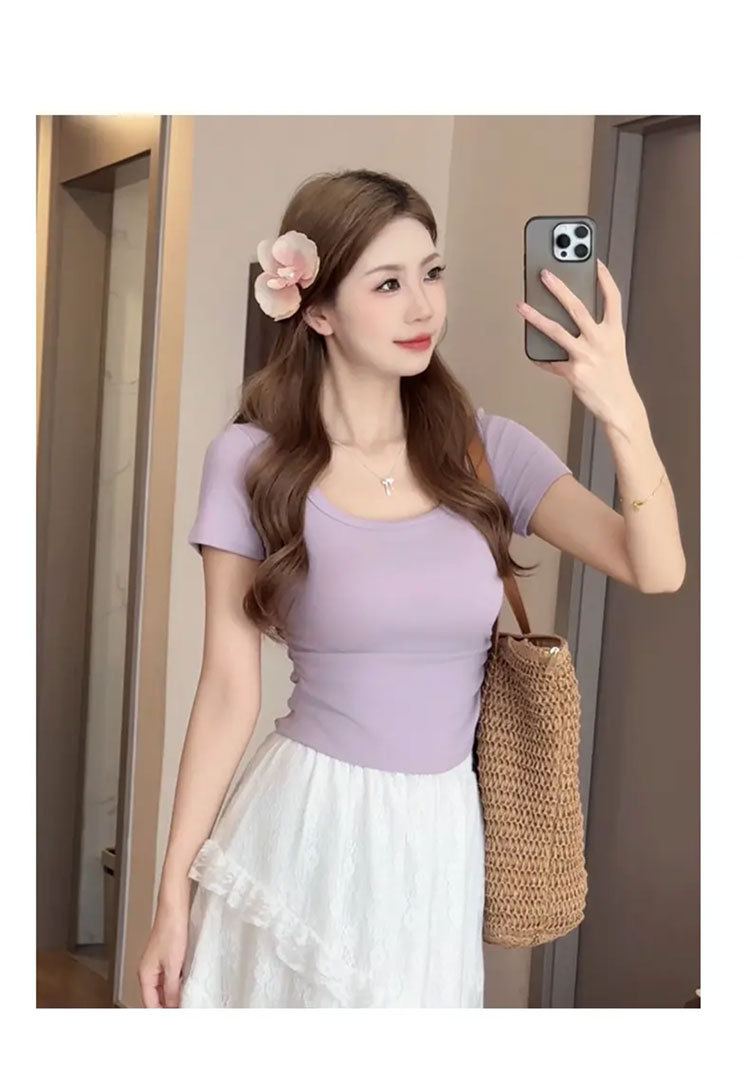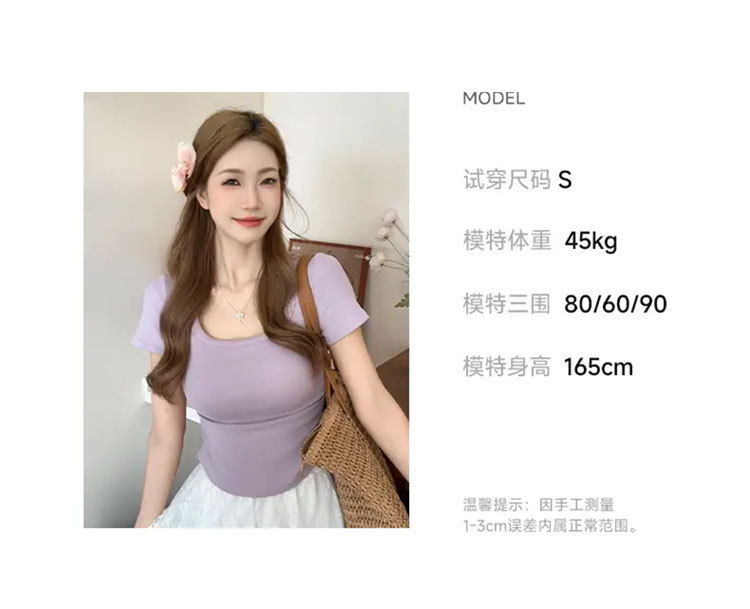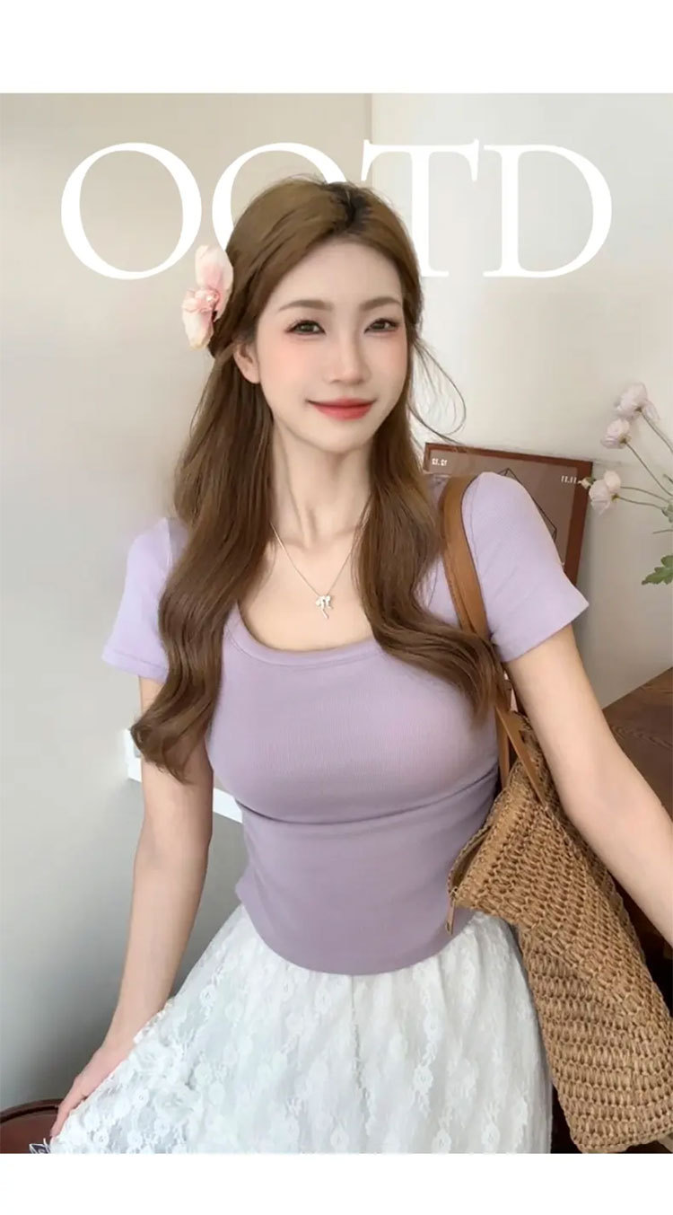 紫色短袖T恤女夏季2025年新款百搭修身正肩方领法式锁骨甜辣上衣