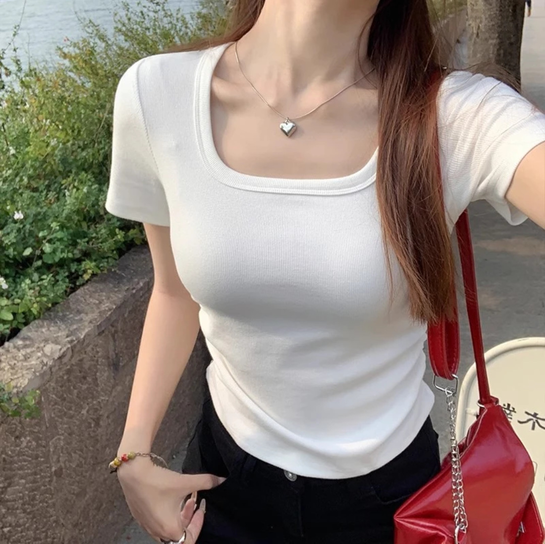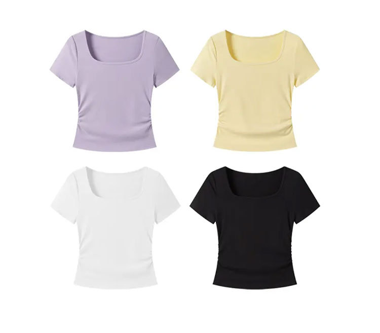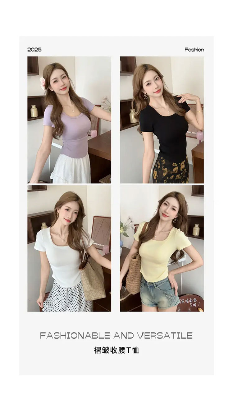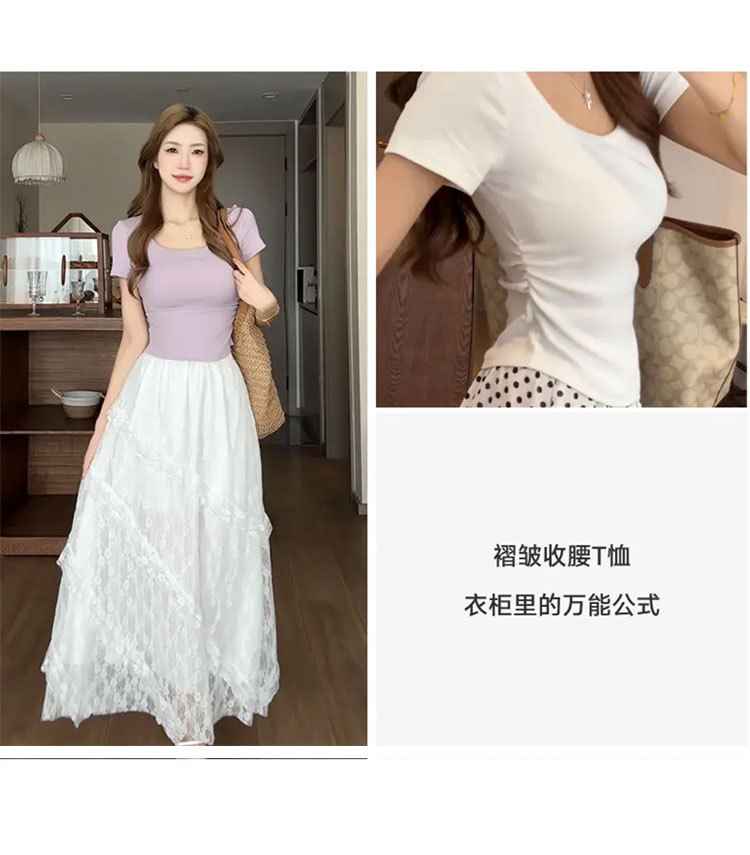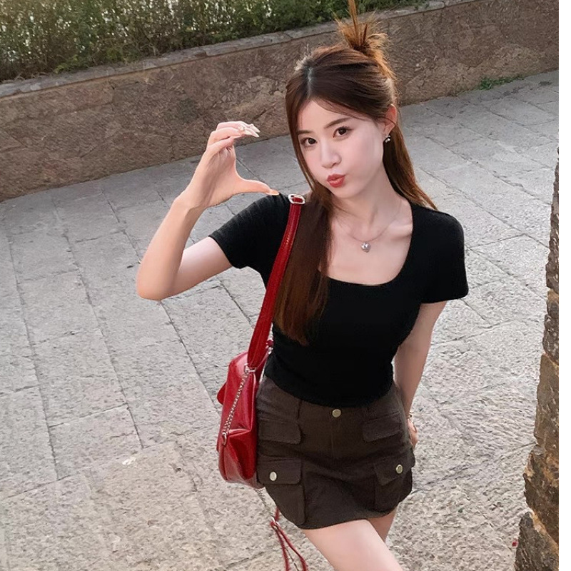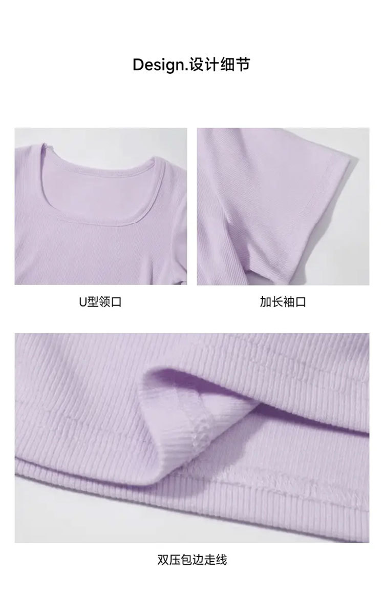 紫色短袖T恤女夏季2025年新款百搭修身正肩方领法式锁骨甜辣上衣