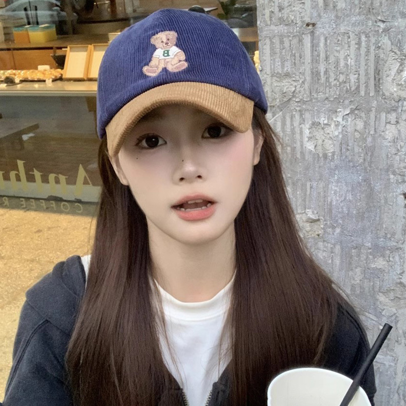 韩国可爱小熊刺绣棒球帽女冬季保暖灯芯绒拼色鸭舌帽女显脸小百搭