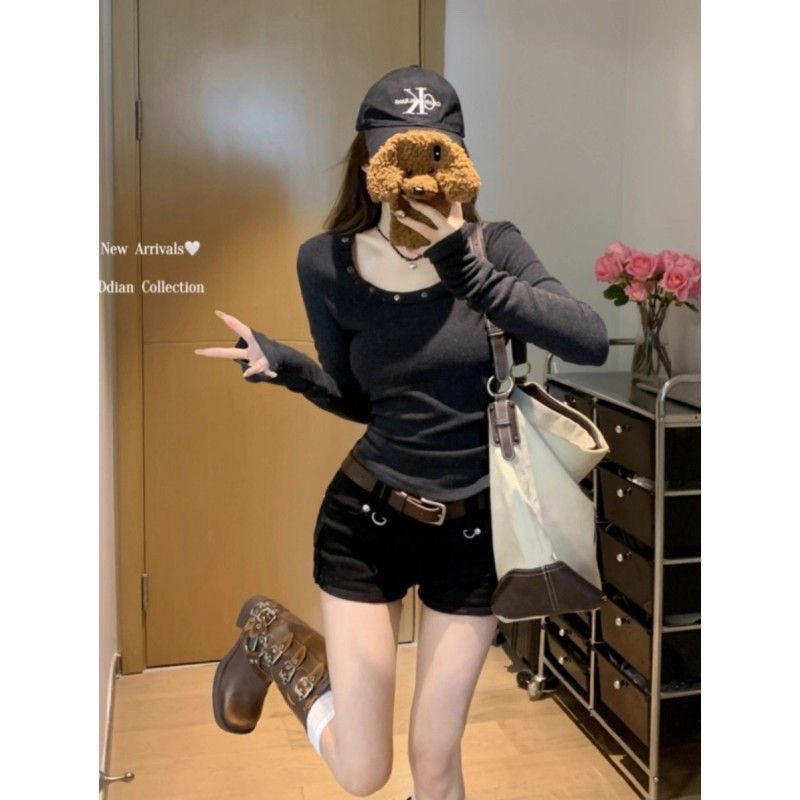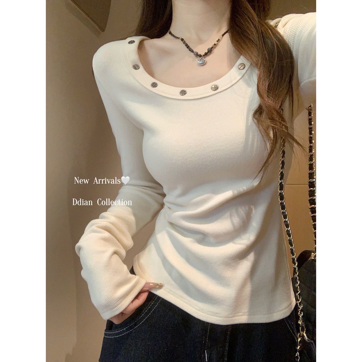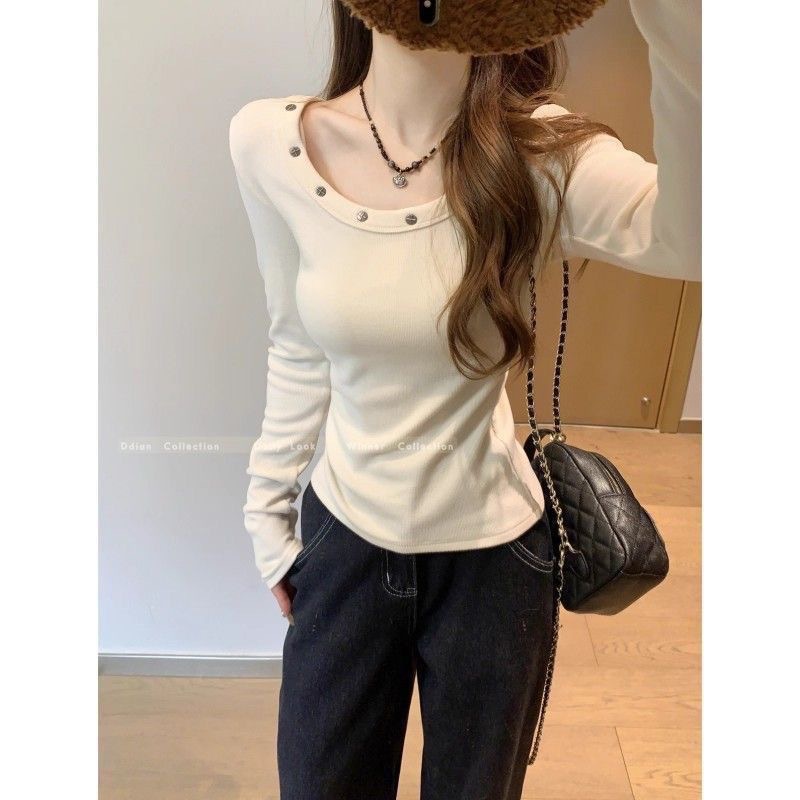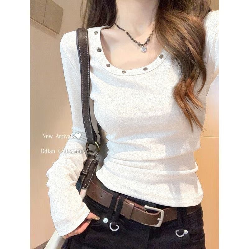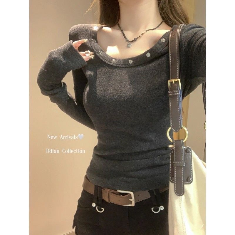 【德绒】正肩柳钉长袖t恤女春秋季修身显瘦收腰纯欲打底辣妹上衣