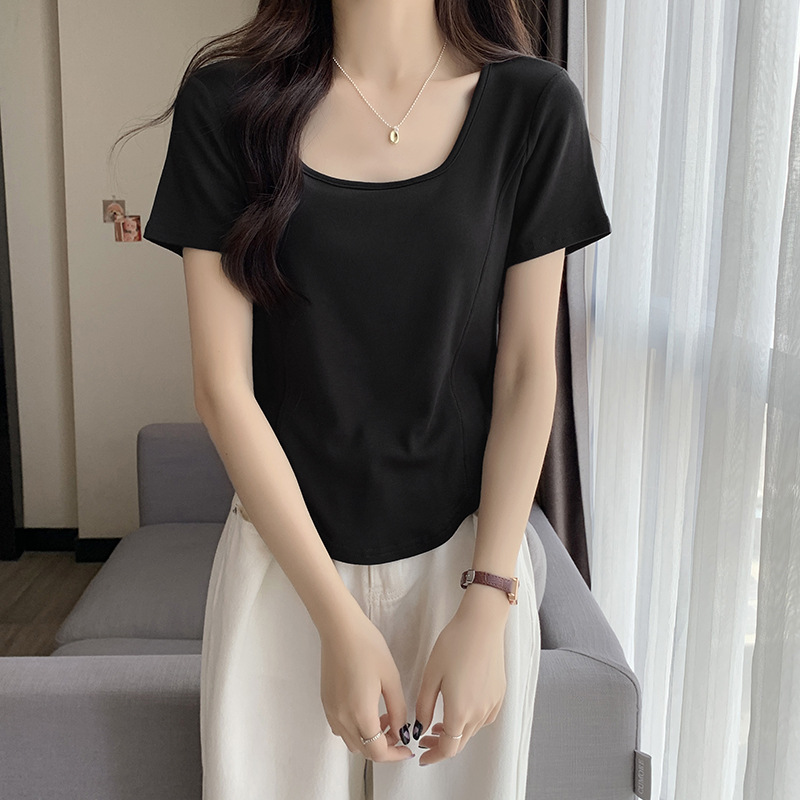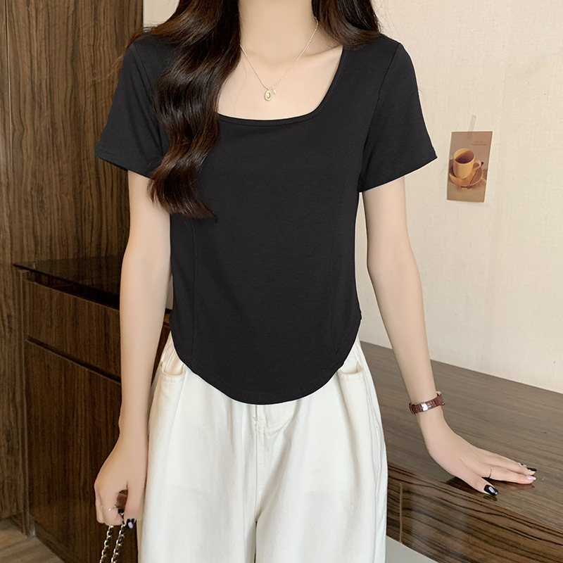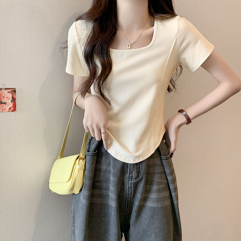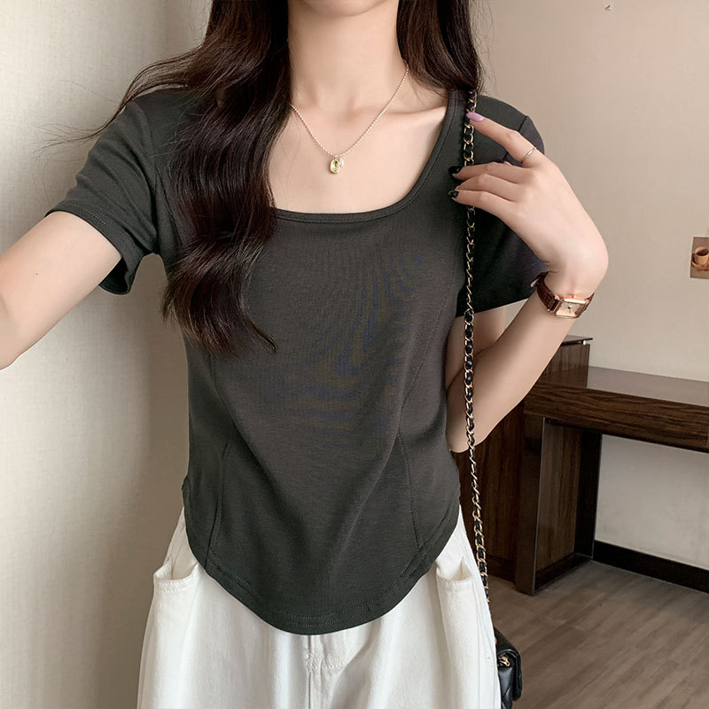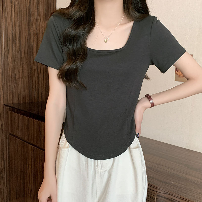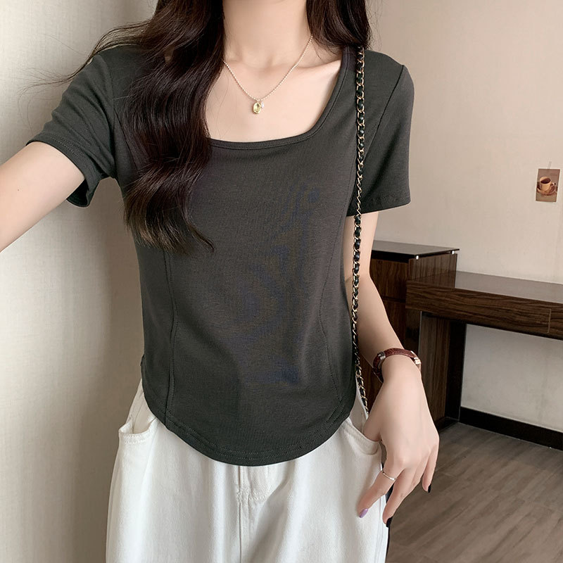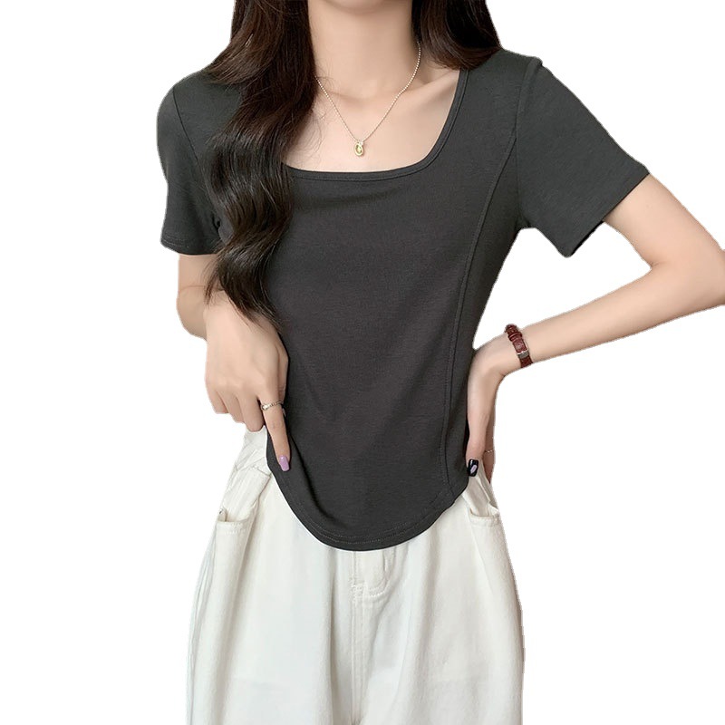 2025正肩方领短袖T恤女装纯色夏季新款上衣洋气减龄鱼骨短款小衫