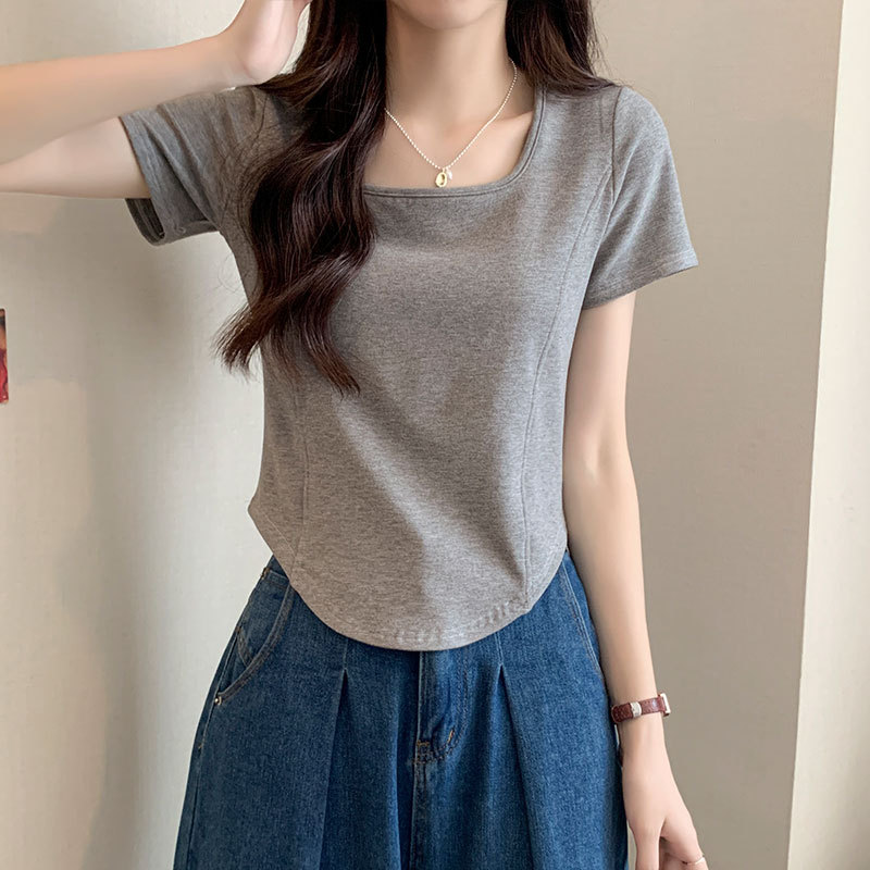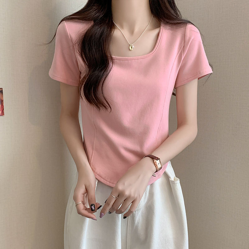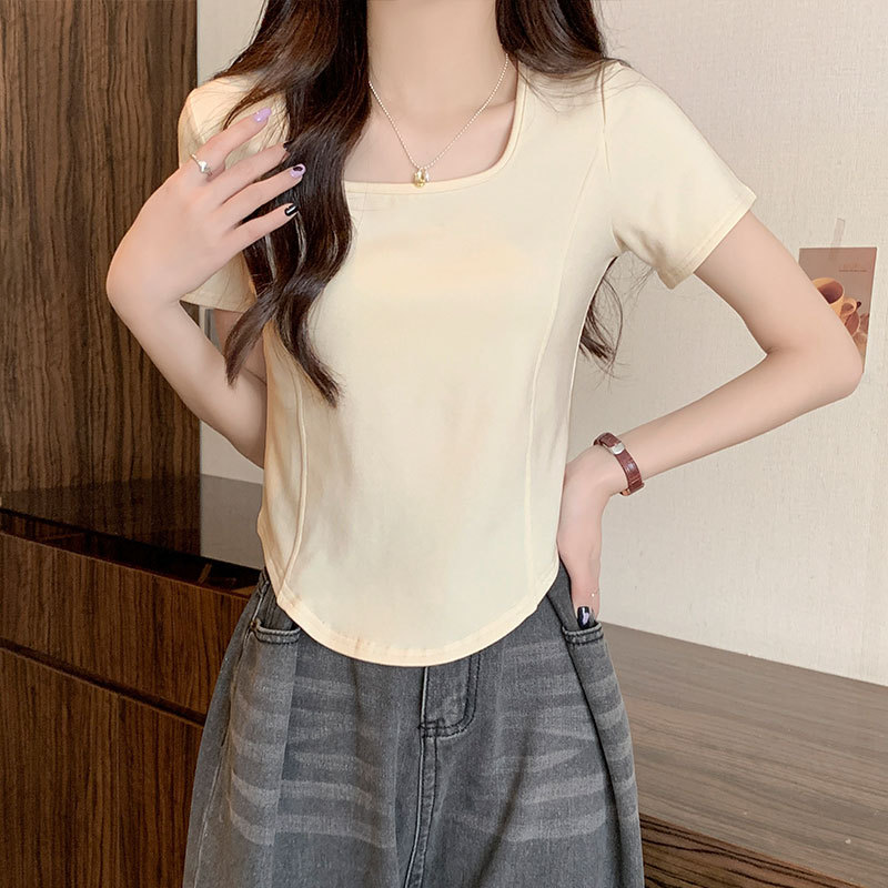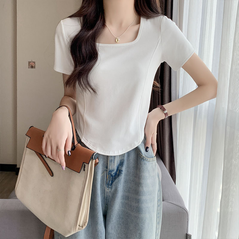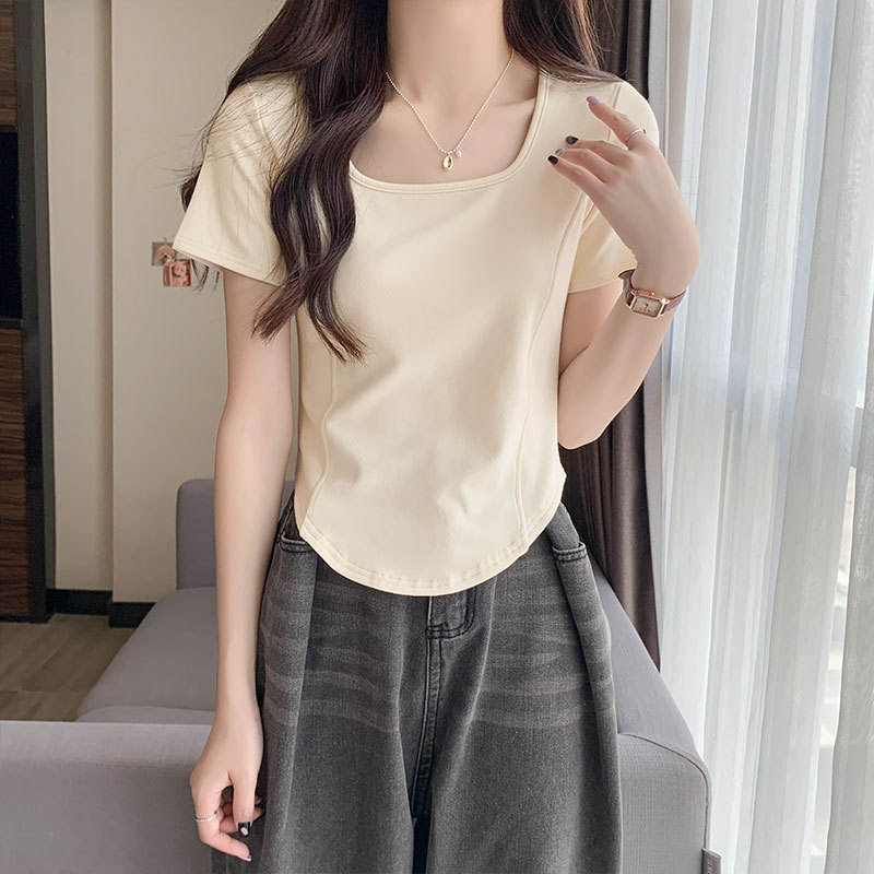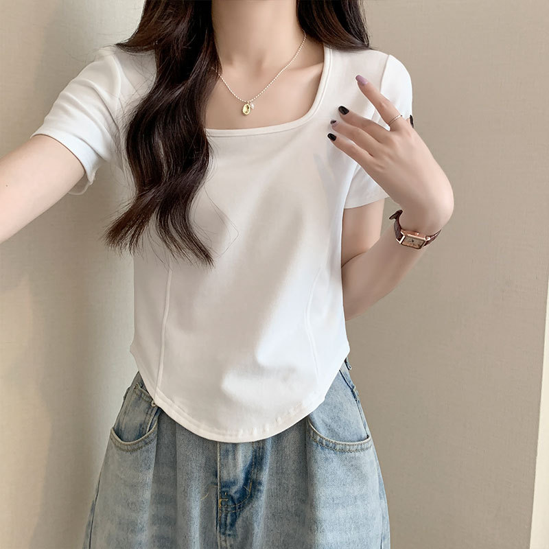 2025正肩方领短袖T恤女装纯色夏季新款上衣洋气减龄鱼骨短款小衫