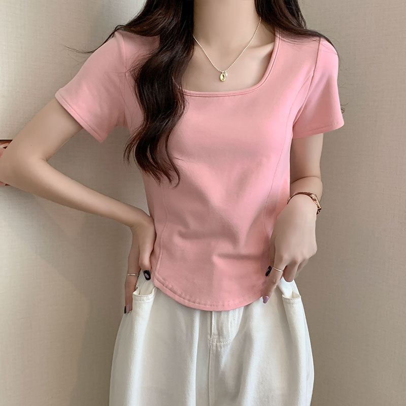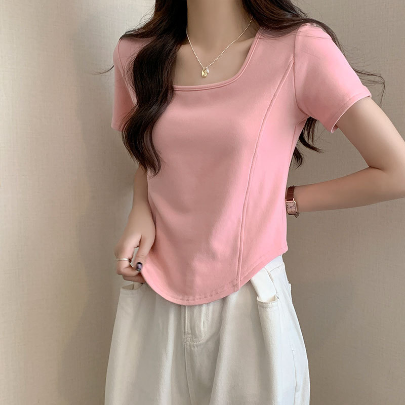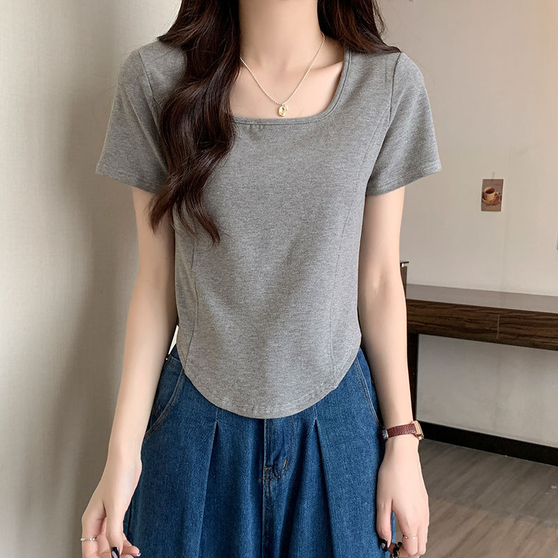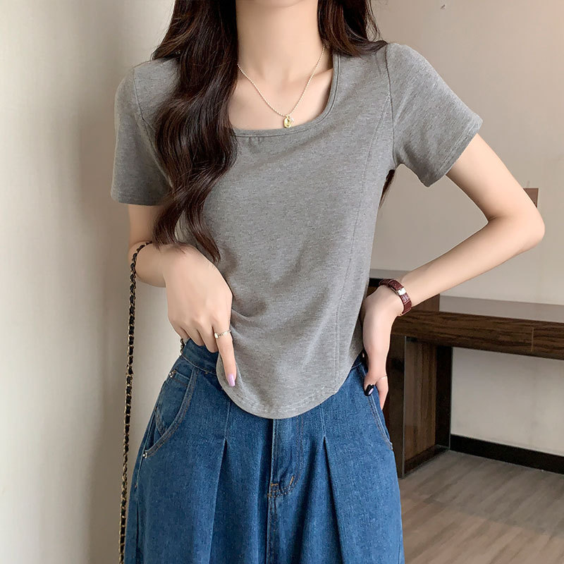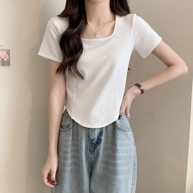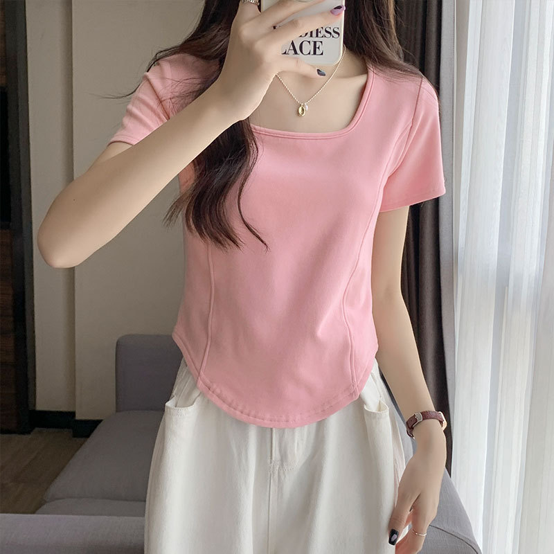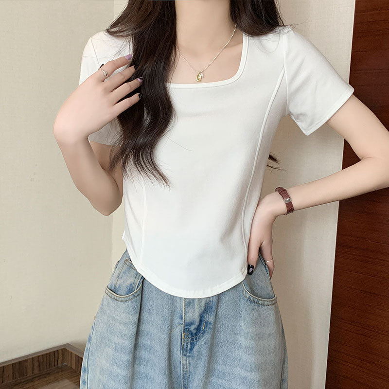 2025正肩方领短袖T恤女装纯色夏季新款上衣洋气减龄鱼骨短款小衫