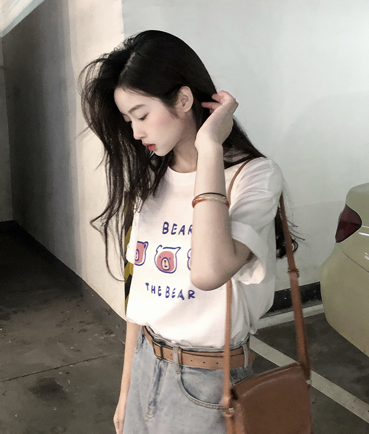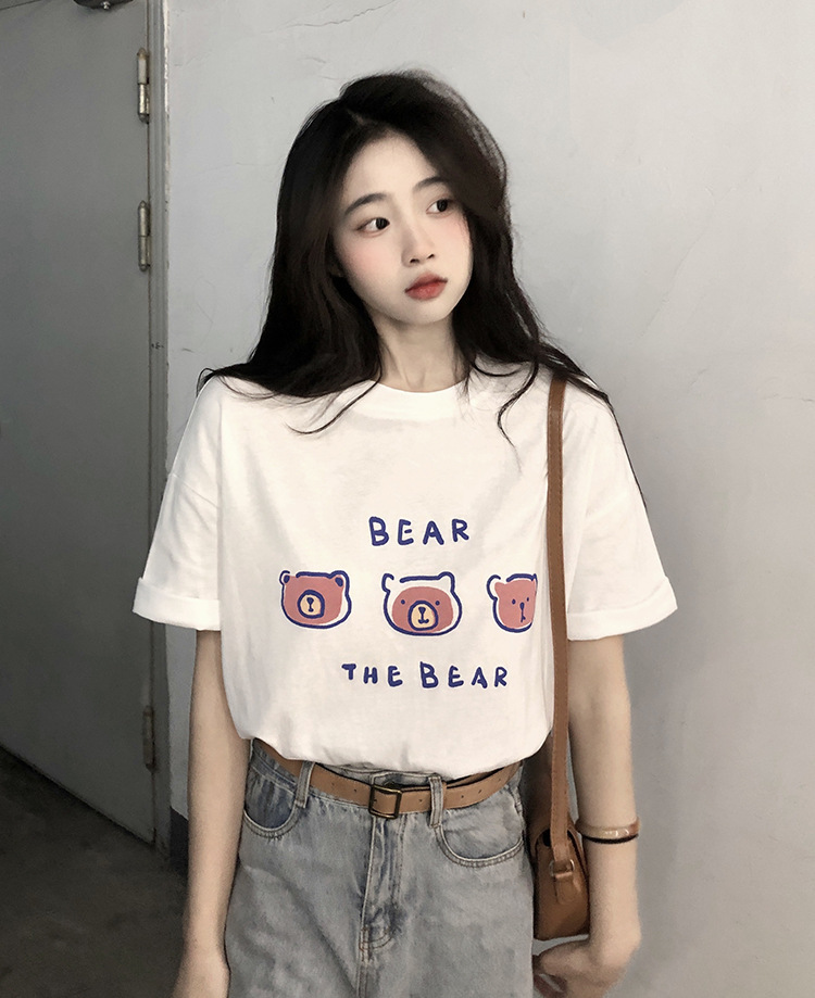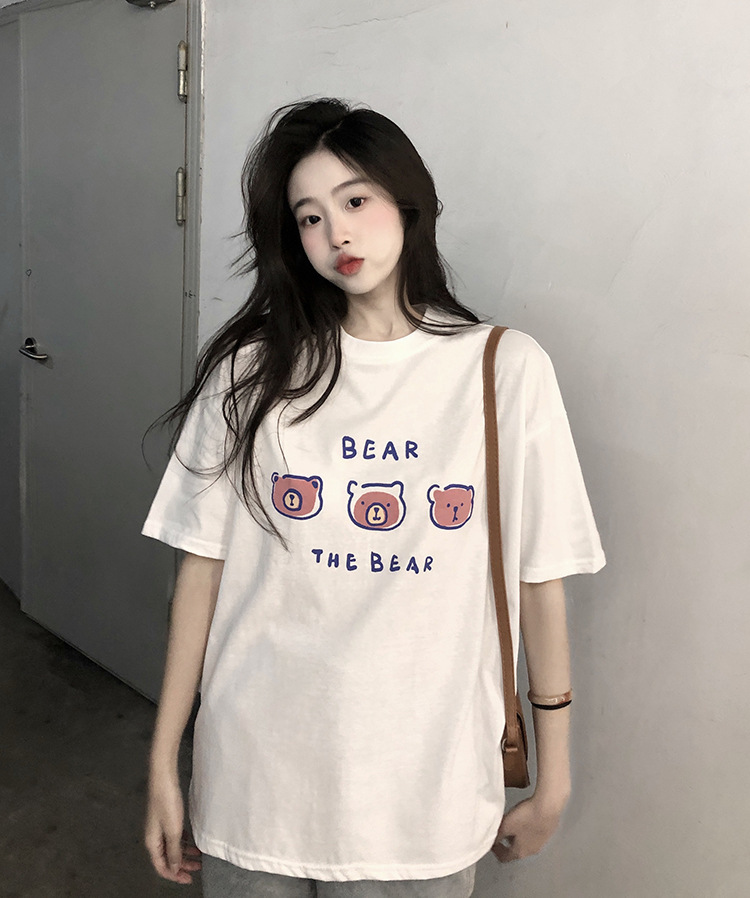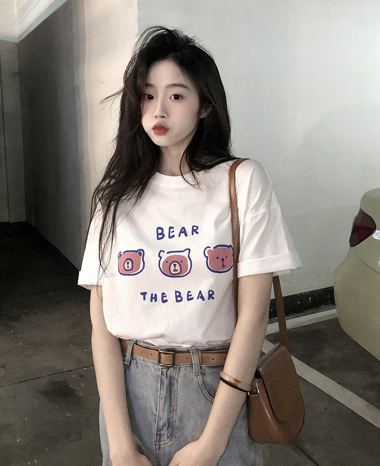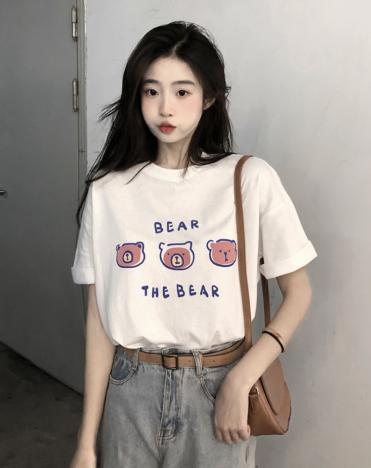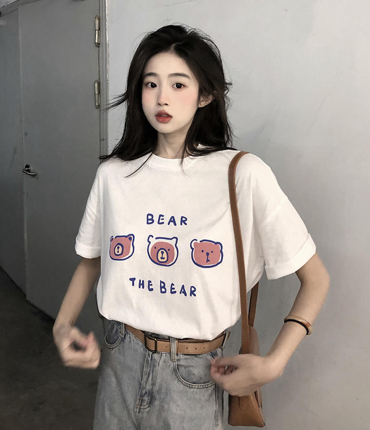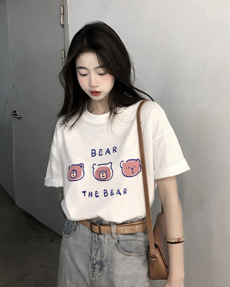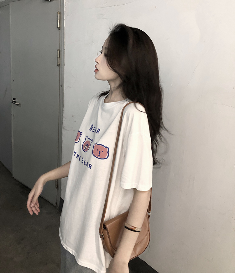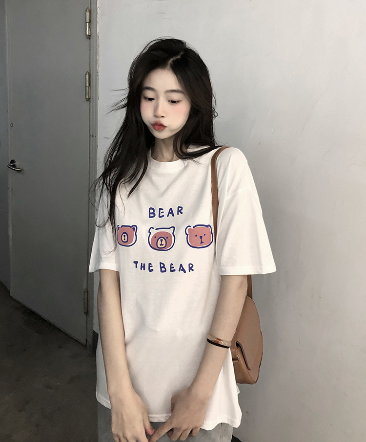 白色短袖t恤女2025夏季新款韩版宽松百搭超火中长款小熊印花上衣