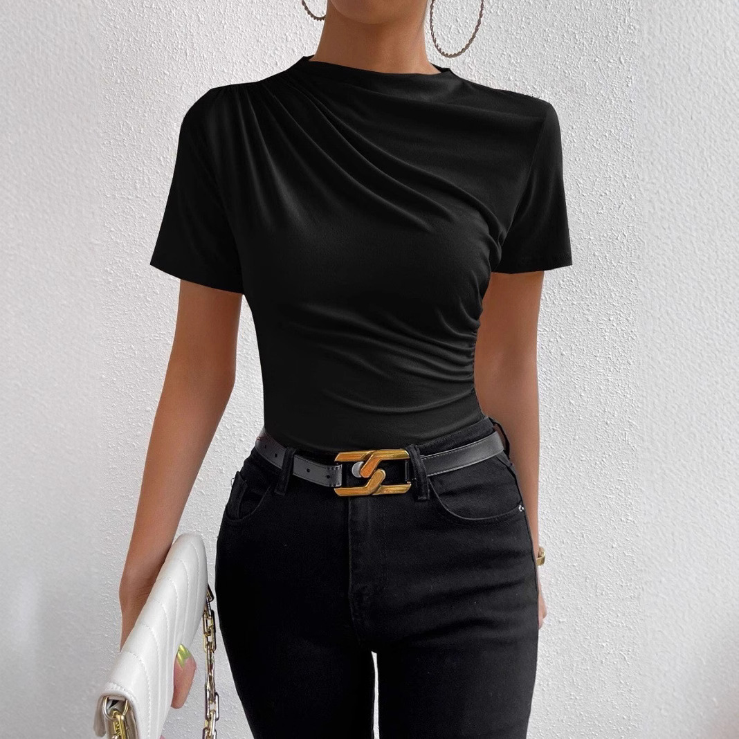 亚马逊欧美跨境速卖通独立站2026春夏小高领抽褶修身短袖女士T恤