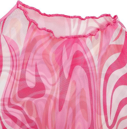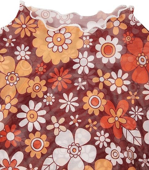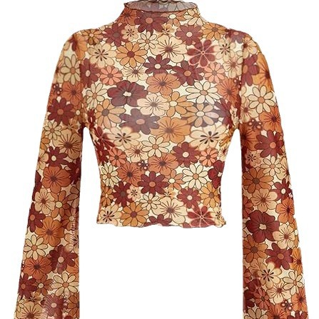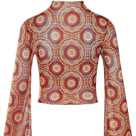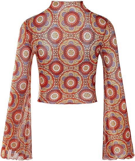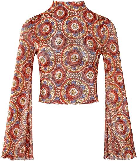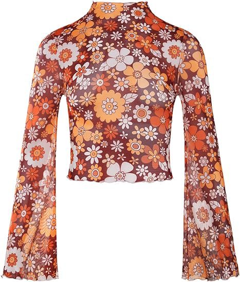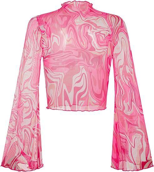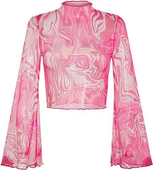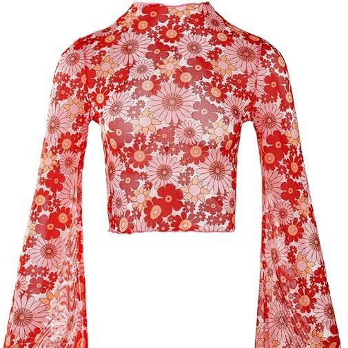 2023欧美女式喇叭袖生菜饰边企领花卉网眼上衣露脐 T 恤