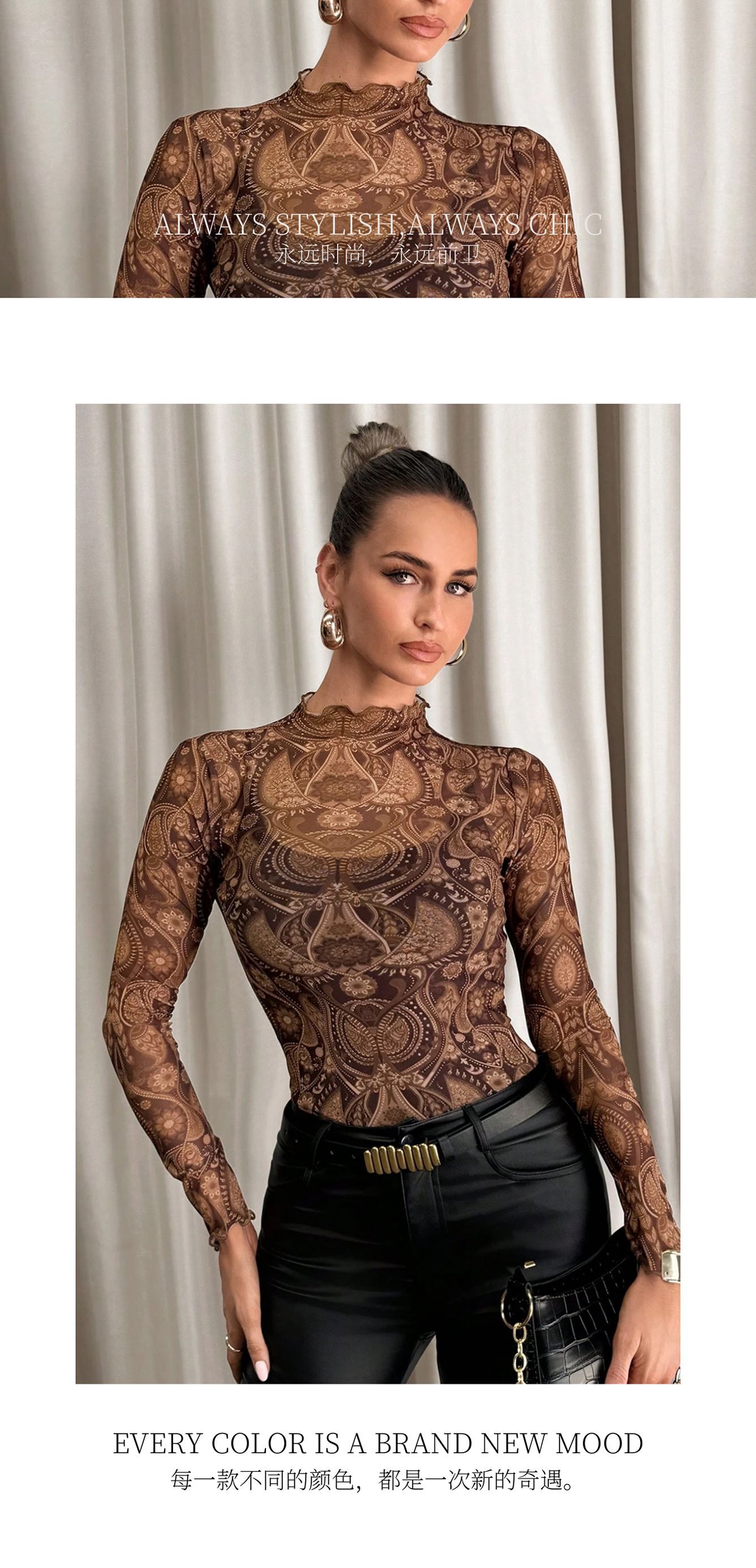 欧美跨境亚马逊2026年女式性感感豹纹网眼木耳边紧身衣T恤上衣女