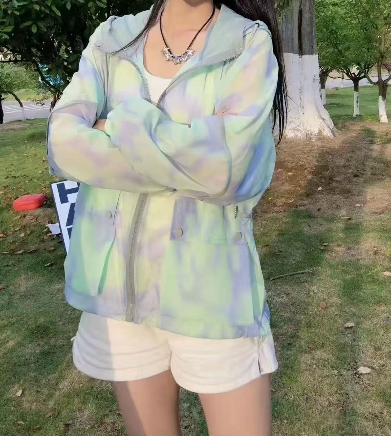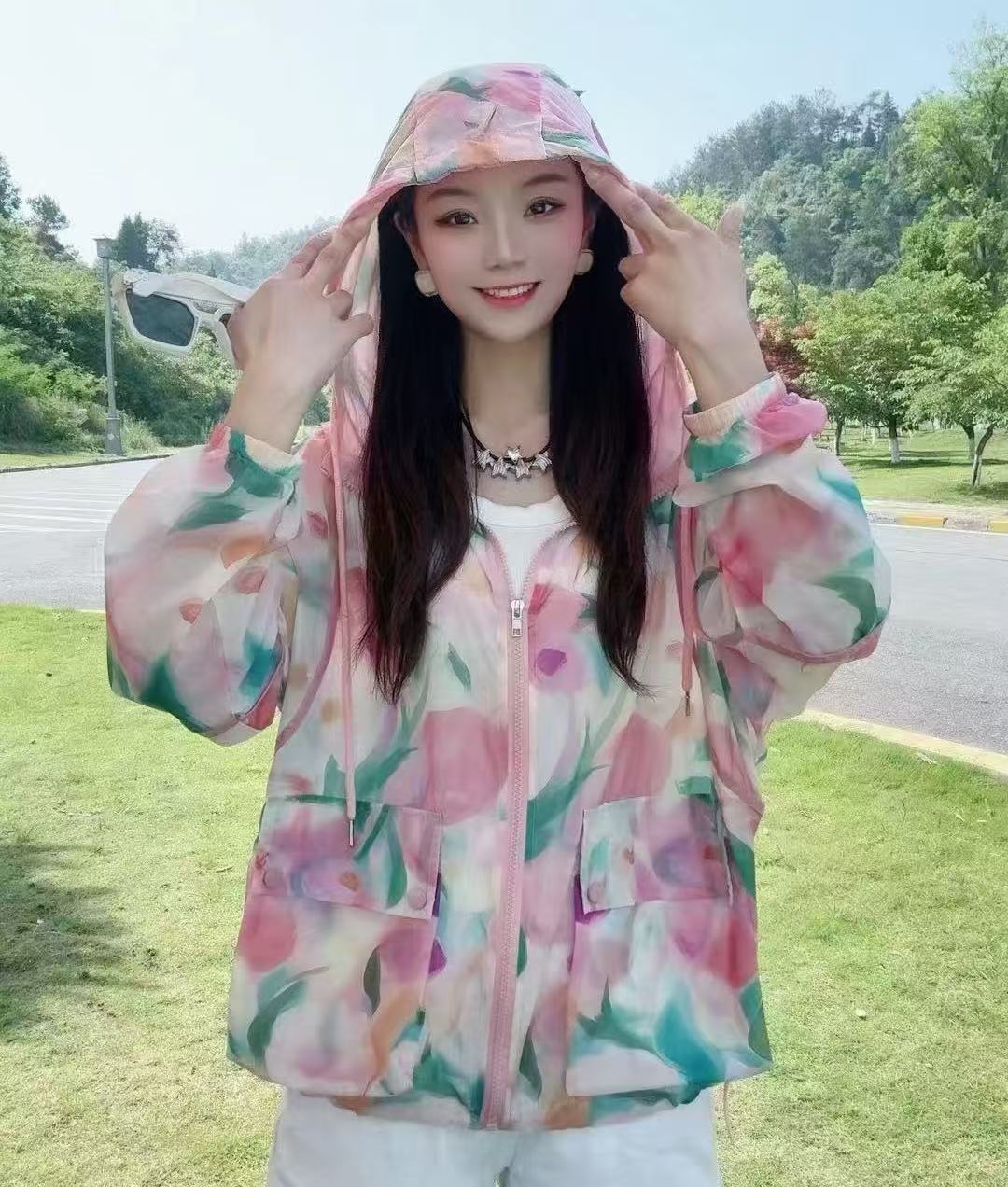 韩系冰丝连帽防晒衣韩版宽松薄款碎花包边开衫上衣遮阳休闲百搭
