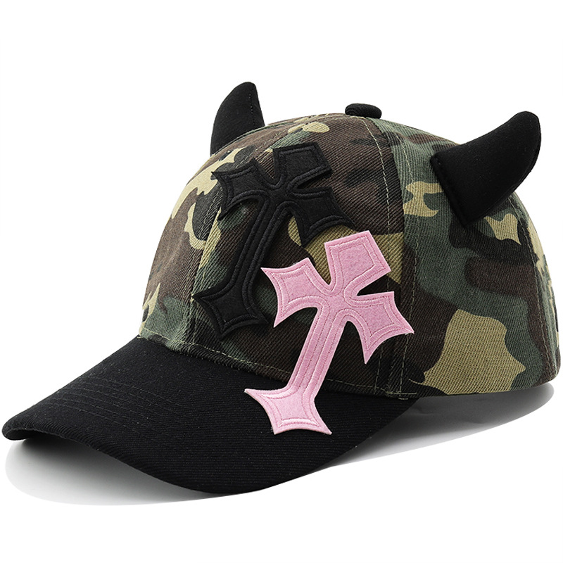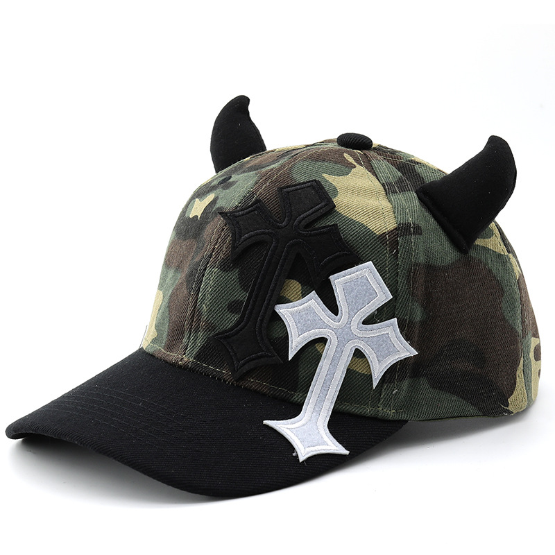 手工DIY恶魔十字架贴布刺绣迷彩牛角棒球帽男女可调节鸭舌帽子