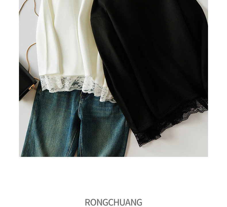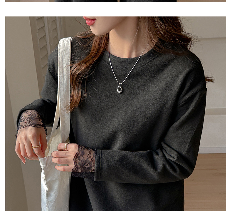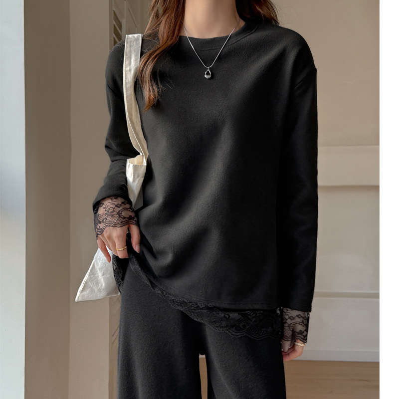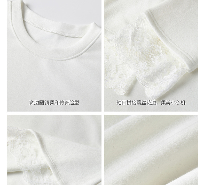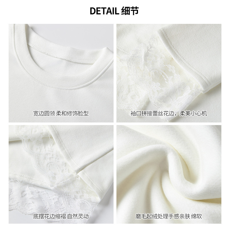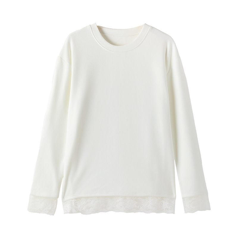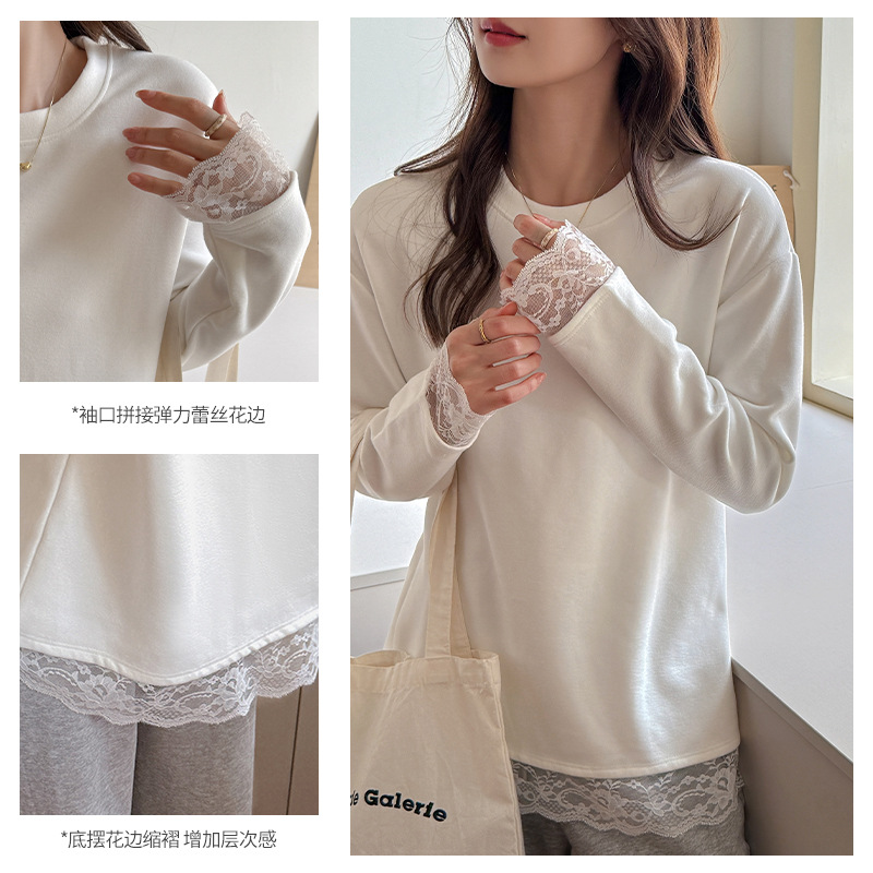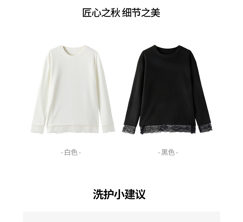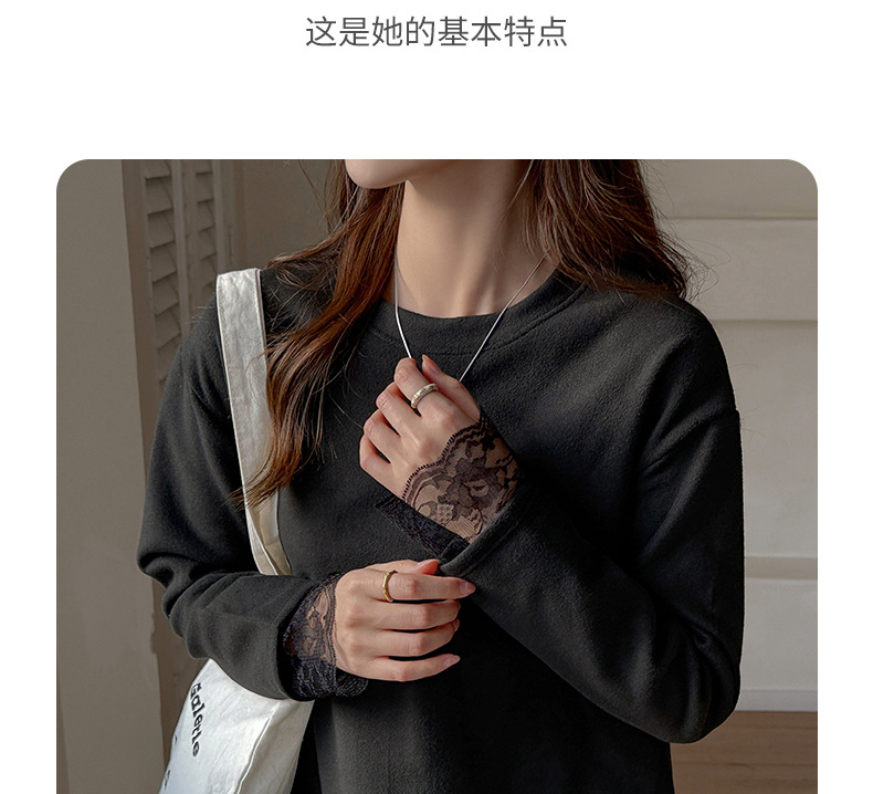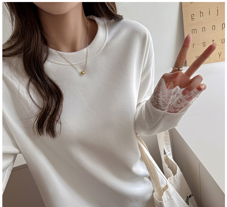 秋冬季蕾丝拼接德绒加厚磨毛德绒圆领长袖t恤宽松版设计感打底衫