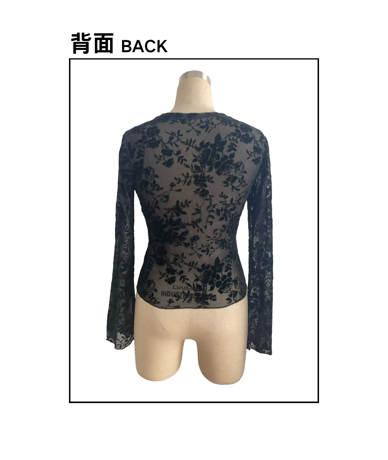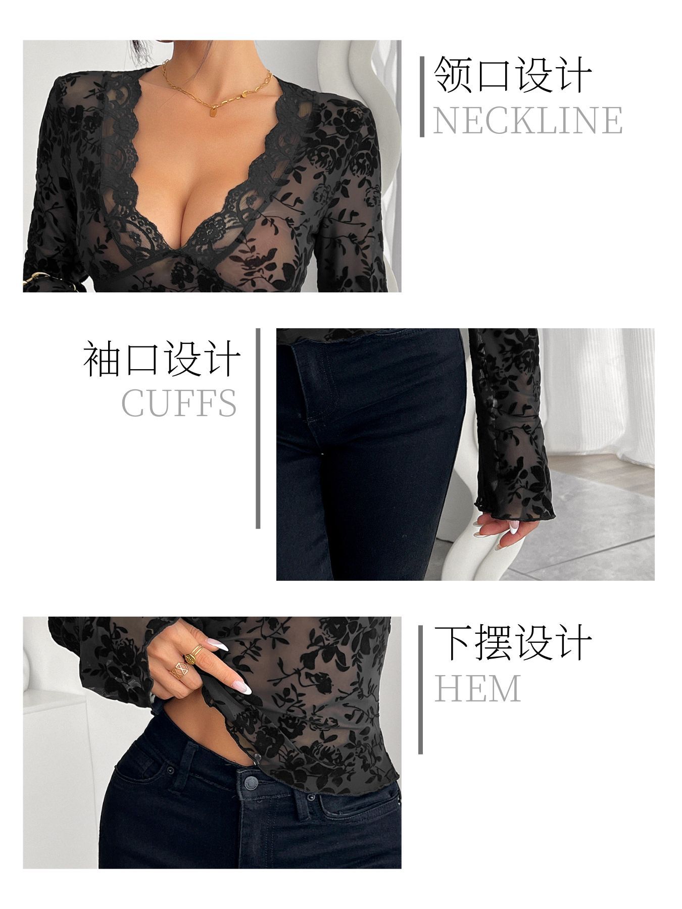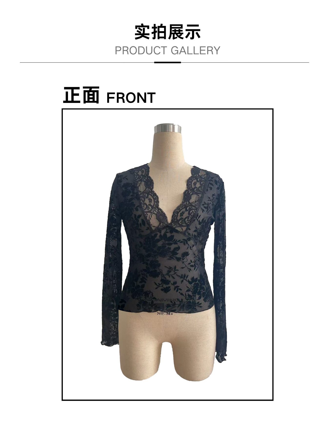 欧美跨境亚马逊2026年春季新款女式V领蕾丝拼网布喇叭袖T恤上衣女