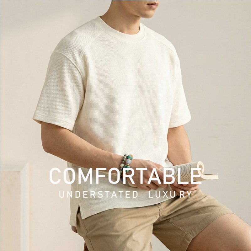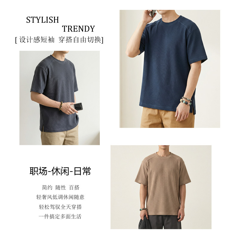 登爵男装220g克华夫格短袖T恤插肩袖下摆开叉纯色夏季体恤衫批发