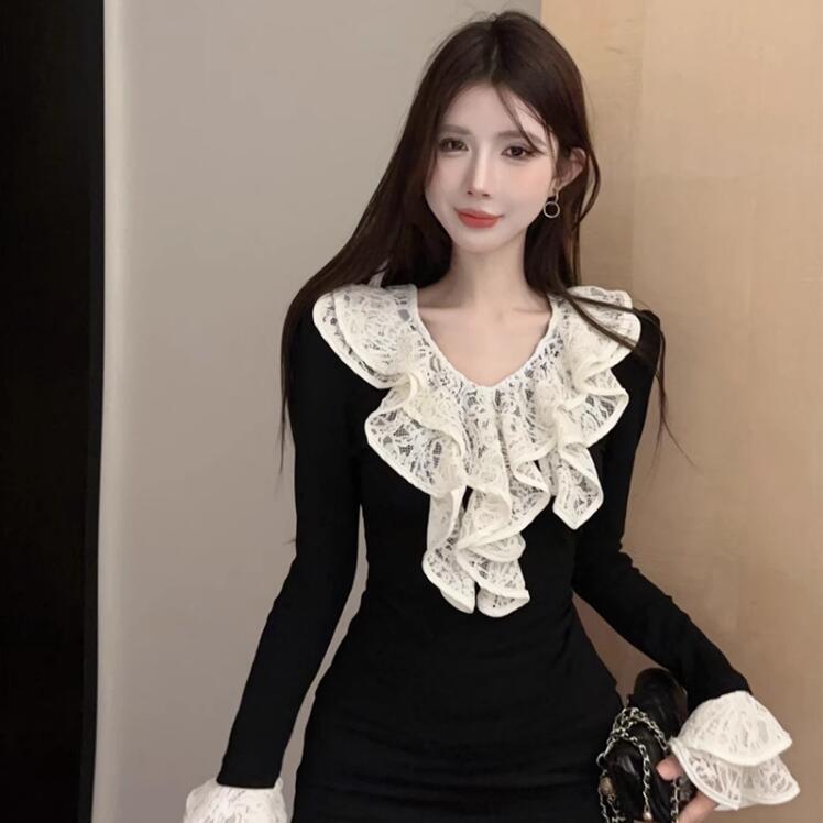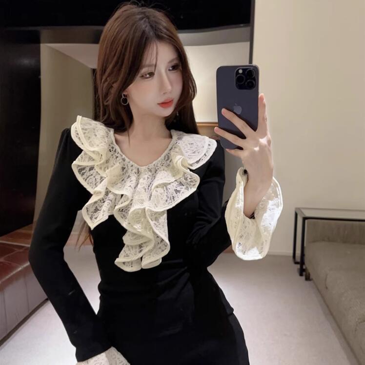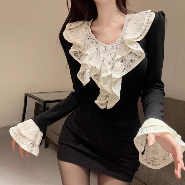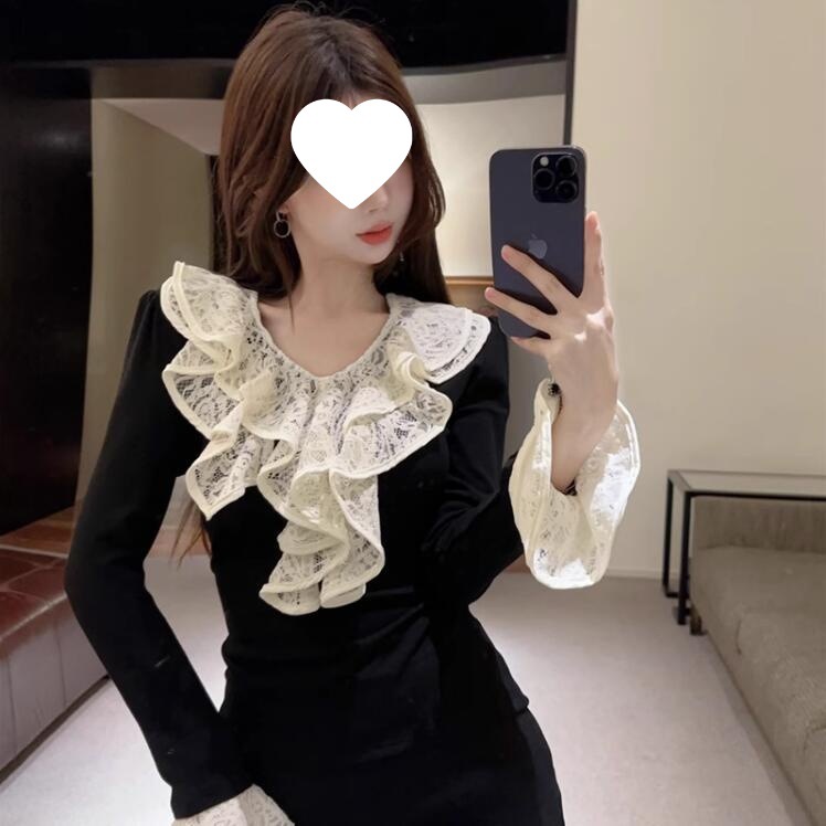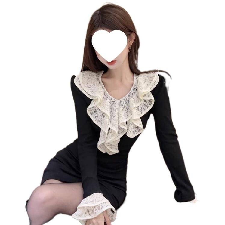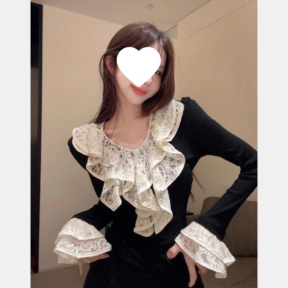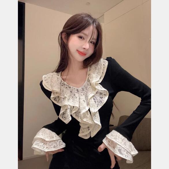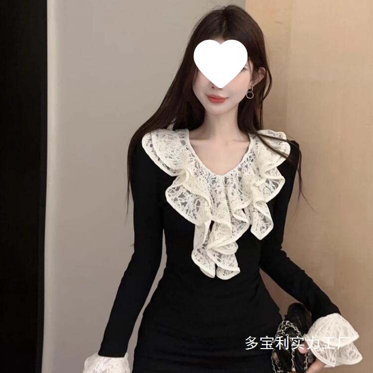 蕾丝荷叶边喇叭袖长袖v领T恤女春冬拼接撞色法式气质小衫修身上衣