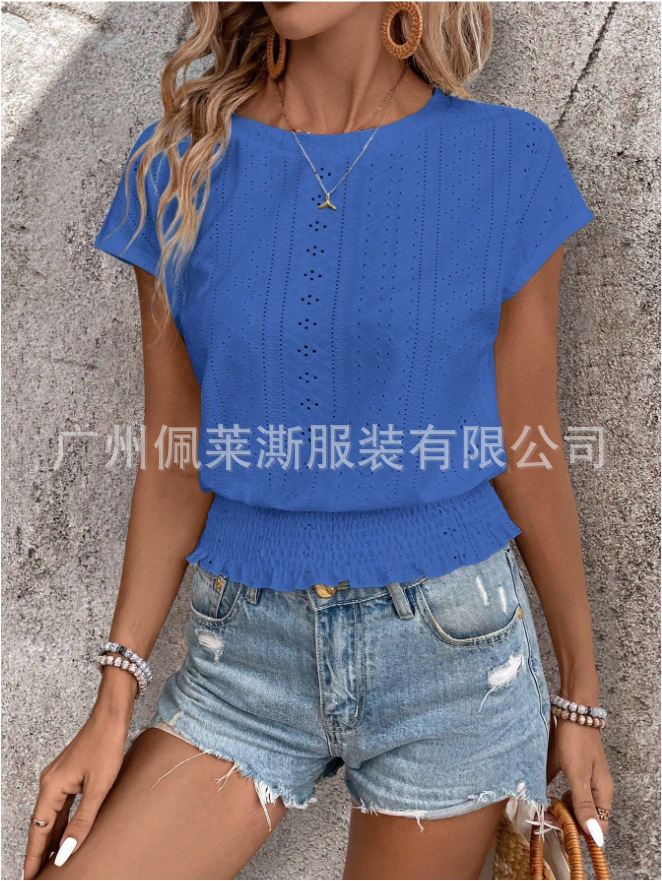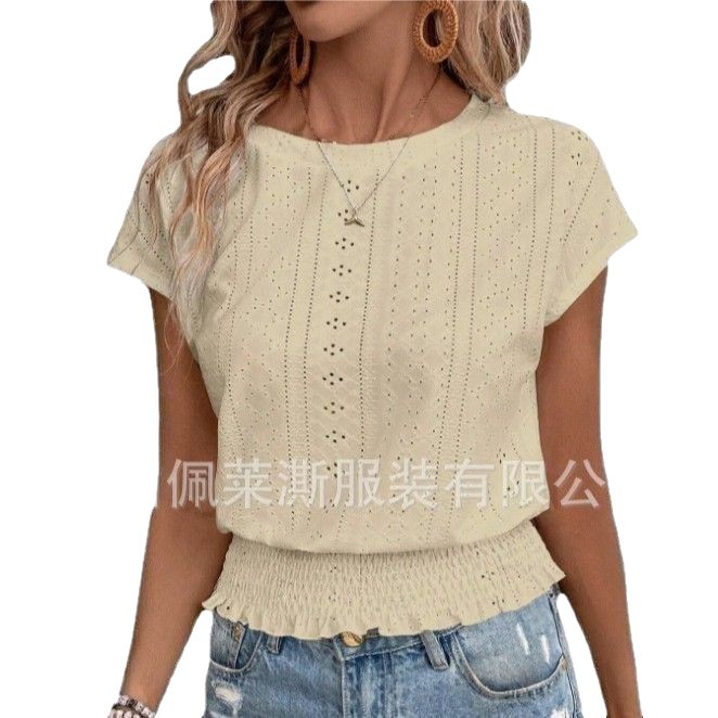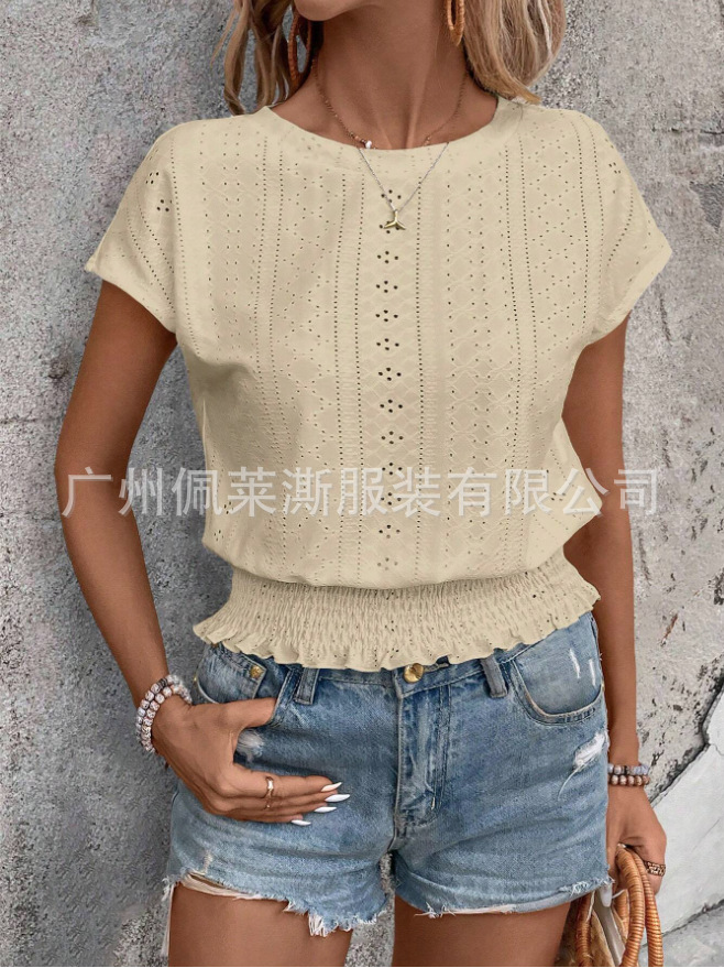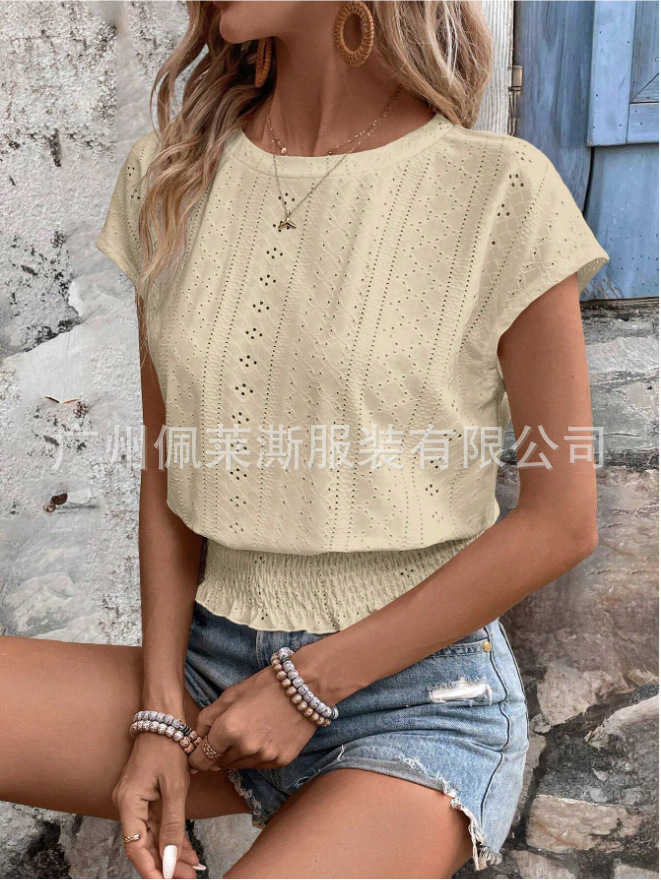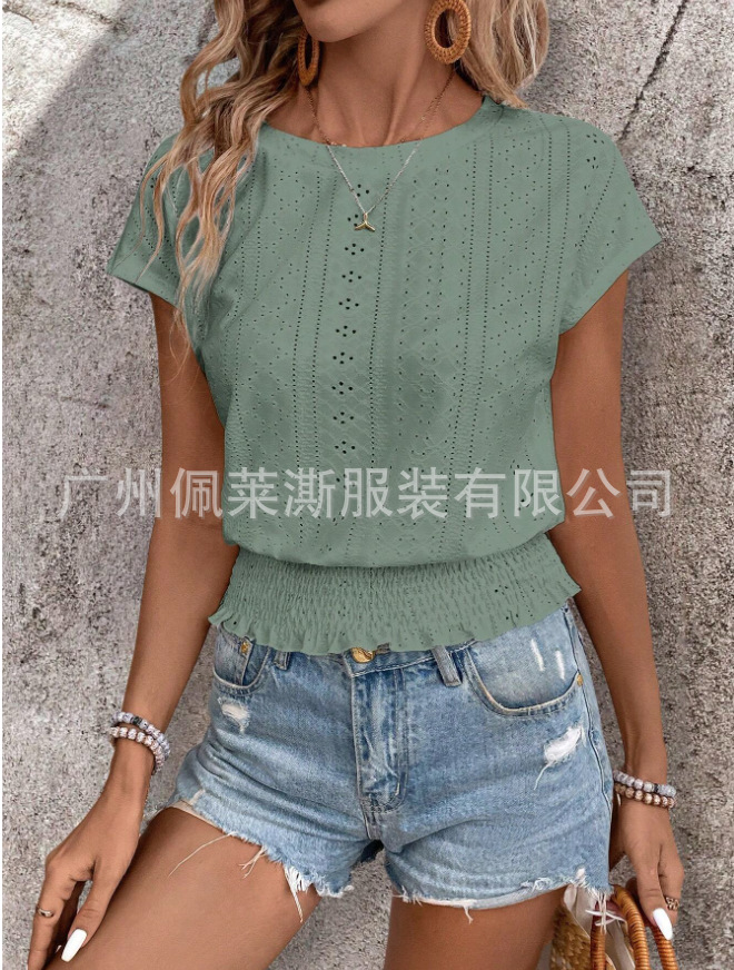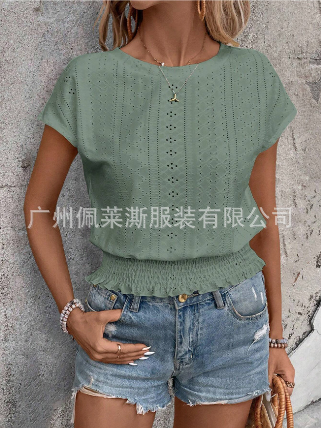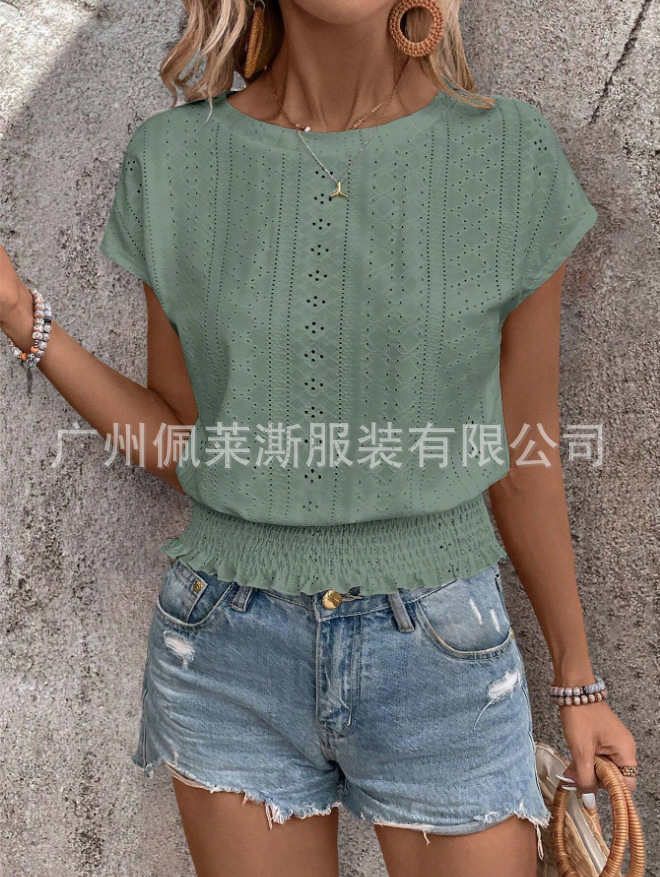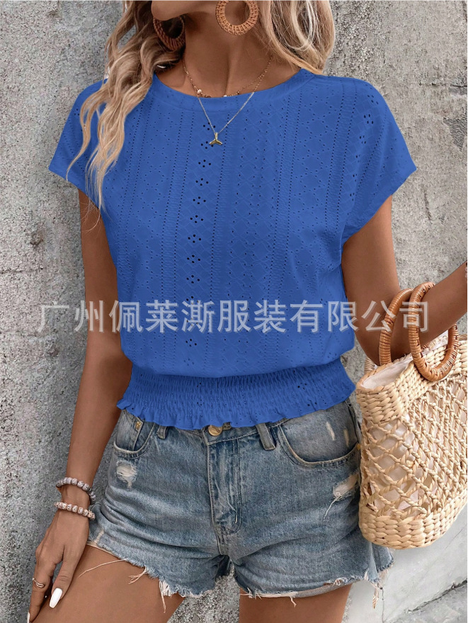 2026春夏季亚马逊提花纯色圆领打揽镂空蝙蝠短袖T恤通勤蝙蝠袖
