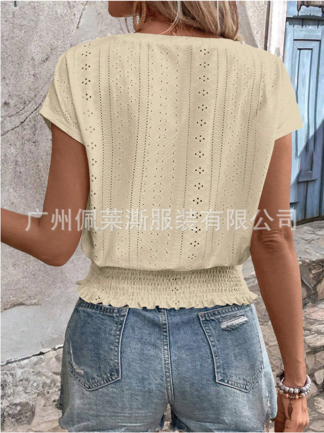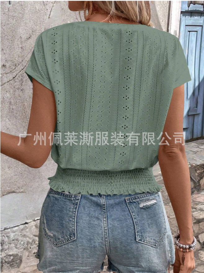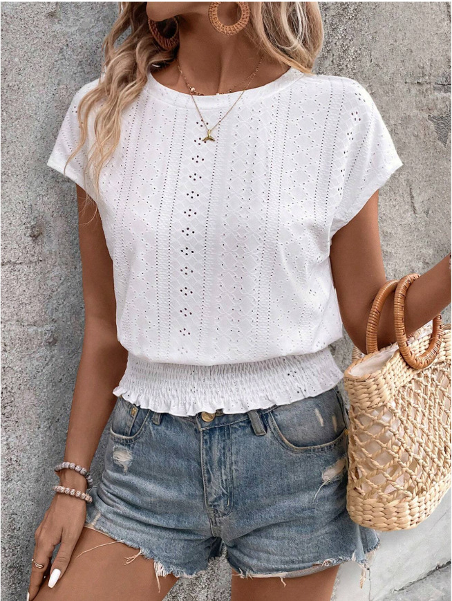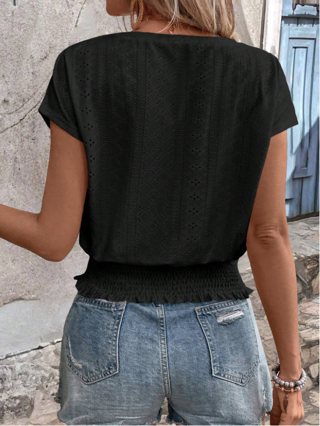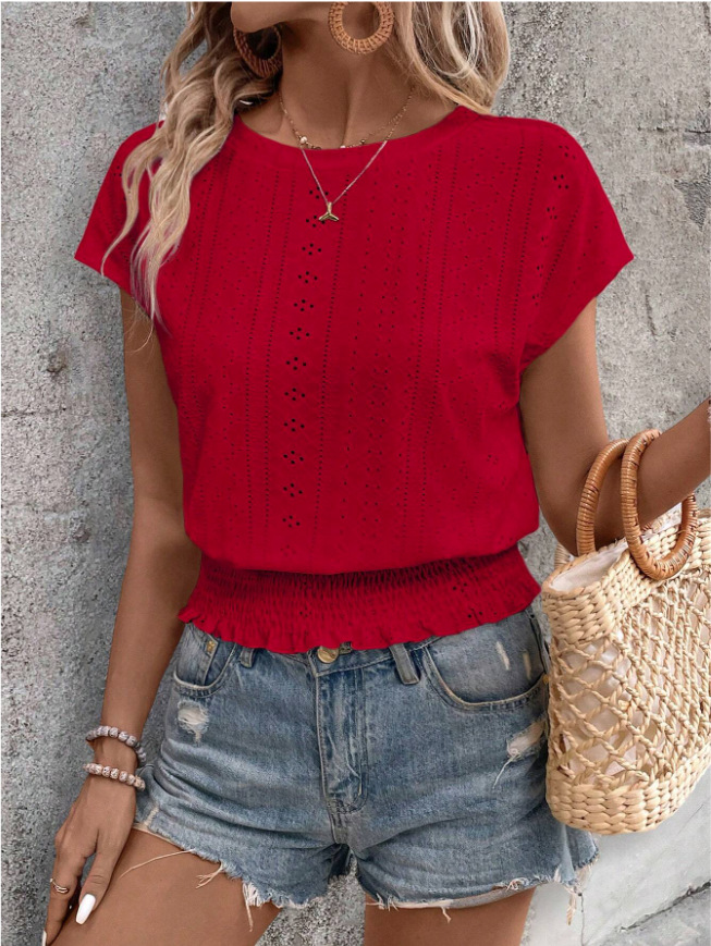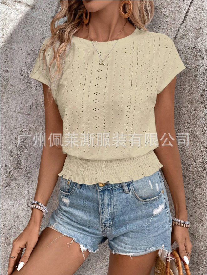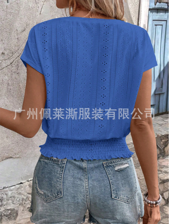 2026春夏季亚马逊提花纯色圆领打揽镂空蝙蝠短袖T恤通勤蝙蝠袖