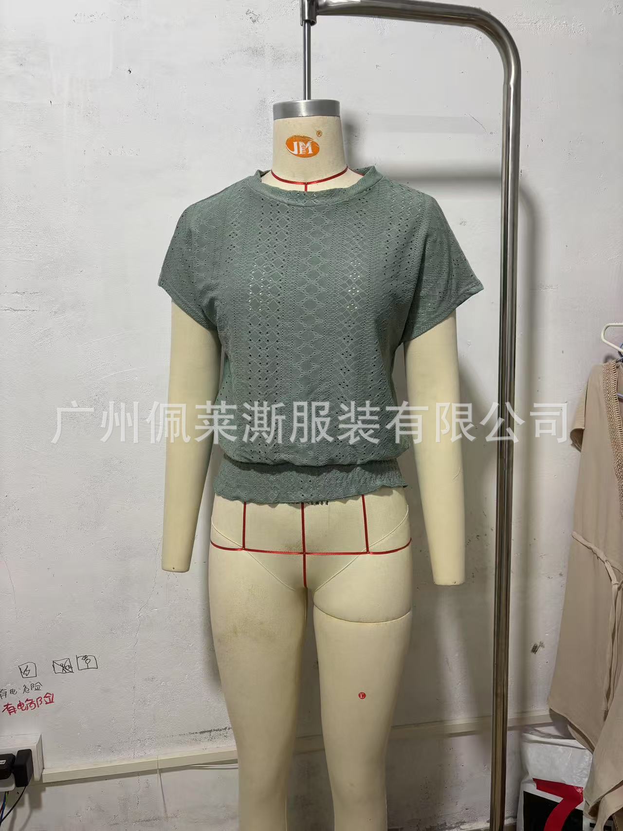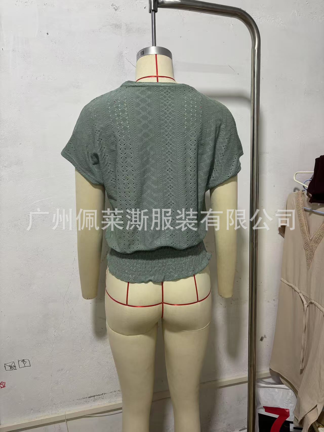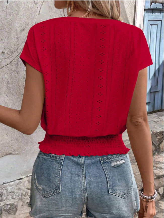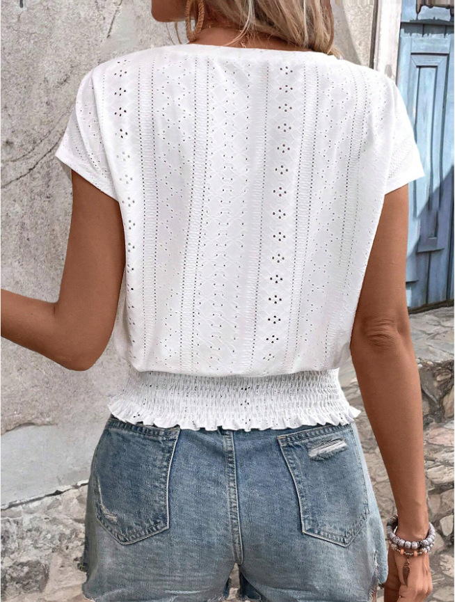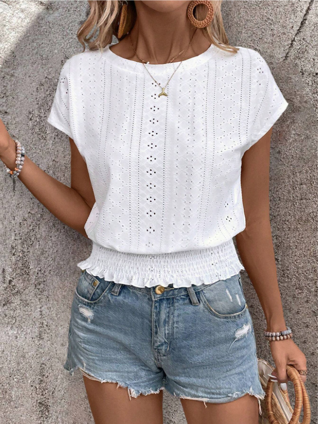 2026春夏季亚马逊提花纯色圆领打揽镂空蝙蝠短袖T恤通勤蝙蝠袖