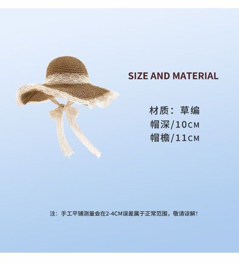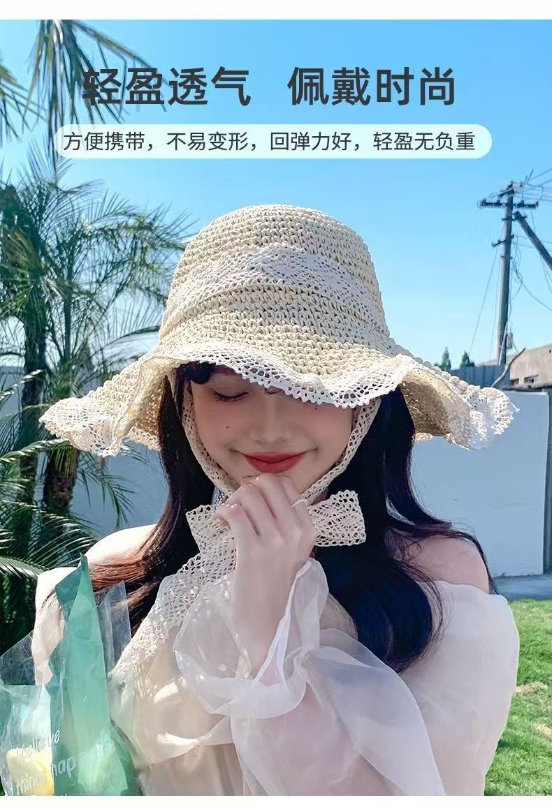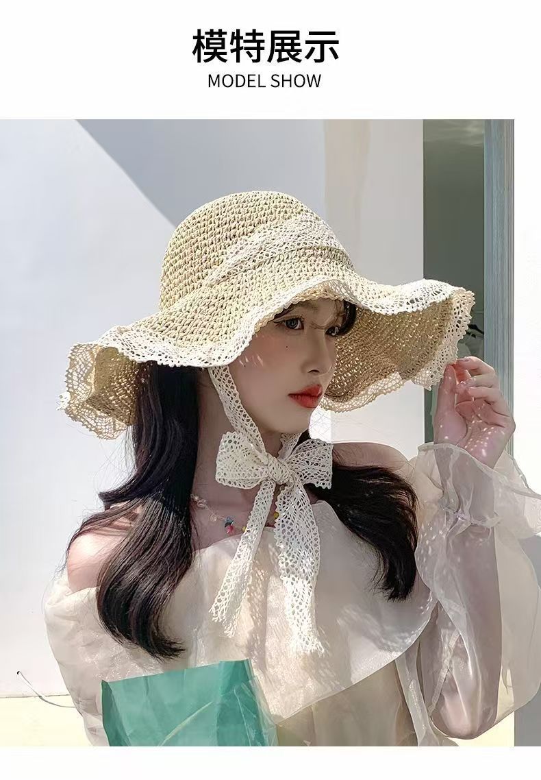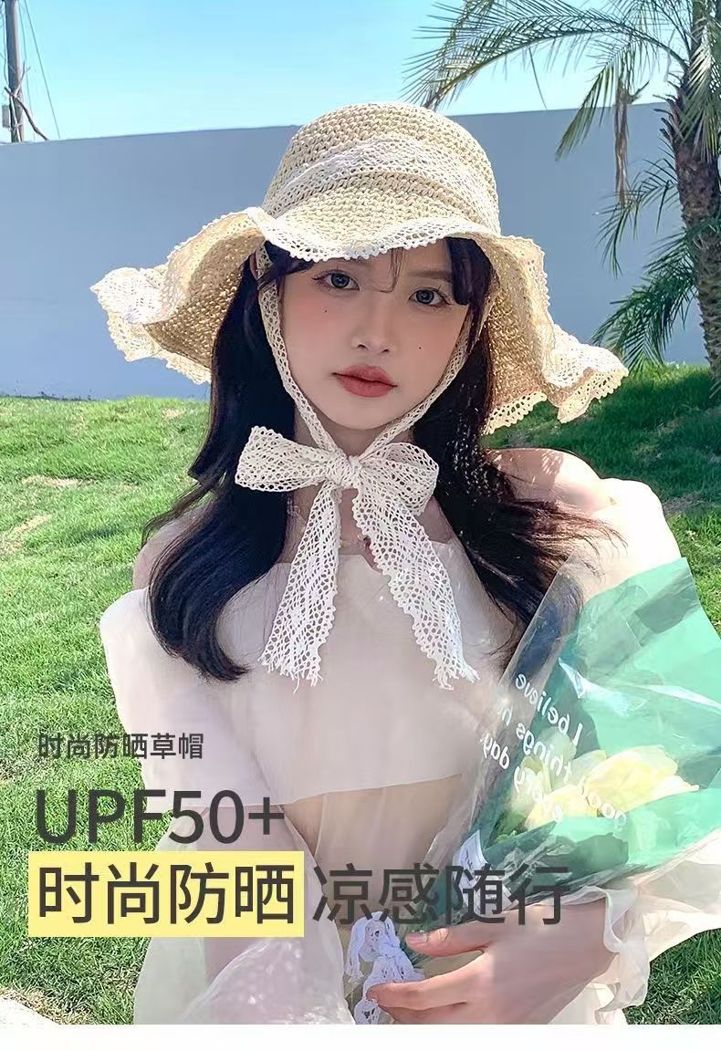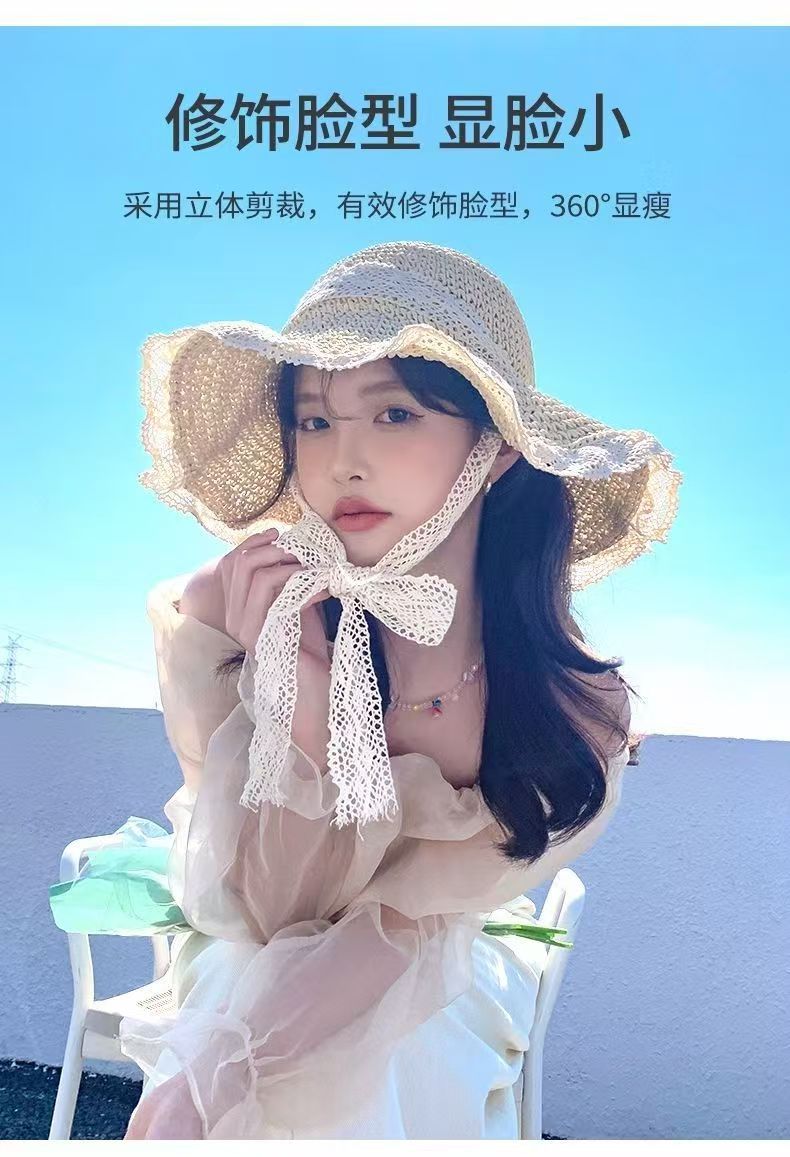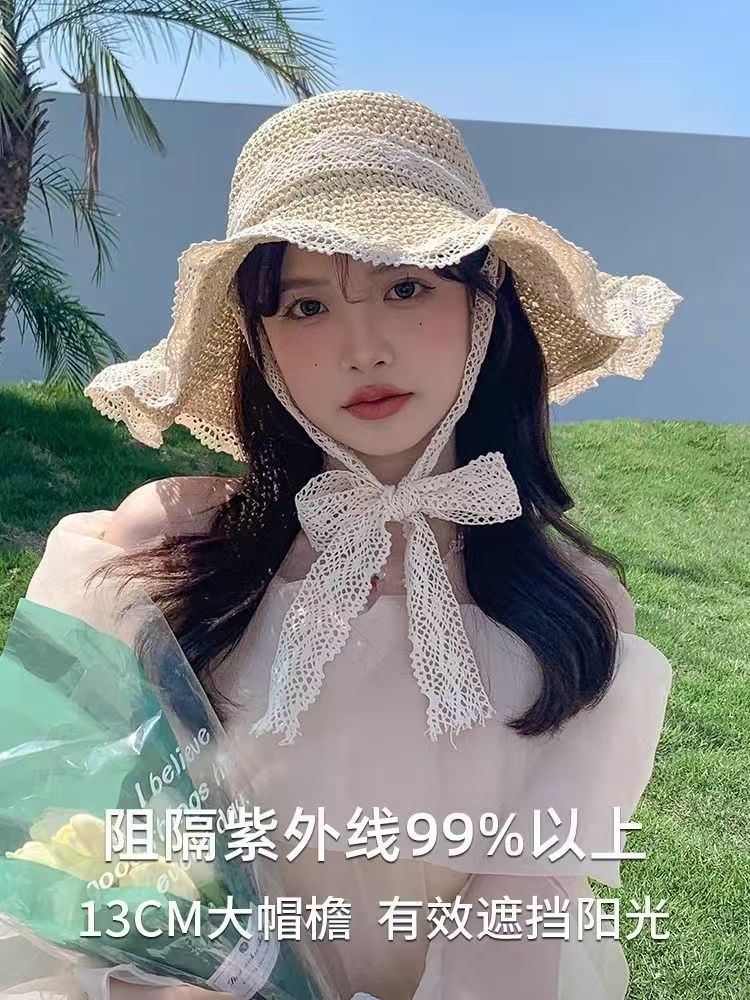 【草编材质】2025夏季新款法式草帽女透气蕾丝花边镂空防晒沙滩帽