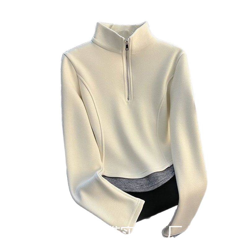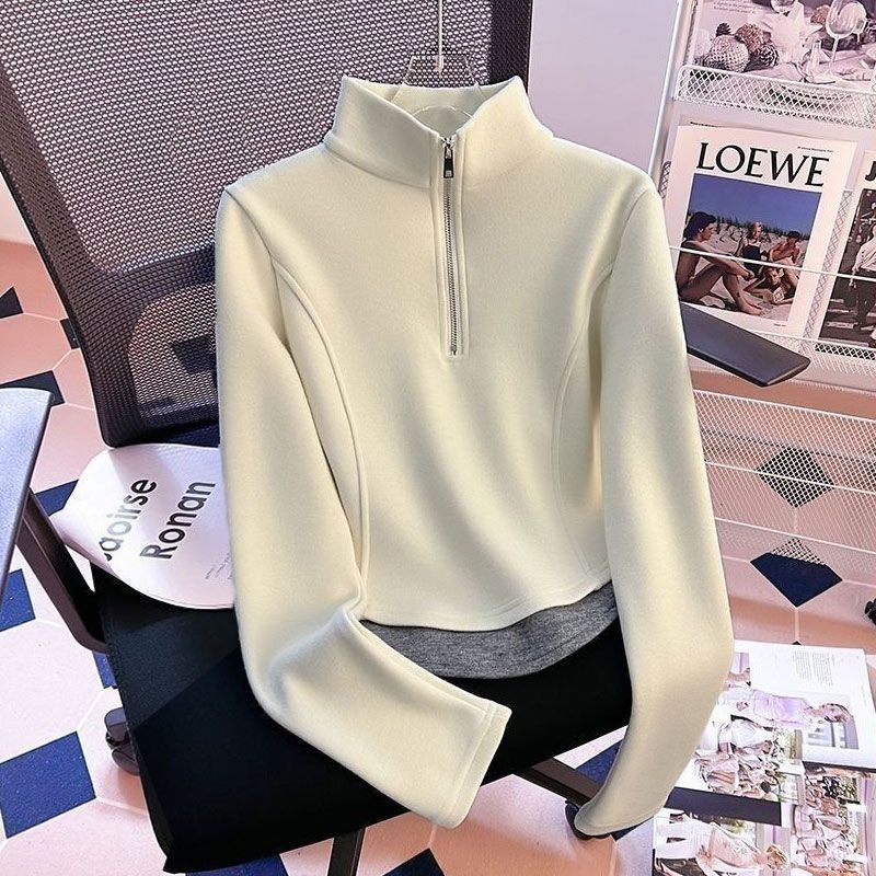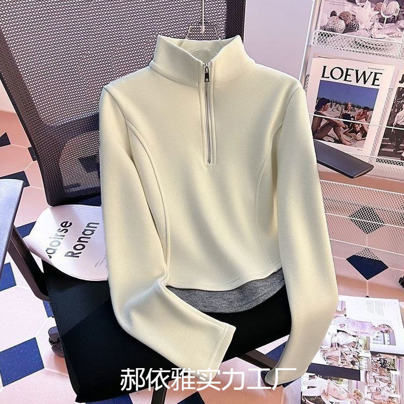 潮流假两件ins长袖上衣加厚保暖秋季德绒弧形下摆T恤衫女