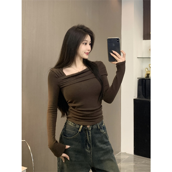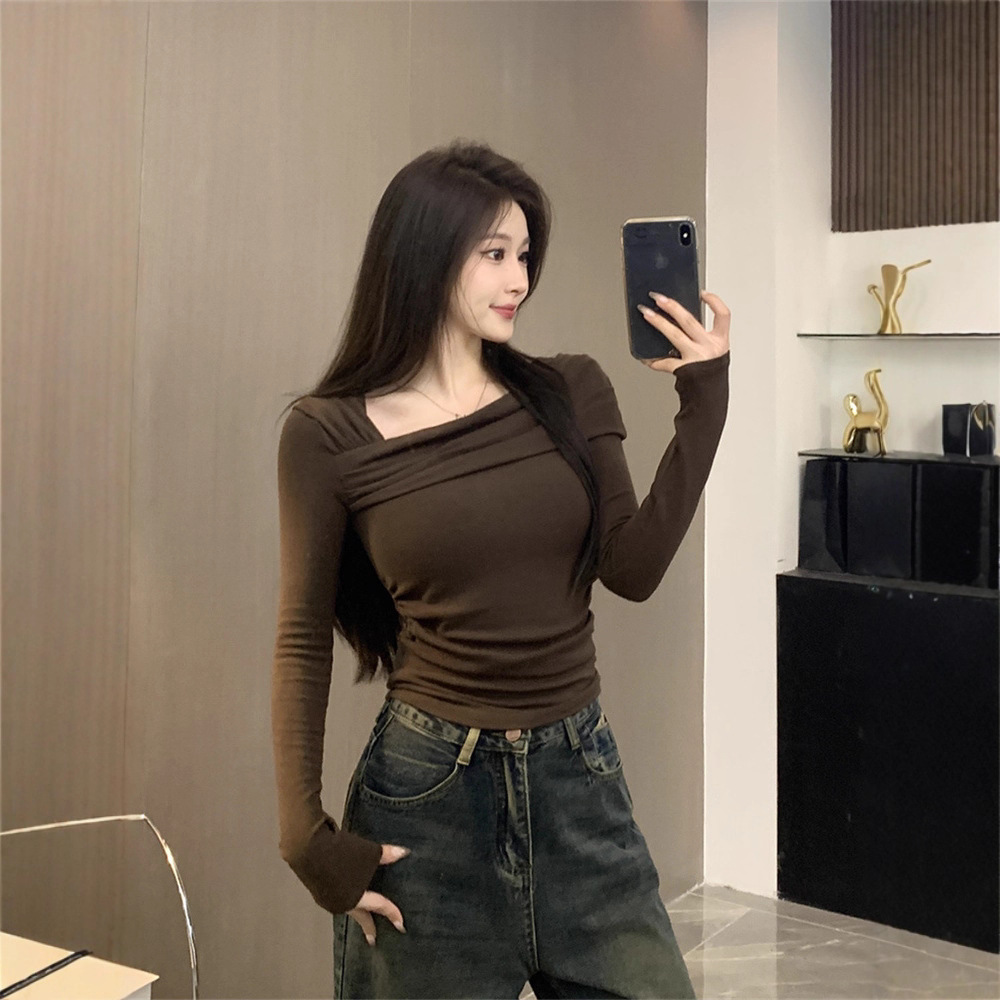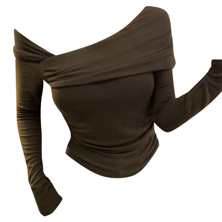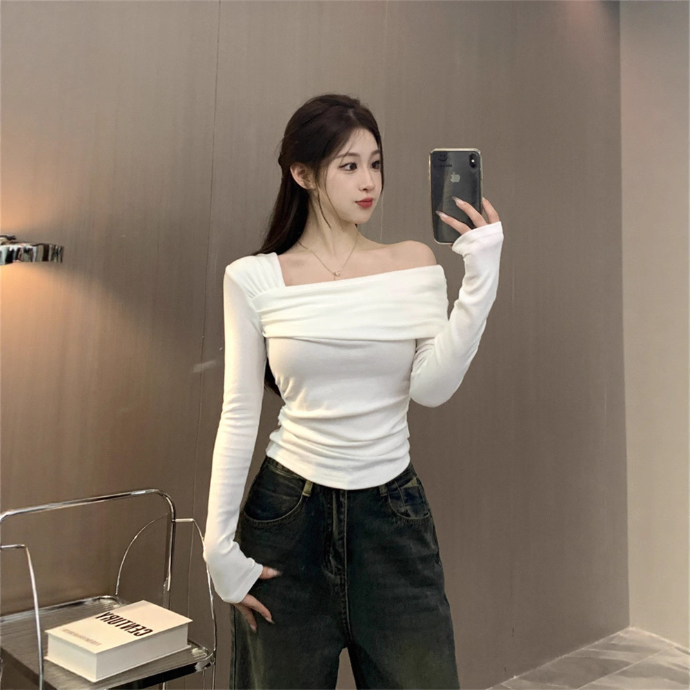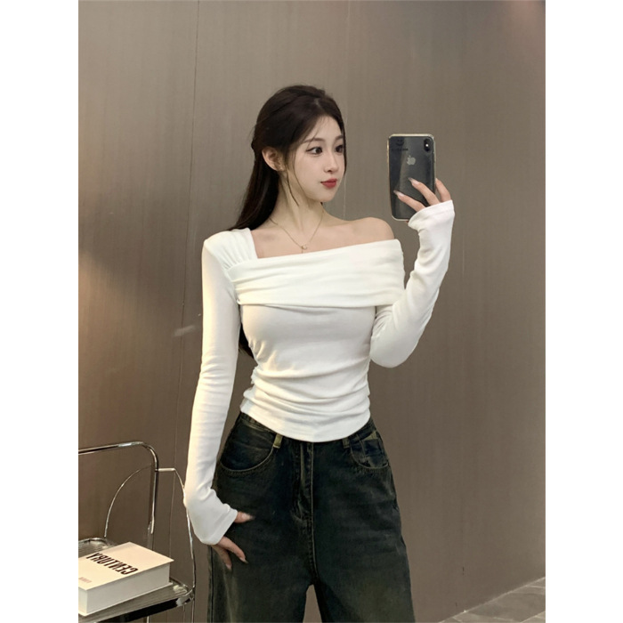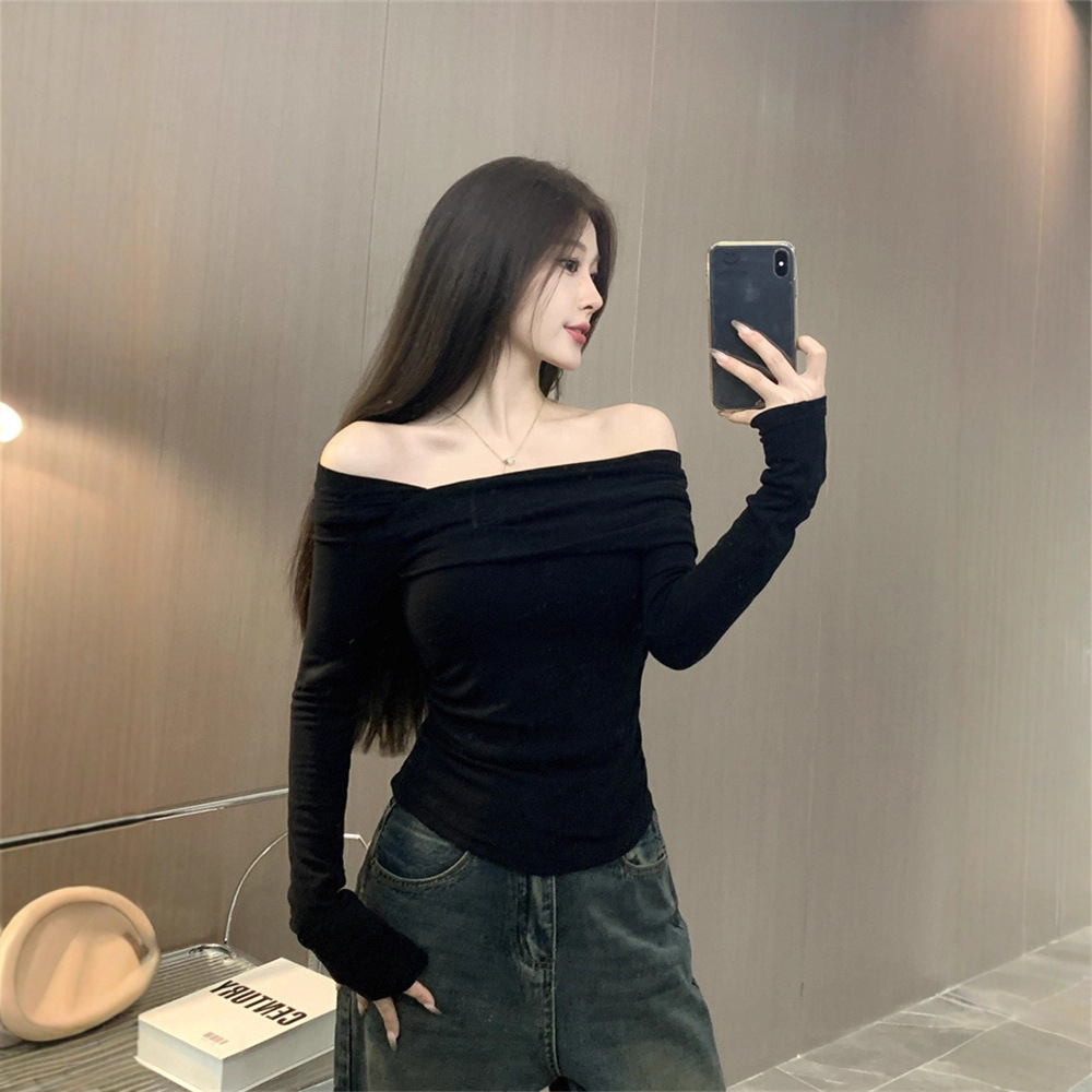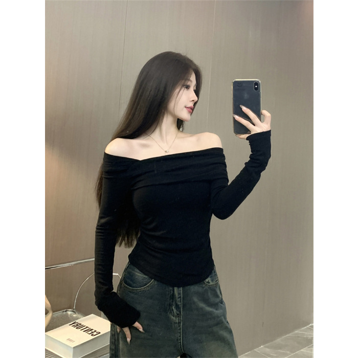 纯欲性感辣妹德绒长袖打底衫上衣女修身斜领一字肩T恤2025秋冬潮