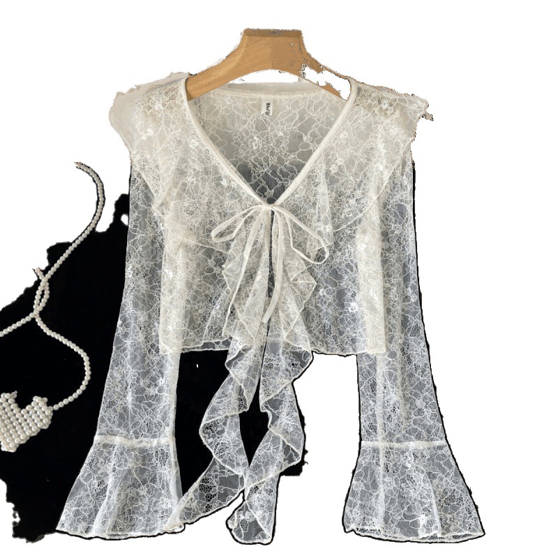 甜美小清新喇叭袖系带蕾丝开衫女夏季荷叶边薄款长袖防晒衣罩衫