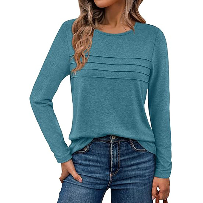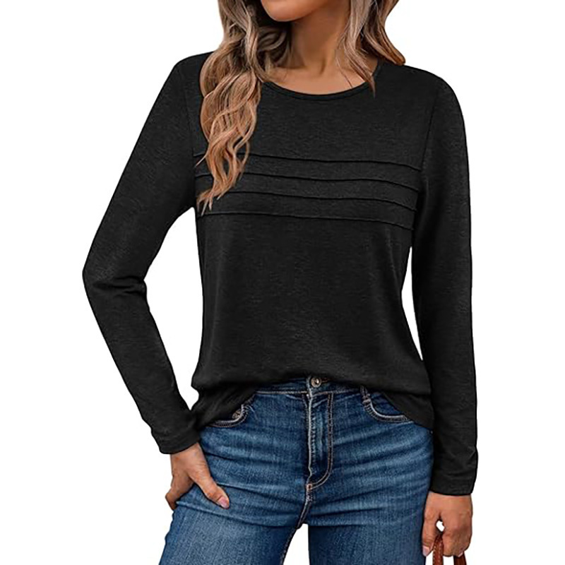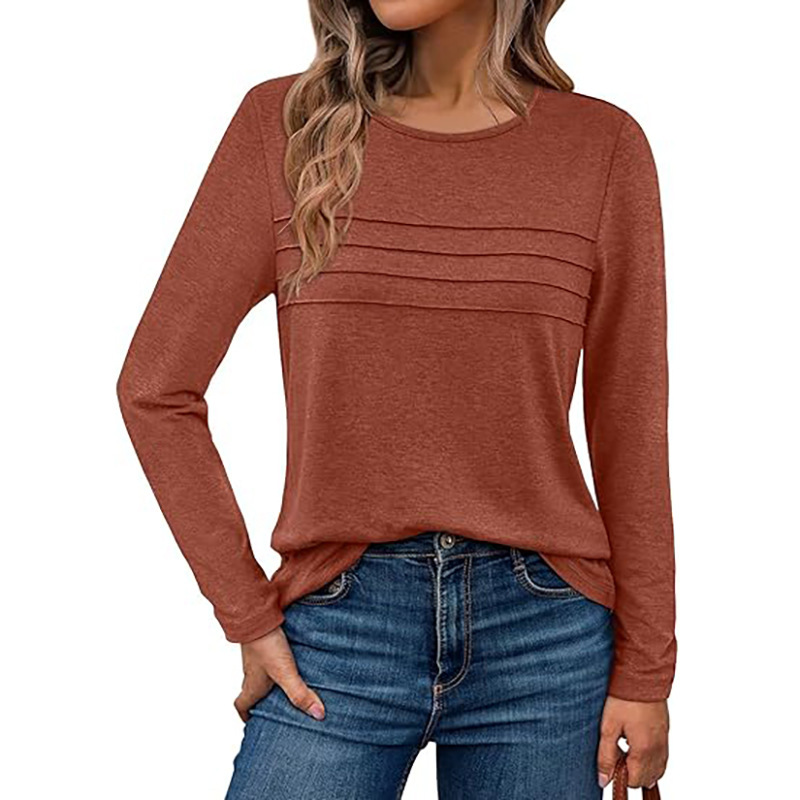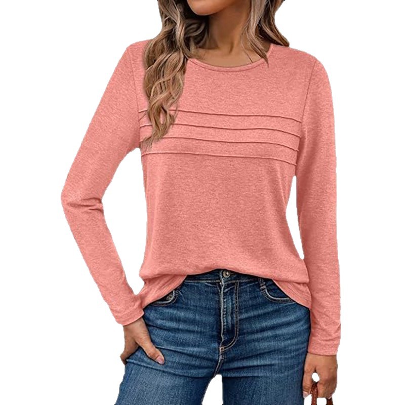 2025秋冬欧美跨境亚马逊女针织纯色圆领套头拉条褶皱长袖T恤上衣