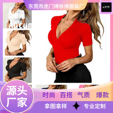 春季长袖女装T恤欧美女装2025跨境女式长袖针织V领上衣修身T恤女