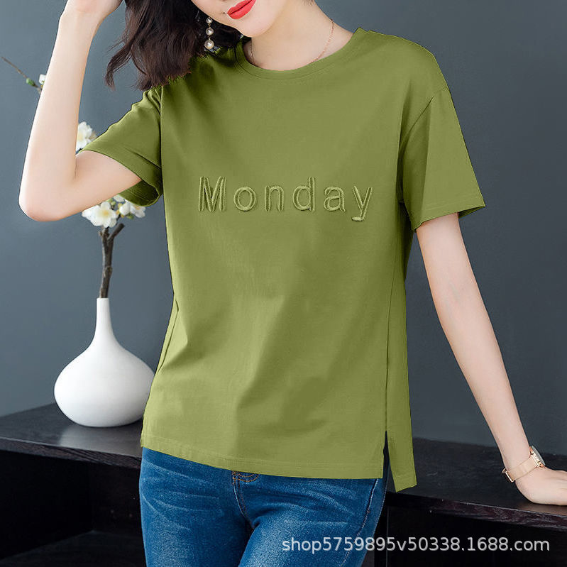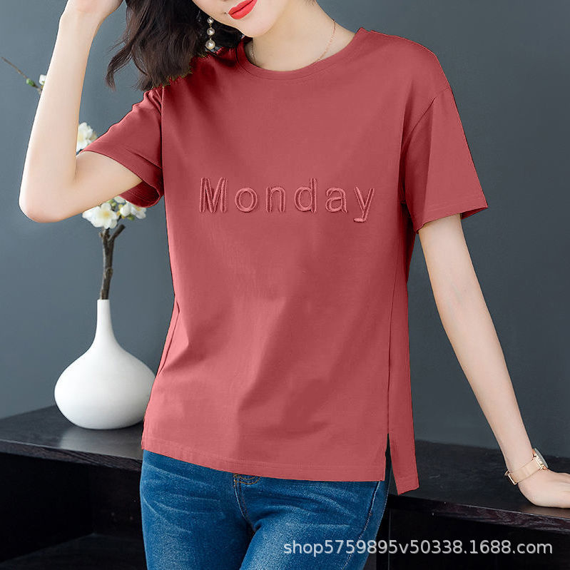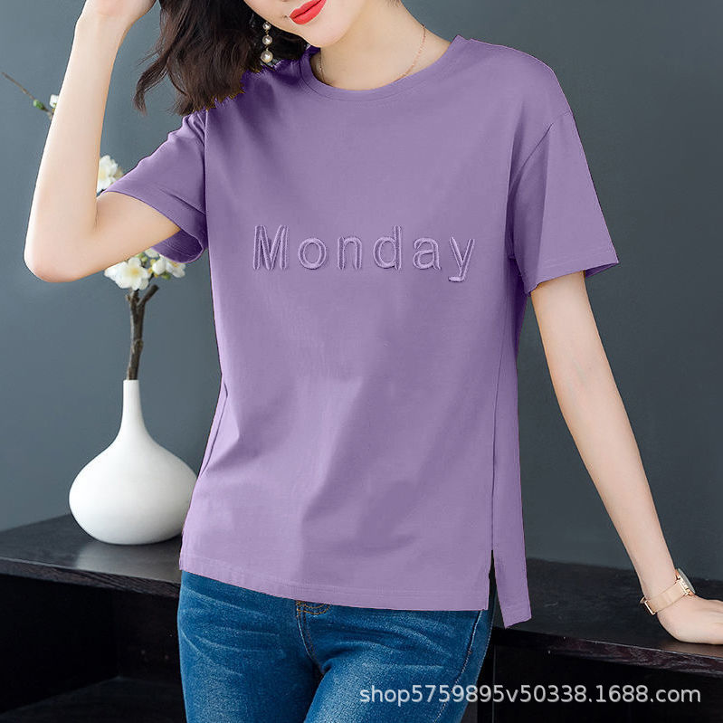 春夏季韩版新款大码女装短袖t恤女刺绣开叉打底衫上衣女妈妈装潮