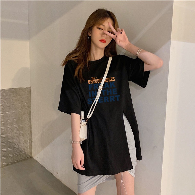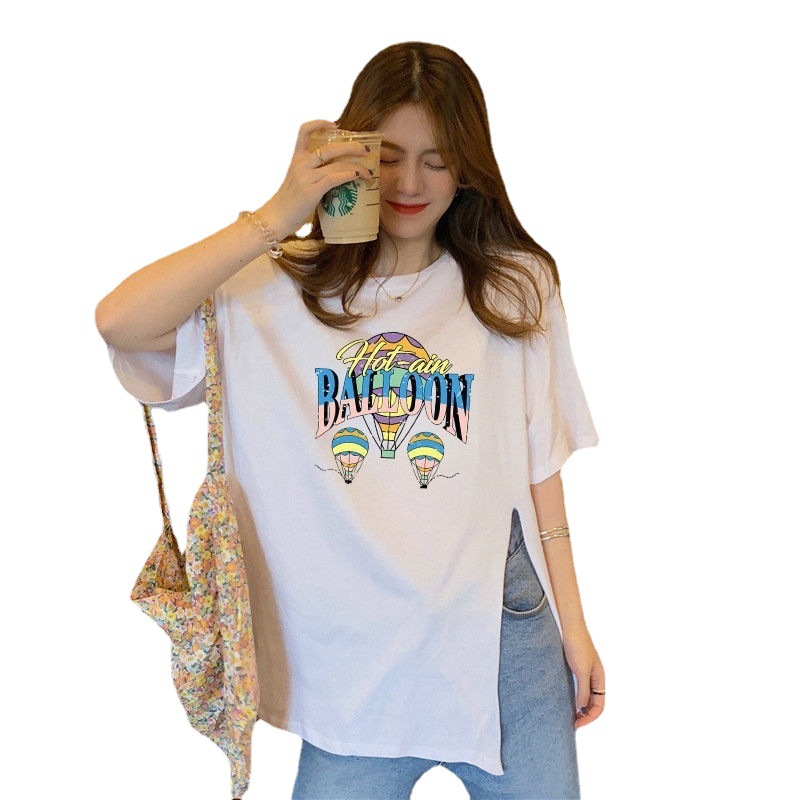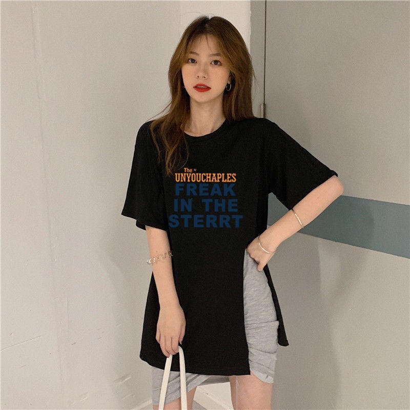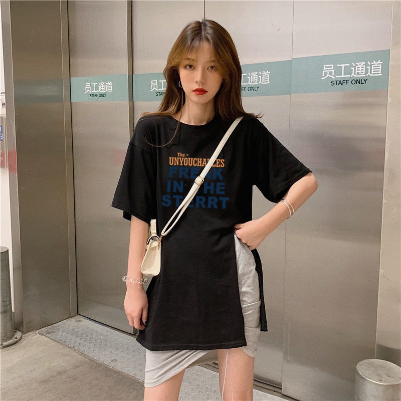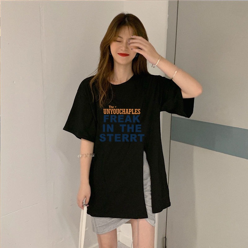 跨境批发女装短袖T恤女2025夏季新款侧边开叉宽松百搭休闲上衣潮