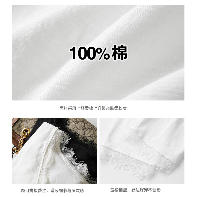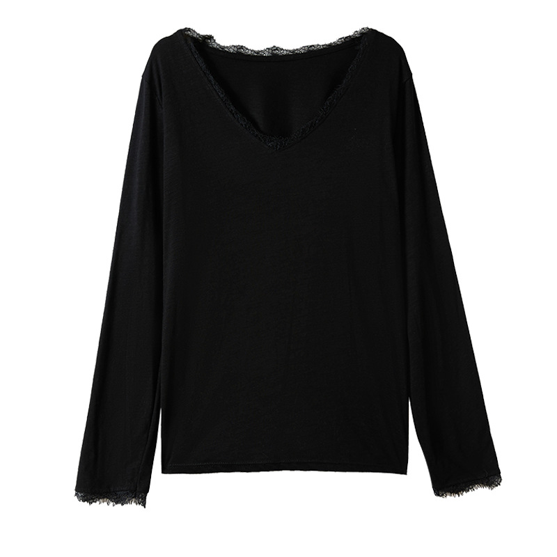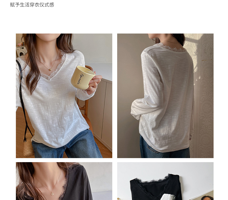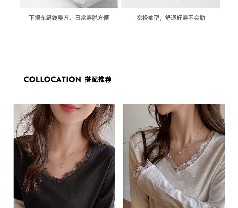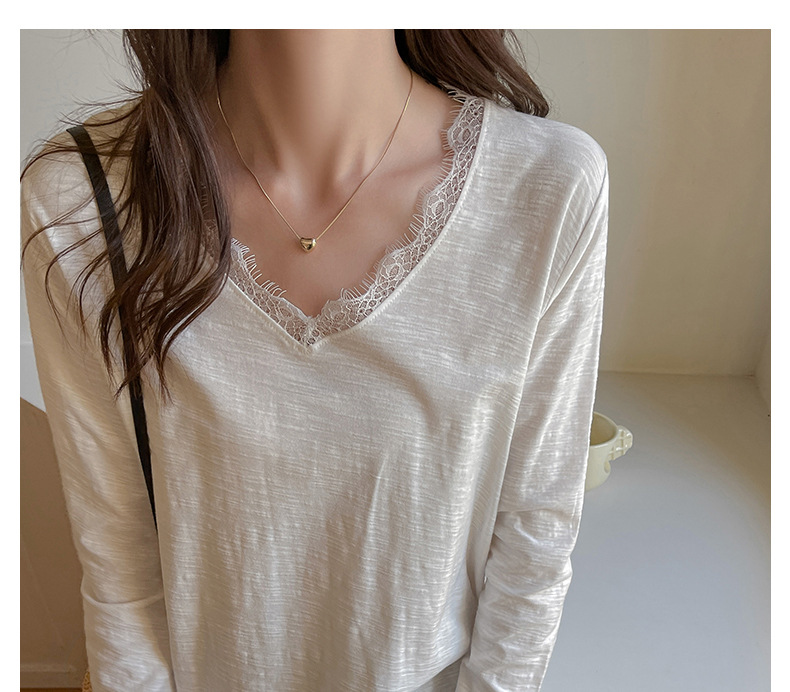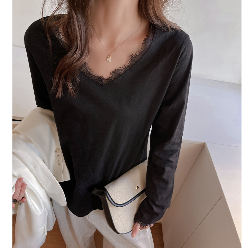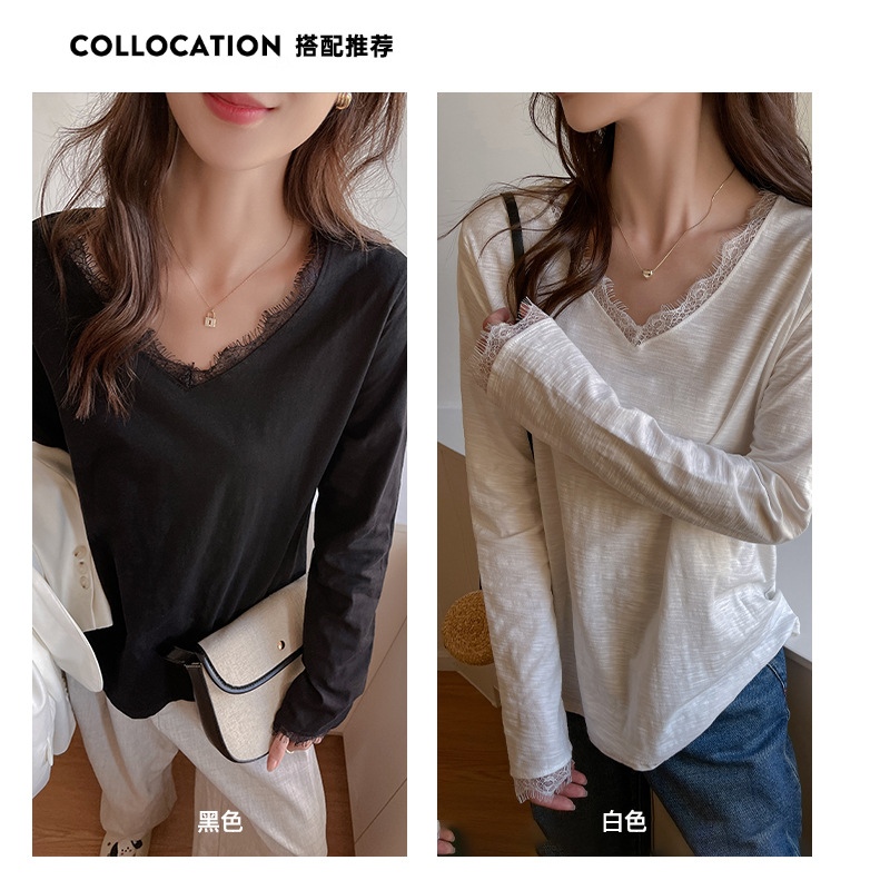 100%纯棉v领蕾丝宽松版正肩t恤女秋冬慵懒风高级感长袖打底衫上衣